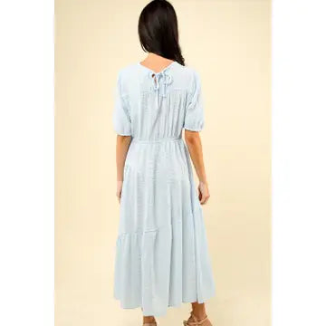The Baby Blue Midi features a textured design, complete with a flexible waistband, short sleeves, and a back tie for added detail.