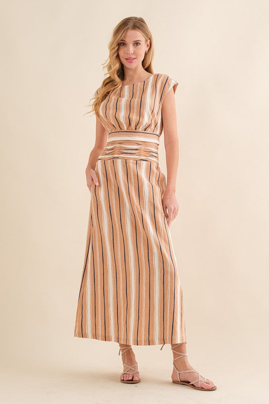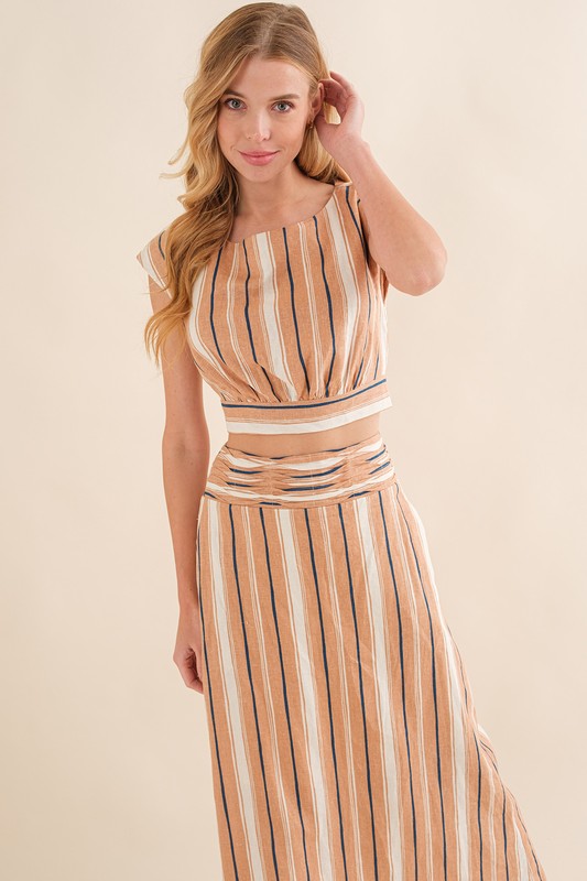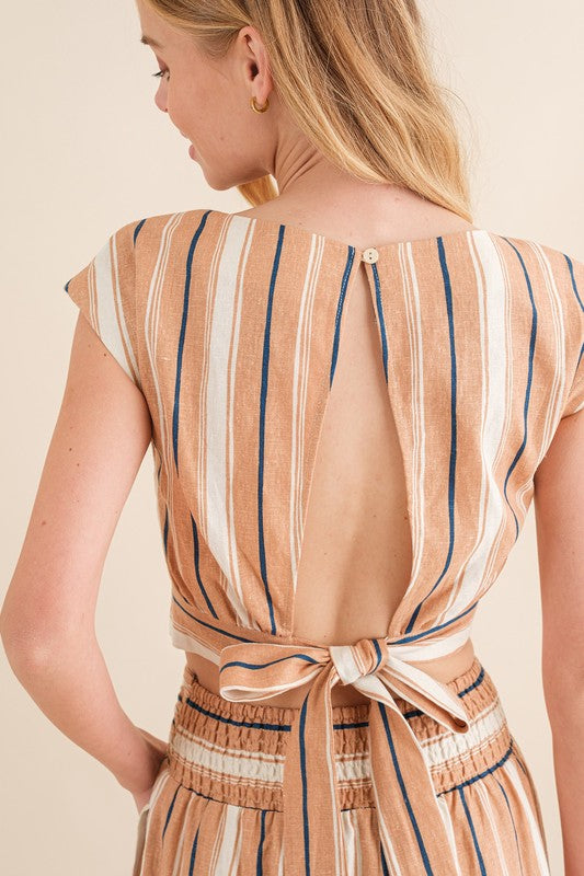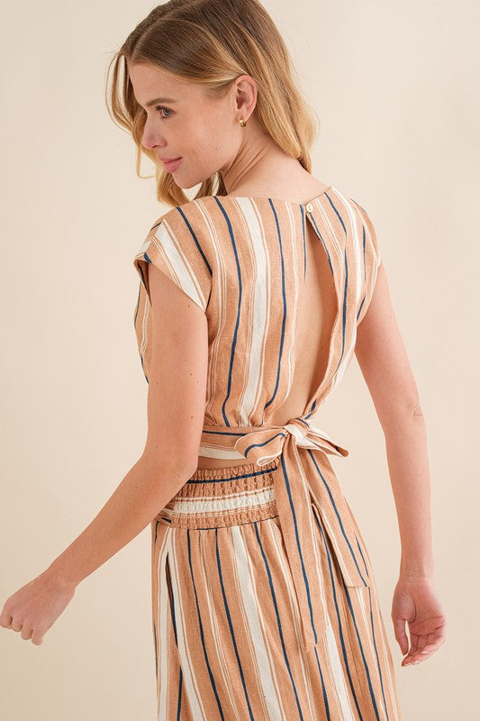 Made from luxurious linen, this cropped top features a cap sleeves and an open back with a tie closure. Matching maxi skirt with pockets is sold separately.