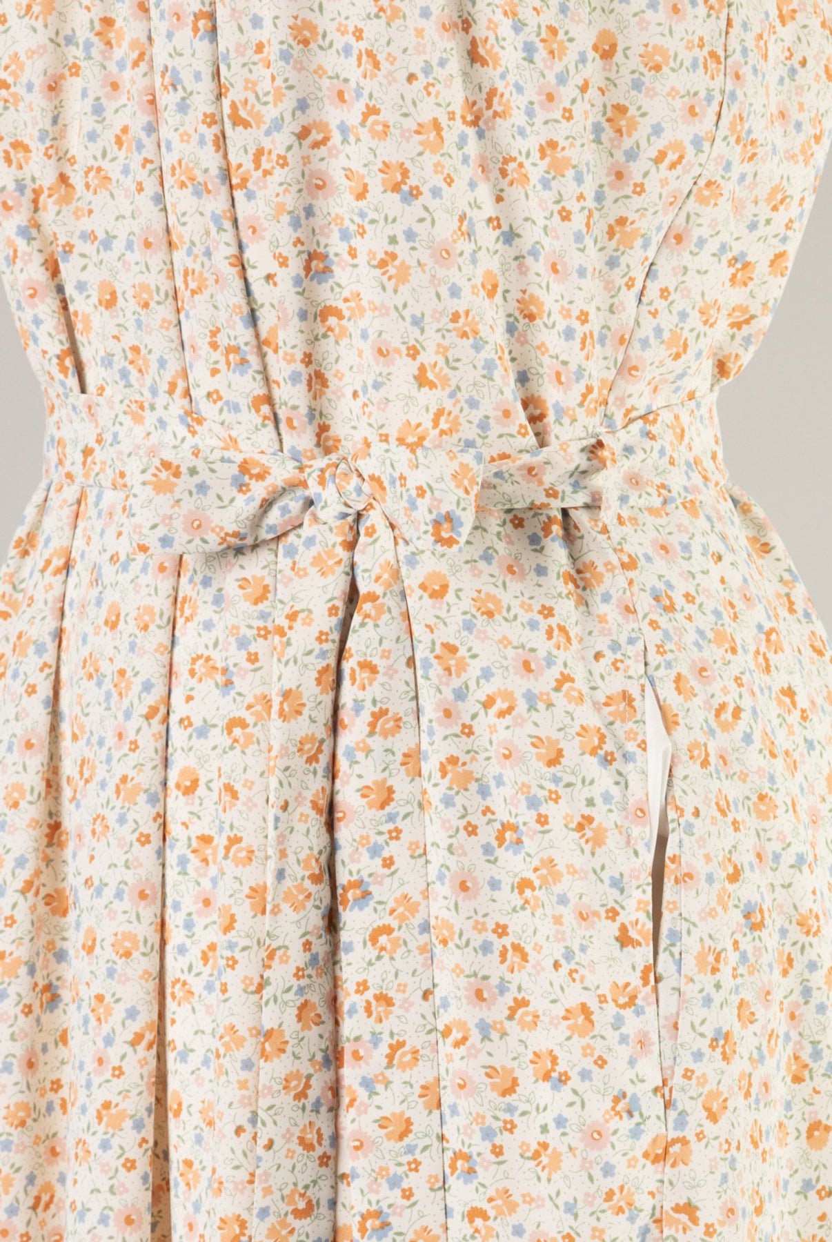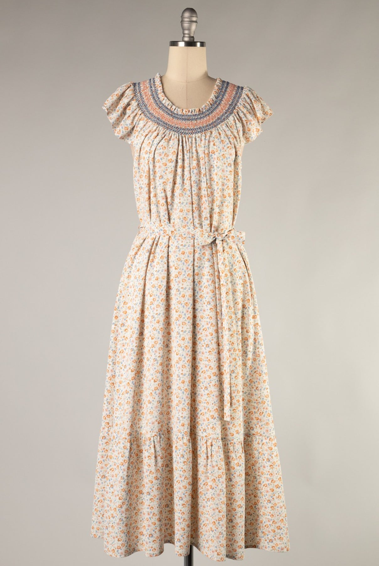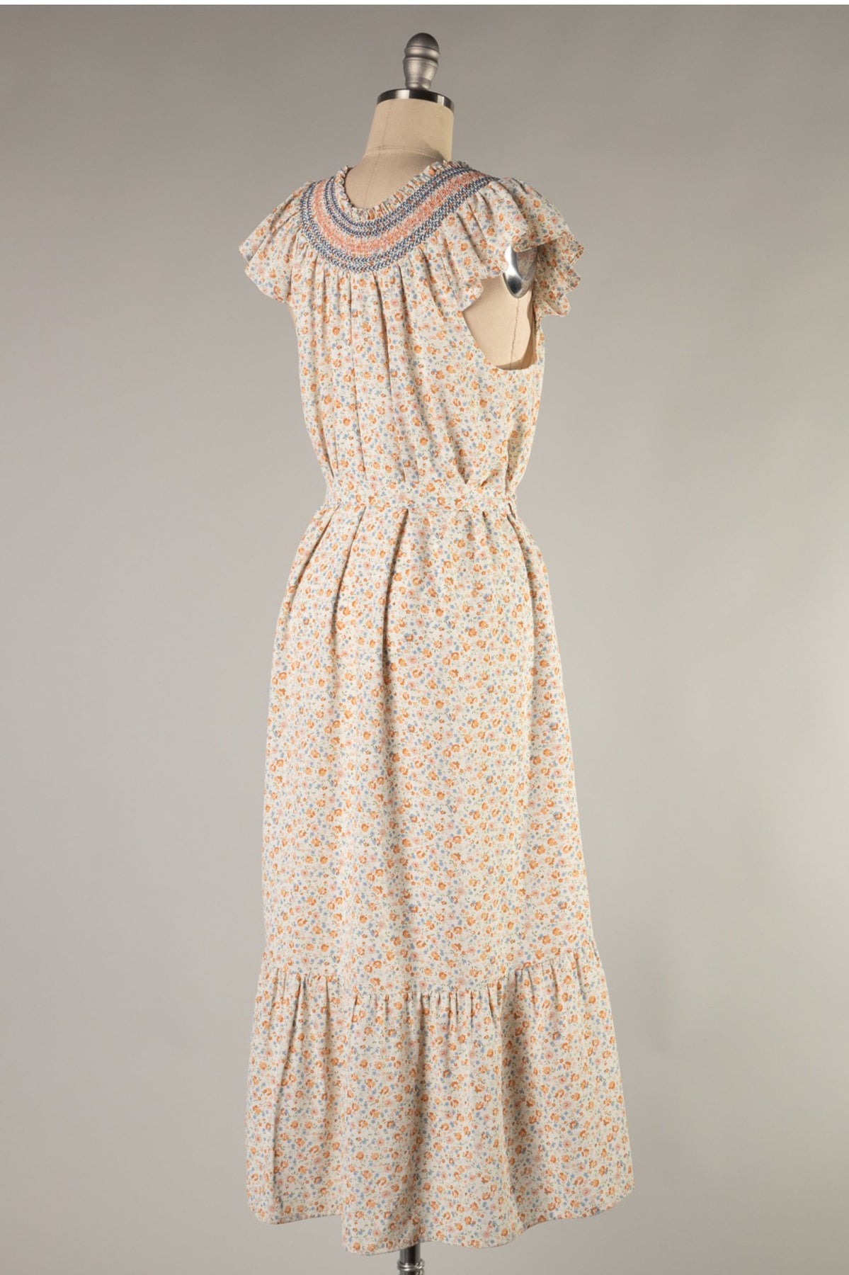 Elegant floral midi featuring an intricately embroidered collar, ruffled sleeves, and a stylish tie belt.