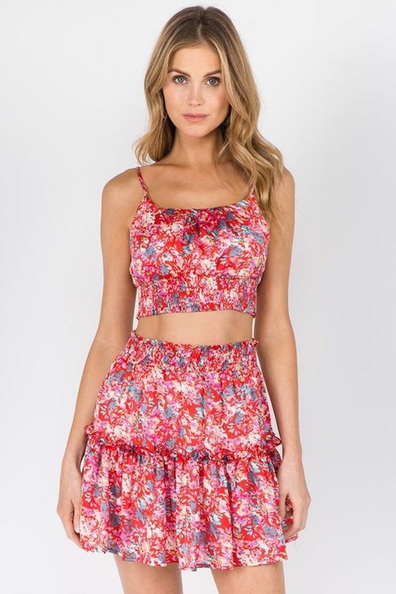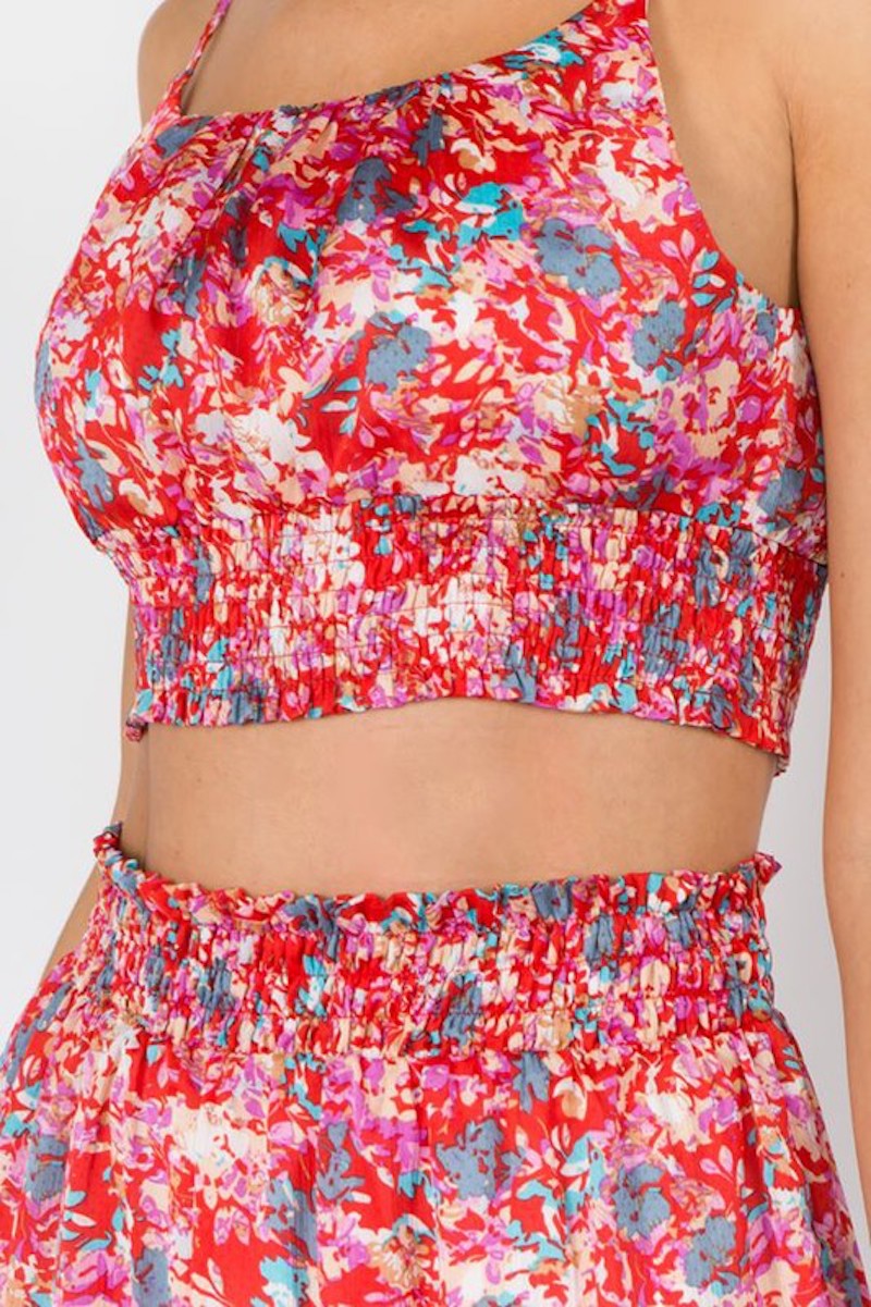 Michelle's Red print Crop Top features elastic bottom, smocked back and adjustable straps. Pair with shorts, pants, or a skirt. Print also available in dress.