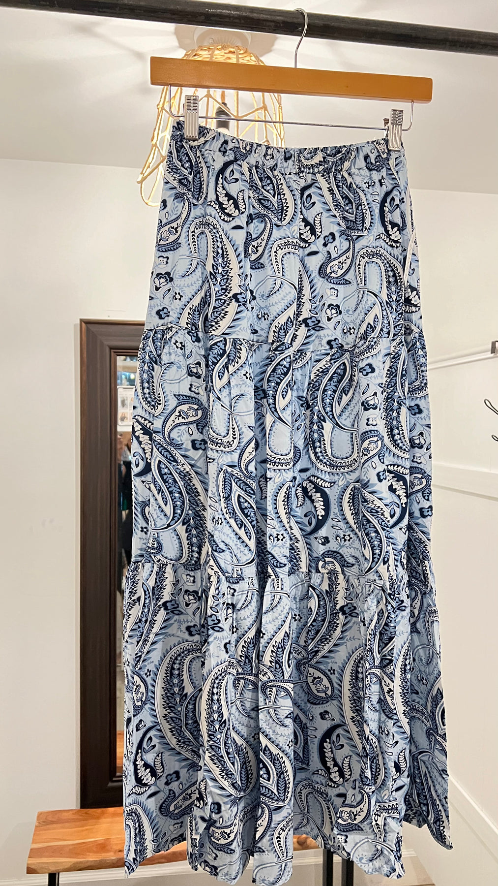 Blue paisley printed layered maxi skirt with elastic waistband and lining.