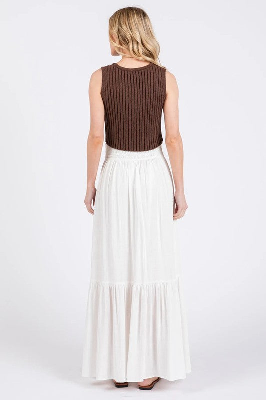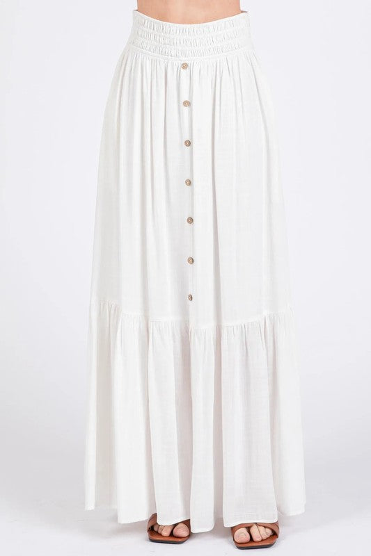 The Coastal Breeze Maxi Skirt is your go-to for effortless summer styling. Designed in a fresh white hue, it features a smocked elastic waistband for a flattering fit and a relaxed tiered silhouette that moves beautifully with every step. Decorative buttons add a charming touch, while the lightweight fabric keeps you cool and comfortable all day long. Style it with a simple tank or a flowy blouse for a feminine, laid-back look.