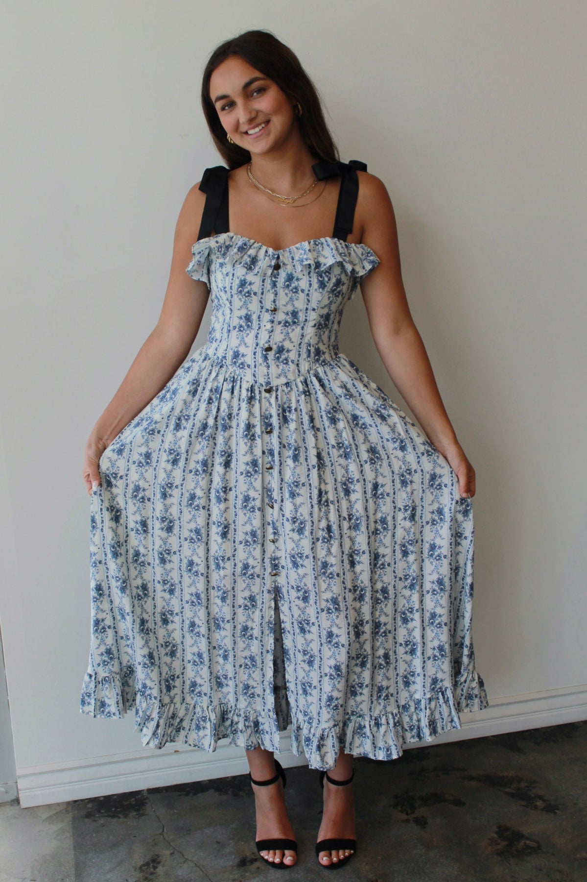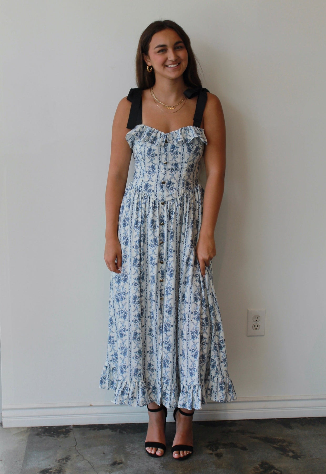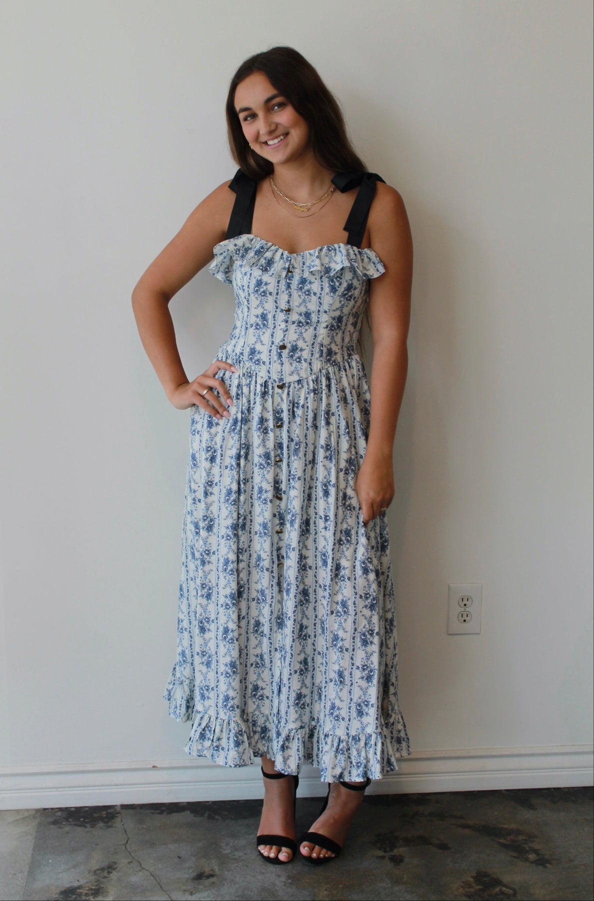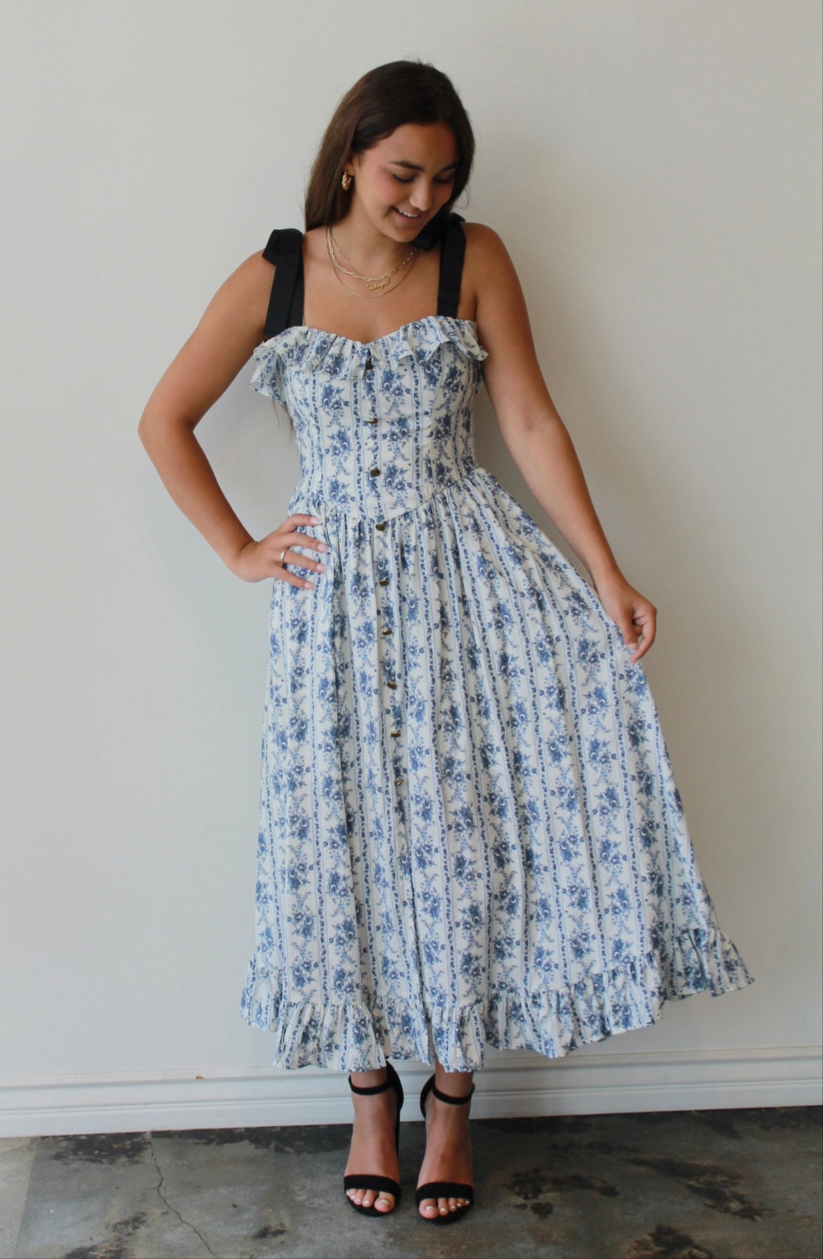 Channel countryside charm with the Blue Belle Dress, a vintage-inspired midi that’s effortlessly romantic. This dress features a delicate blue floral print on a soft white backdrop, accented by a button-down front and feminine ruffle hem. The adjustable black tie straps add a playful, customizable touch, while the smocked back ensures a comfortable, flattering fit. Style it with boots and a wide-brim hat for a western chic moment or pair it with sandals for a sweet spring day out.