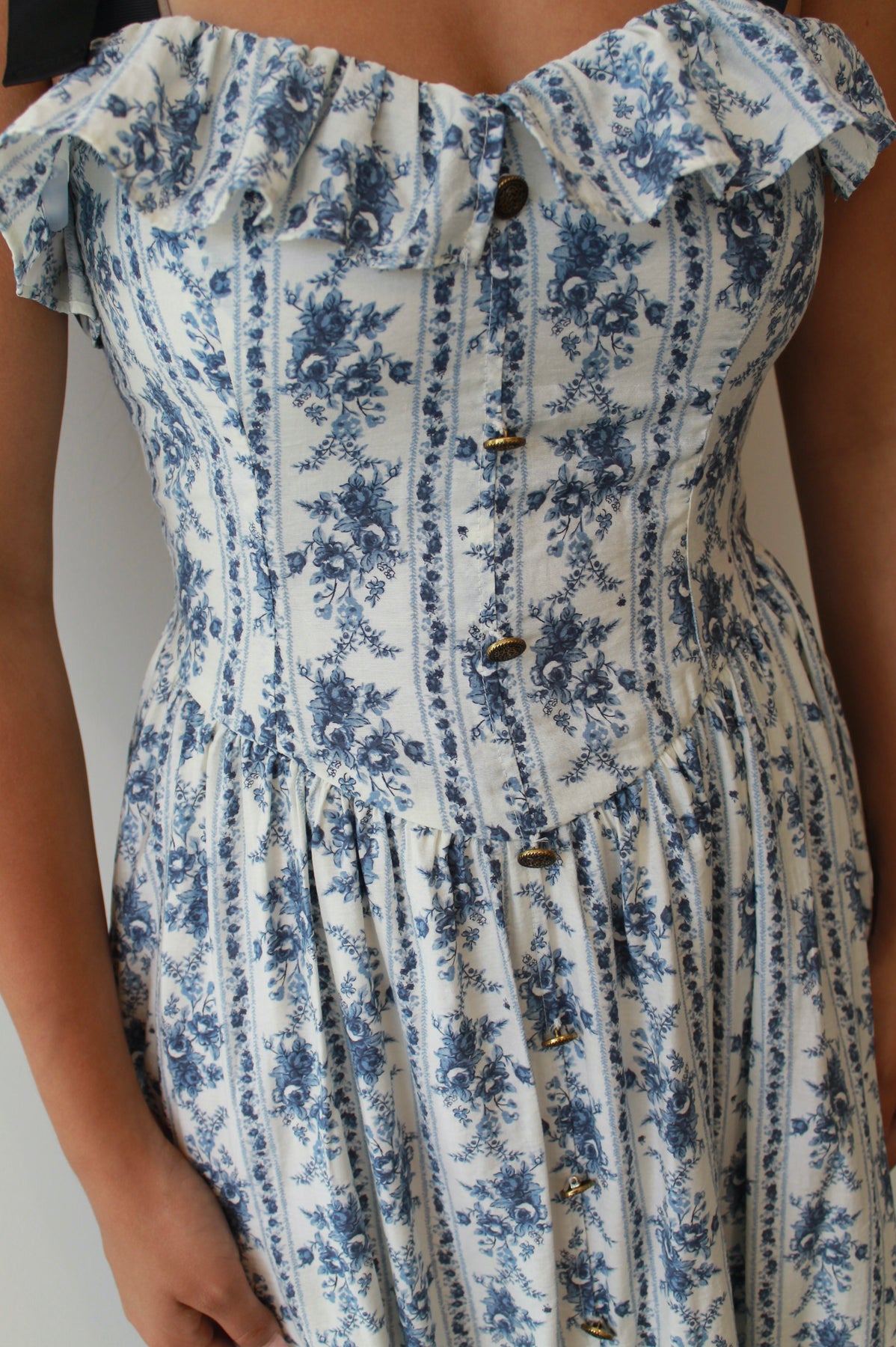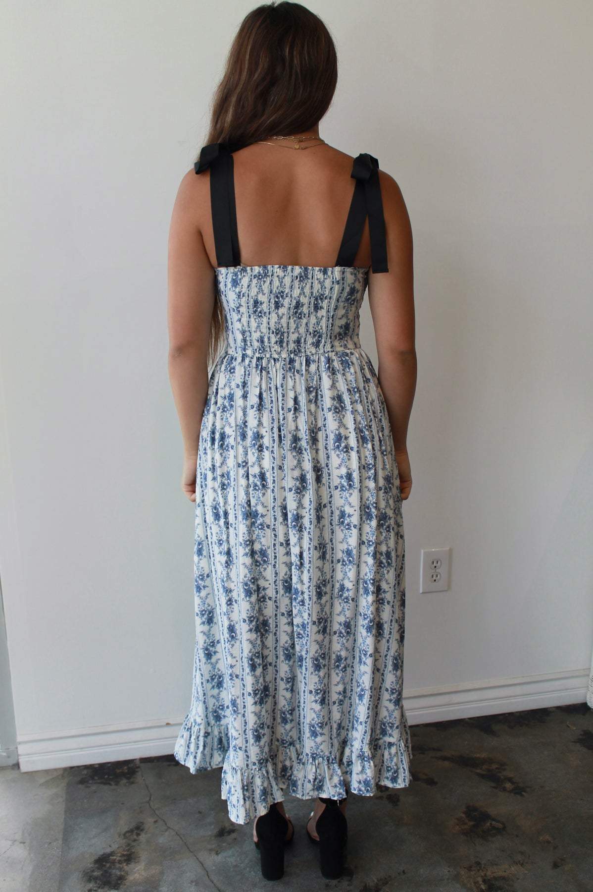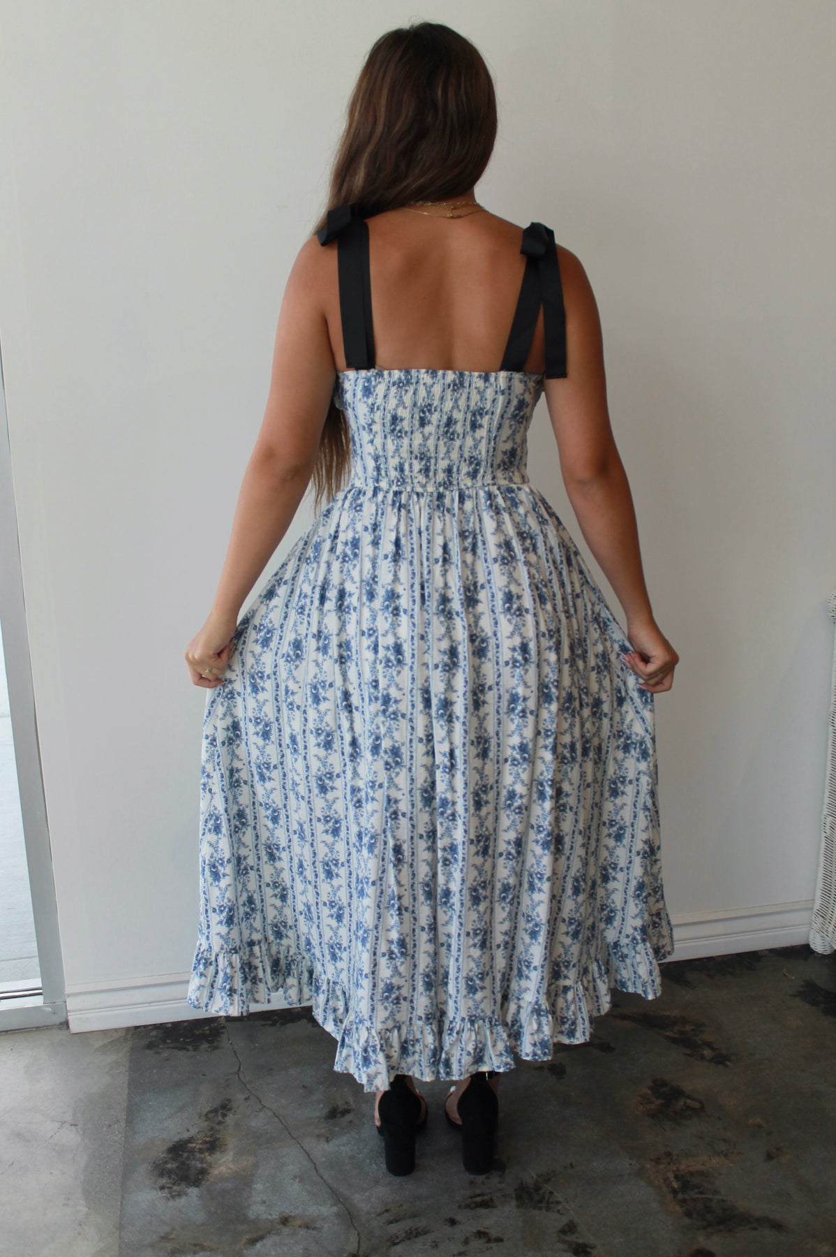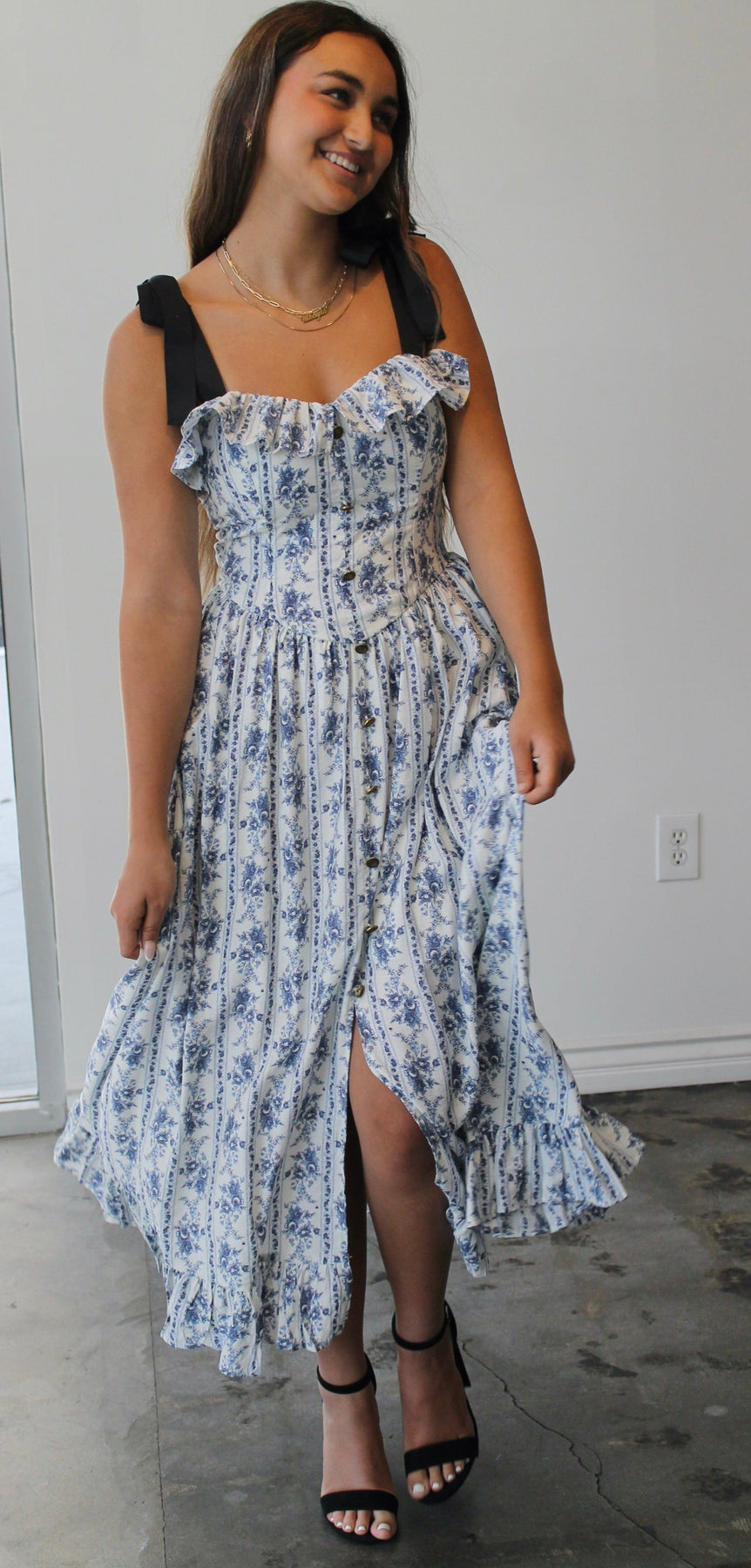 Channel countryside charm with the Blue Belle Dress, a vintage-inspired midi that’s effortlessly romantic. This dress features a delicate blue floral print on a soft white backdrop, accented by a button-down front and feminine ruffle hem. The adjustable black tie straps add a playful, customizable touch, while the smocked back ensures a comfortable, flattering fit. Style it with boots and a wide-brim hat for a western chic moment or pair it with sandals for a sweet spring day out.