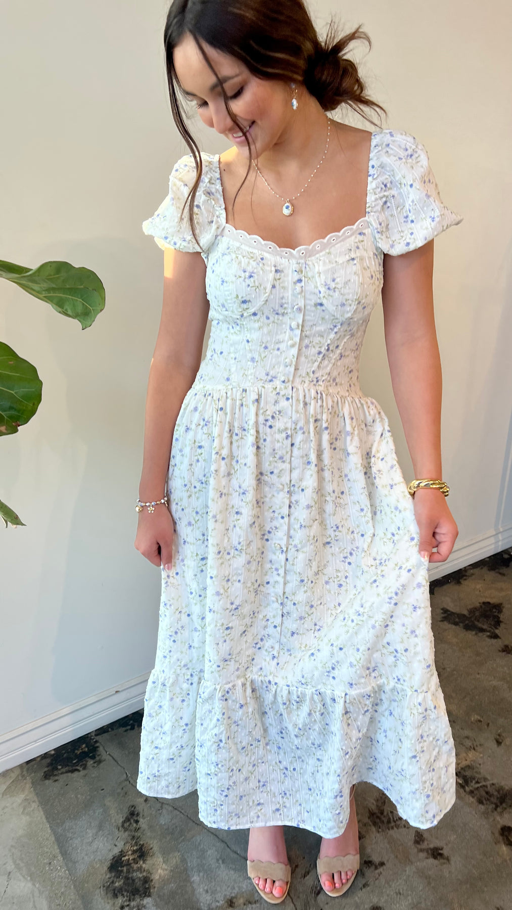 Delicate, dreamy, and oh-so-feminine — the Bluebell Meadow Midi Dress is made for twirling through sunlit days and soft garden strolls. This ivory floral midi features a flattering sweetheart neckline trimmed with dainty scalloped lace, soft puff sleeves, and a smocked back for a comfortable fit. The allover bluebell-inspired floral print and tiered hem add charm and vintage-inspired detail to this cottagecore favorite.