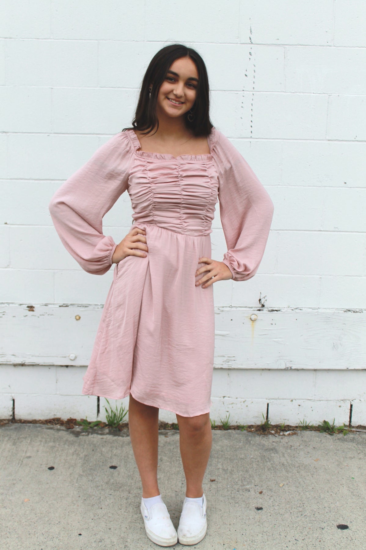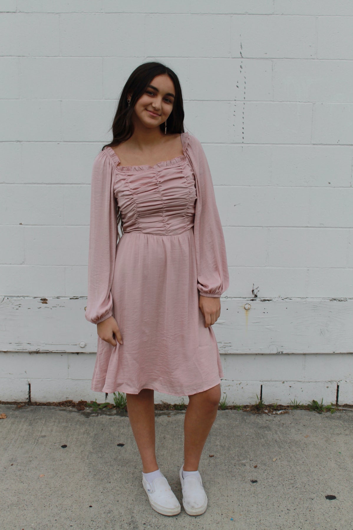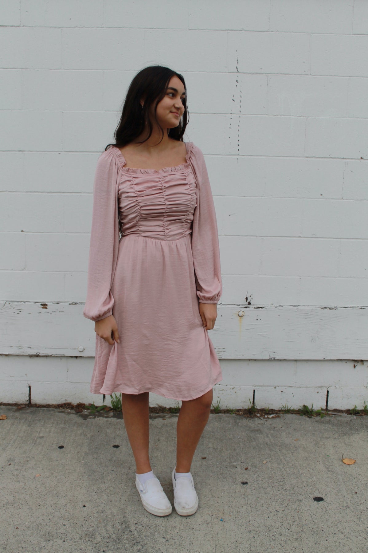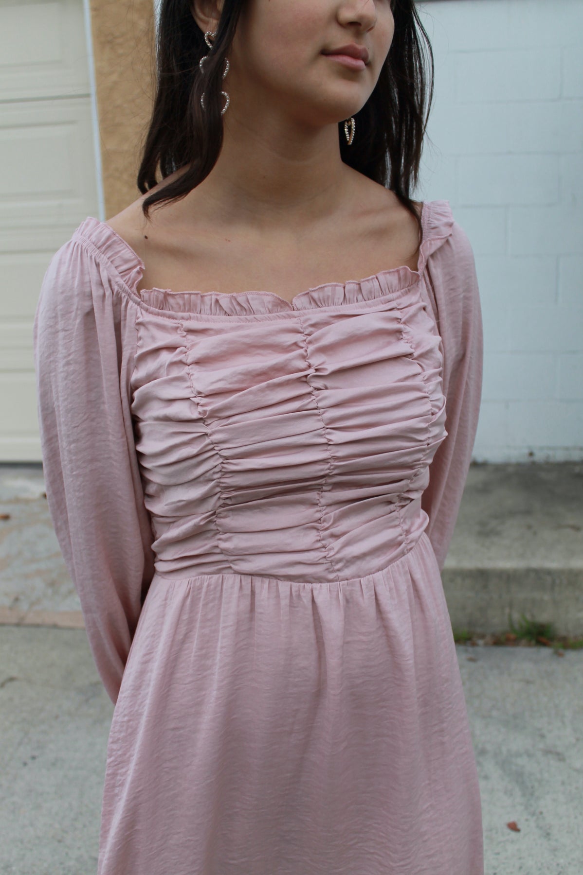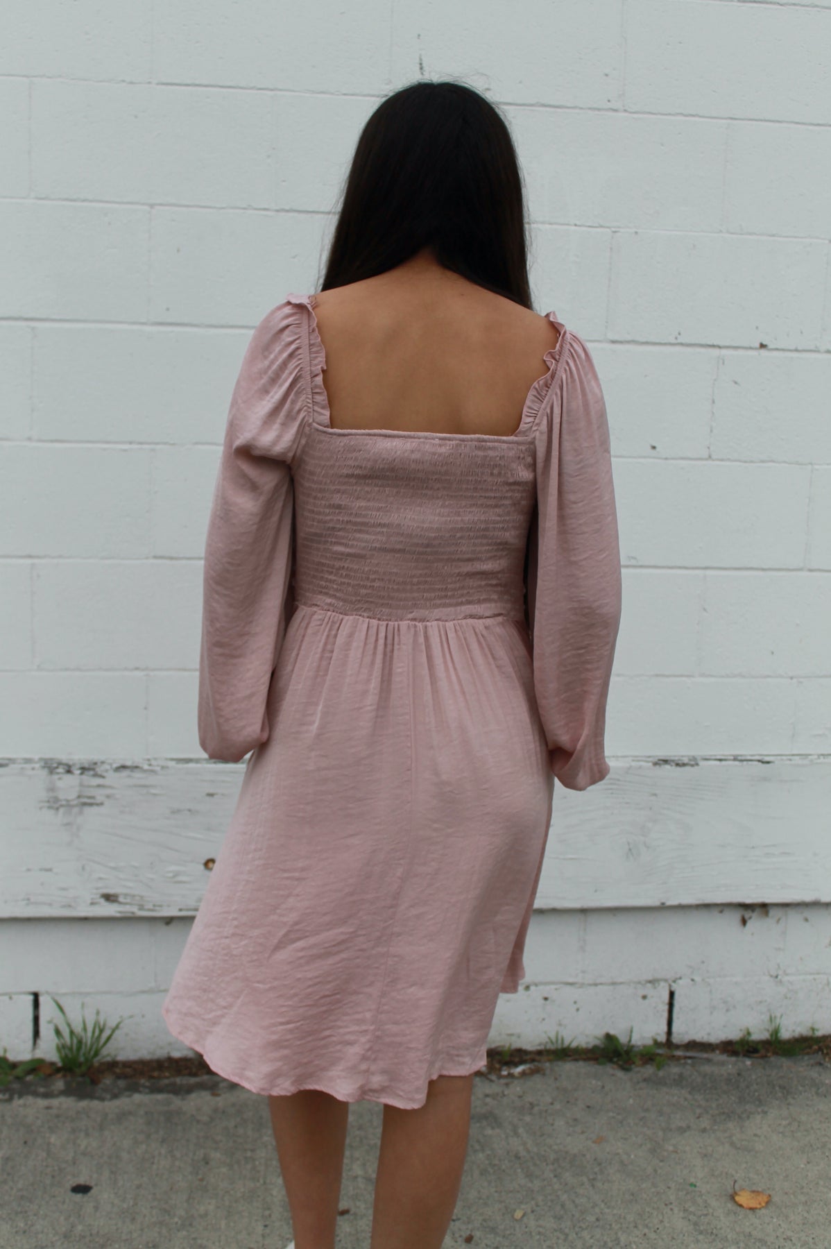 Blush or light pink knee length dress front top scrunched ruffled detail, pockets, smocked stretchy back, and long flowy sleeves. Fully lined.