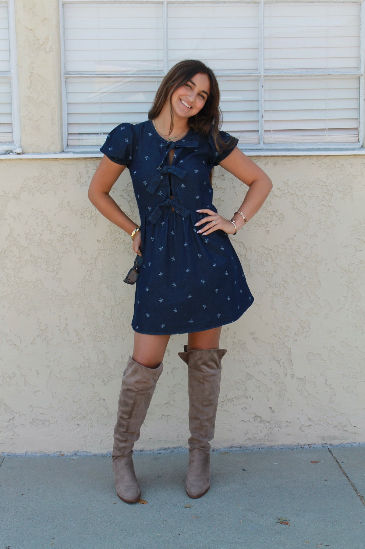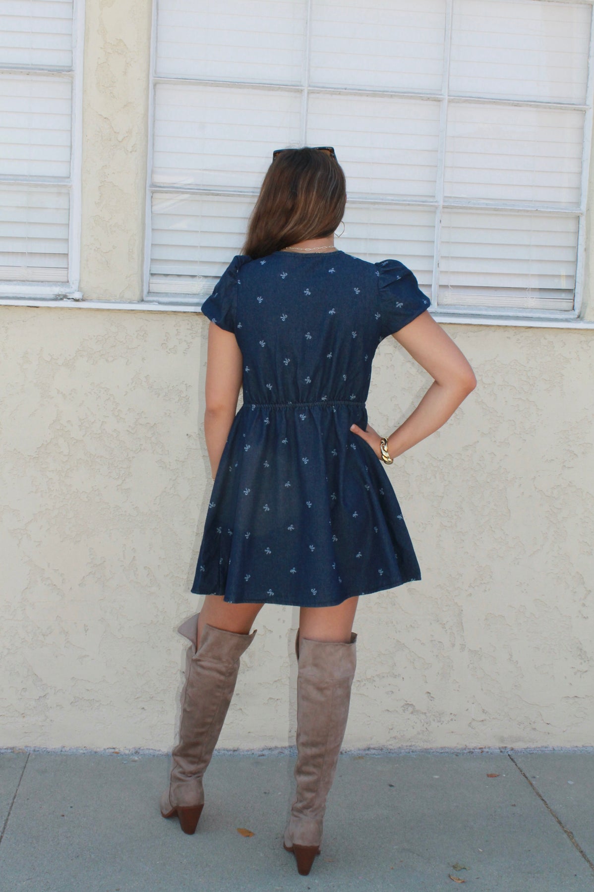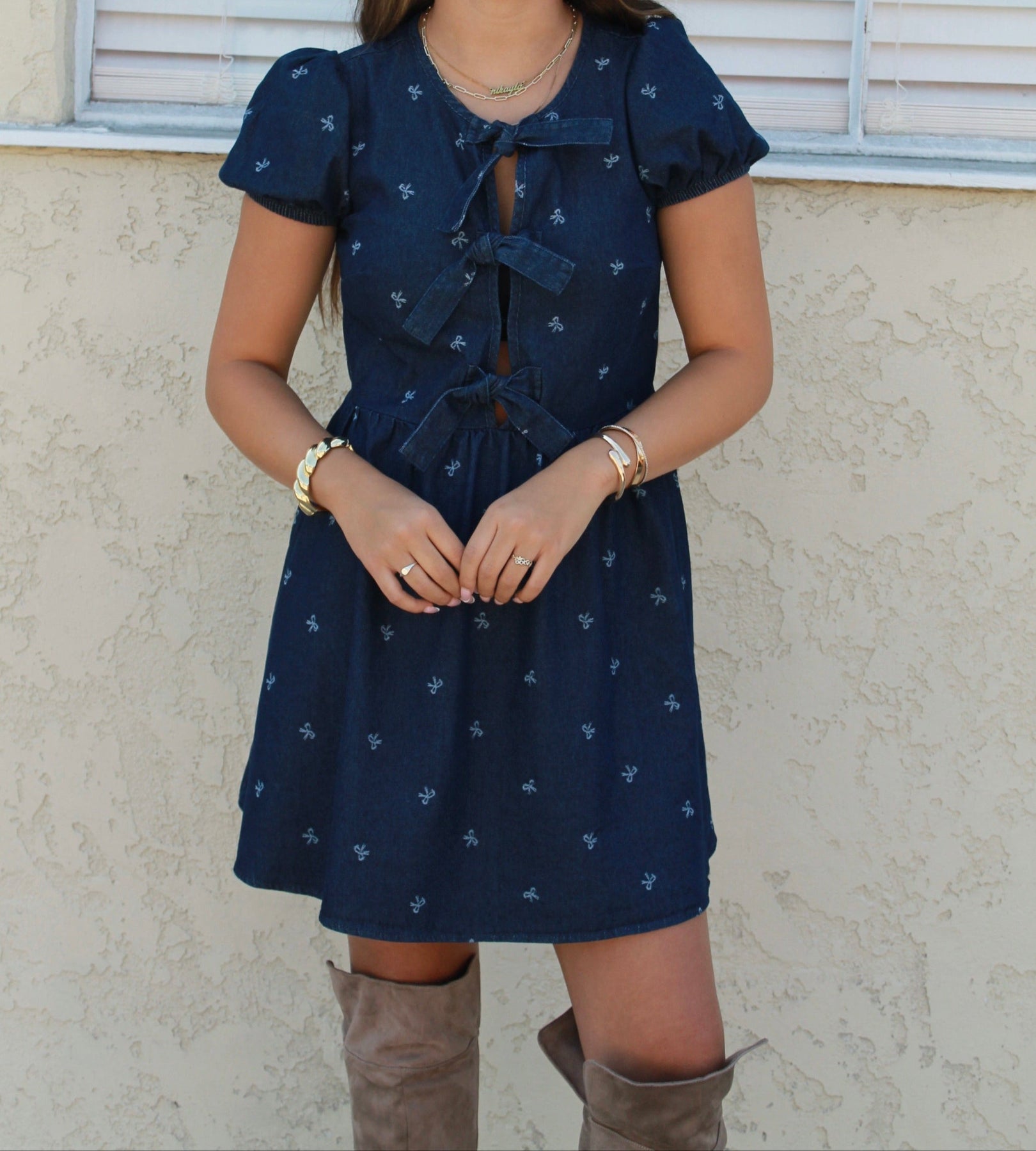 Meet your new countryside daydream— Bow's Denim Dress. Crafted from embroidered denim, this darling mini dress features three charming bow tie details down the front, puffed short sleeves, and a softly cinched waist for a flattering shape. The delicate bow embroidery and keyhole neckline add a vintage prairie feel, perfect for pairing with boots.