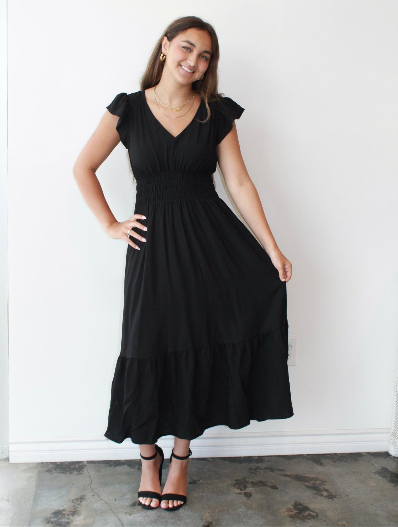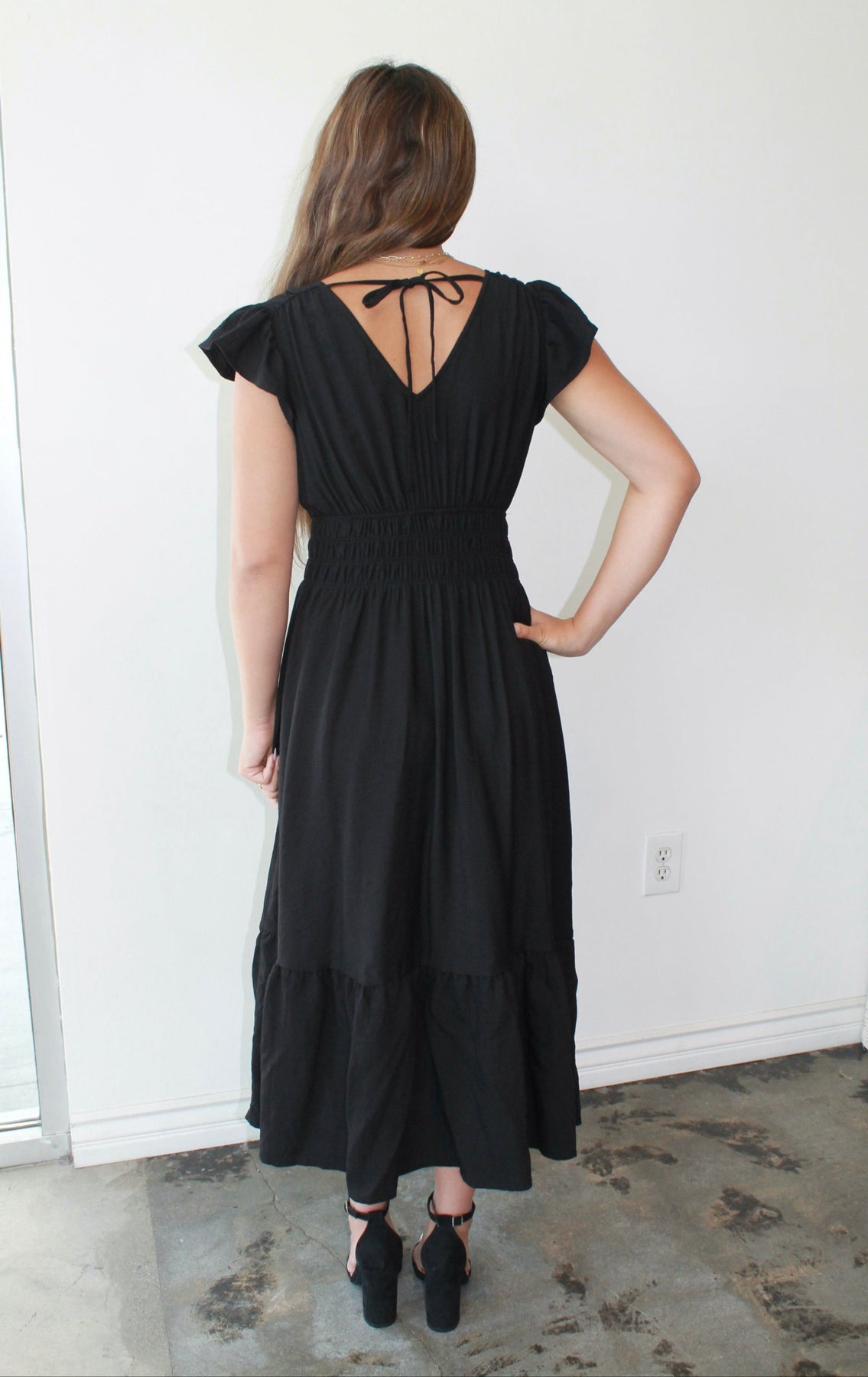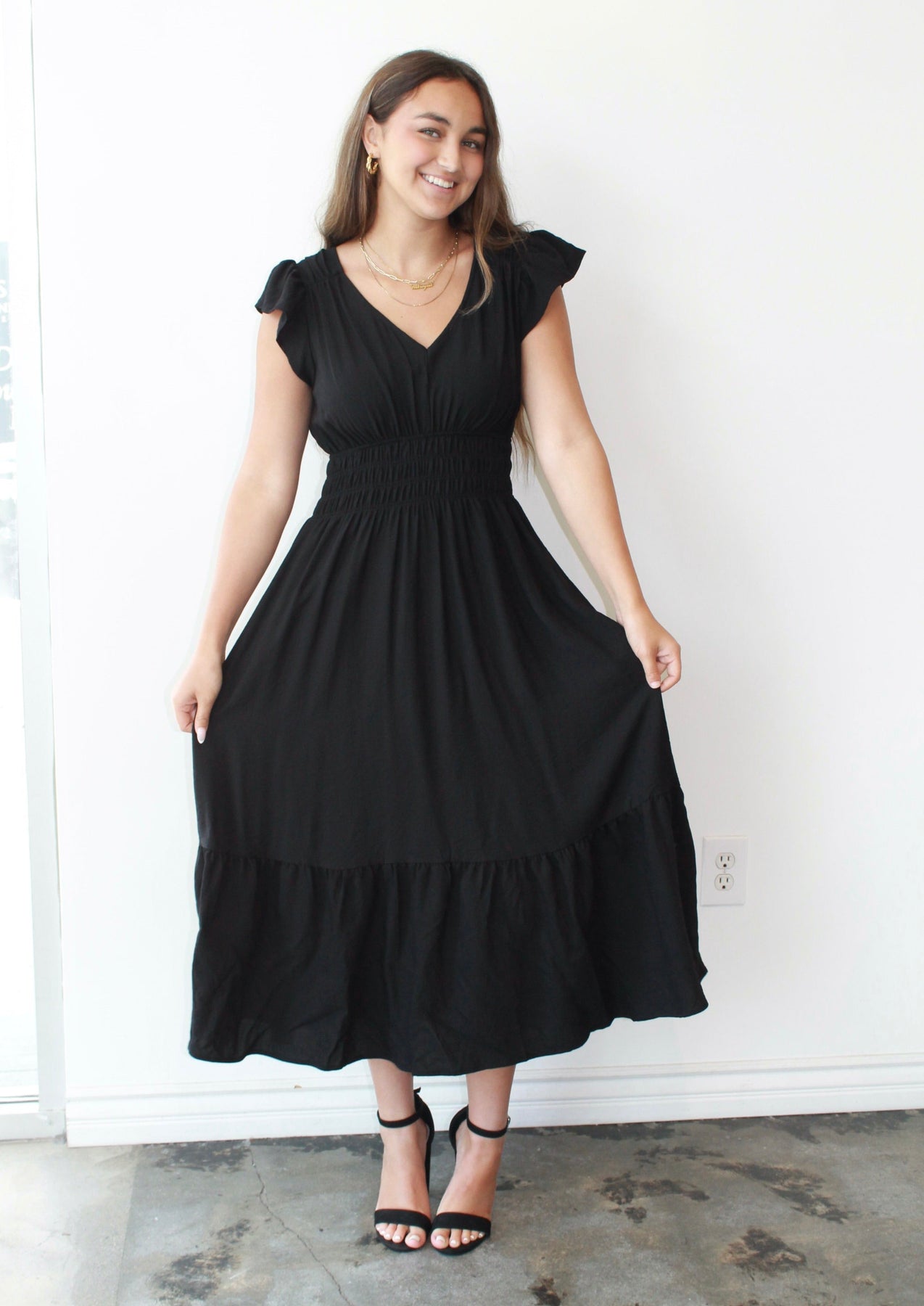 Timeless, flattering, and effortlessly feminine—Camille's Black Flutter Midi is the kind of dress you’ll reach for again and again. Designed with delicate flutter sleeves, a V-neckline, back tie strap, and a stretchy smocked waistband, this piece offers a figure-flattering fit that flows into a breezy, tiered midi-length skirt. Whether styled for dinner dates or casual days out, it’s a graceful staple that moves with you.