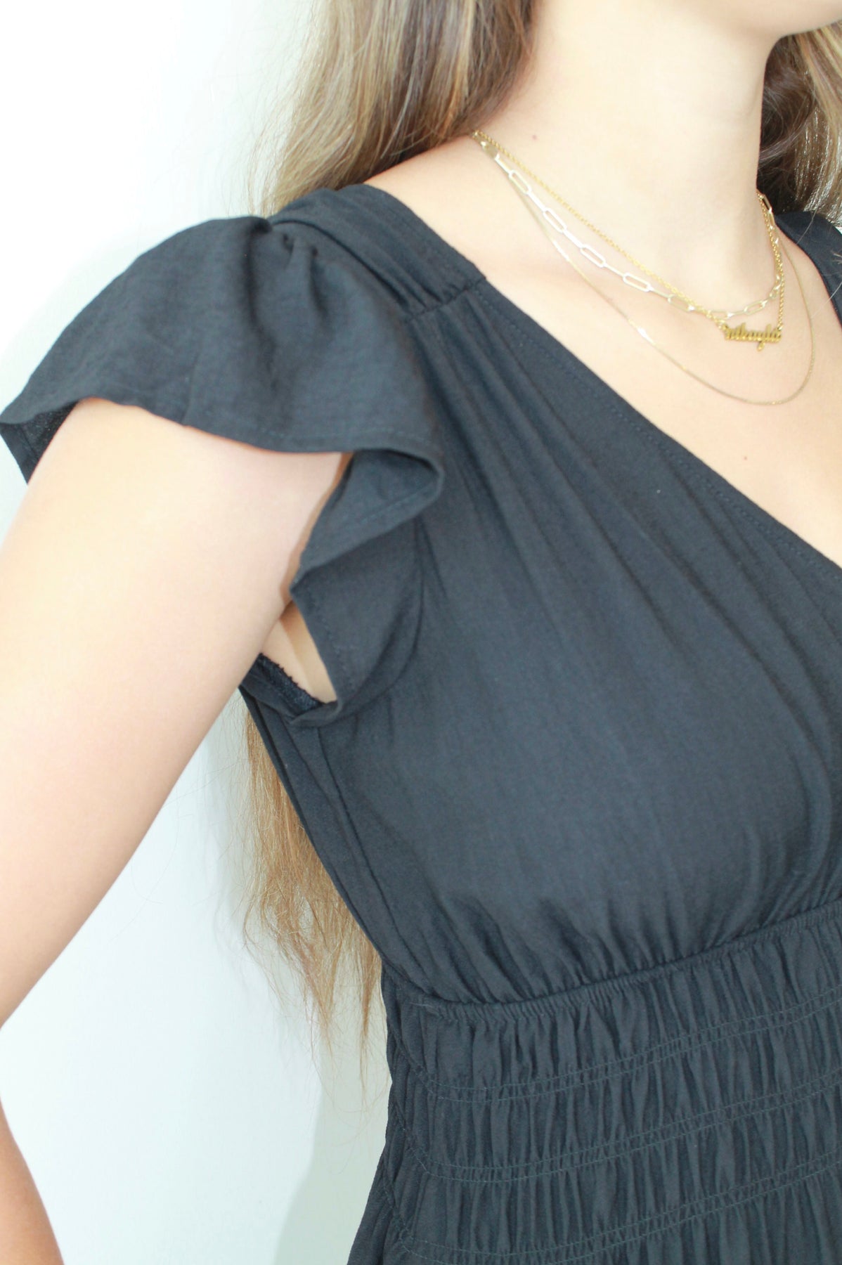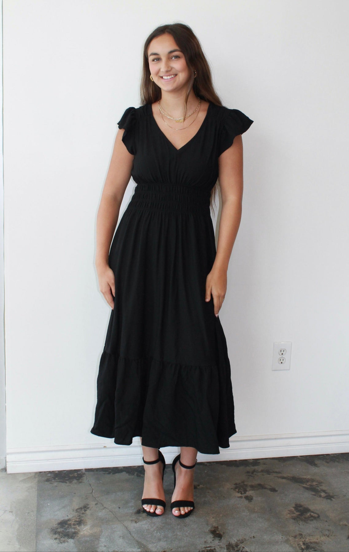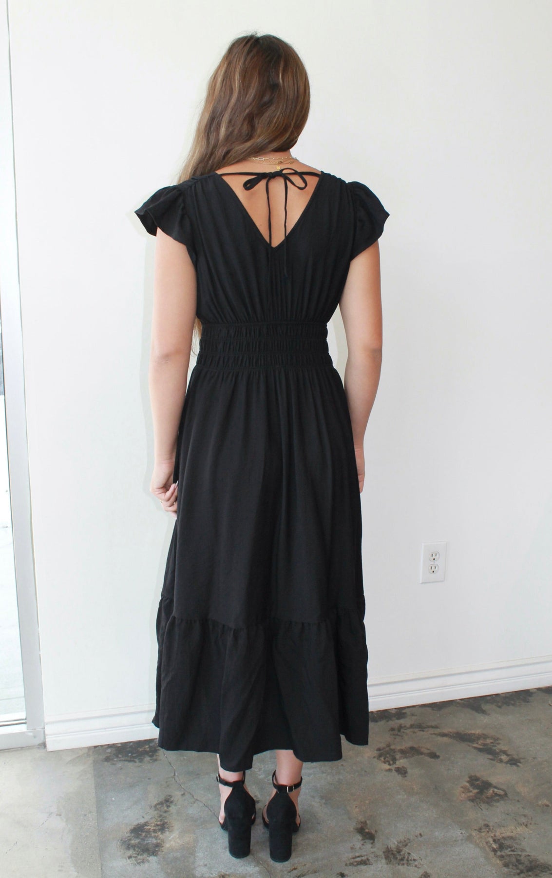 Timeless, flattering, and effortlessly feminine—Camille's Black Flutter Midi is the kind of dress you’ll reach for again and again. Designed with delicate flutter sleeves, a V-neckline, back tie strap, and a stretchy smocked waistband, this piece offers a figure-flattering fit that flows into a breezy, tiered midi-length skirt. Whether styled for dinner dates or casual days out, it’s a graceful staple that moves with you.