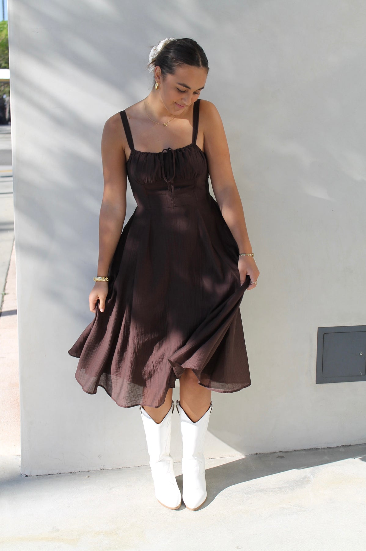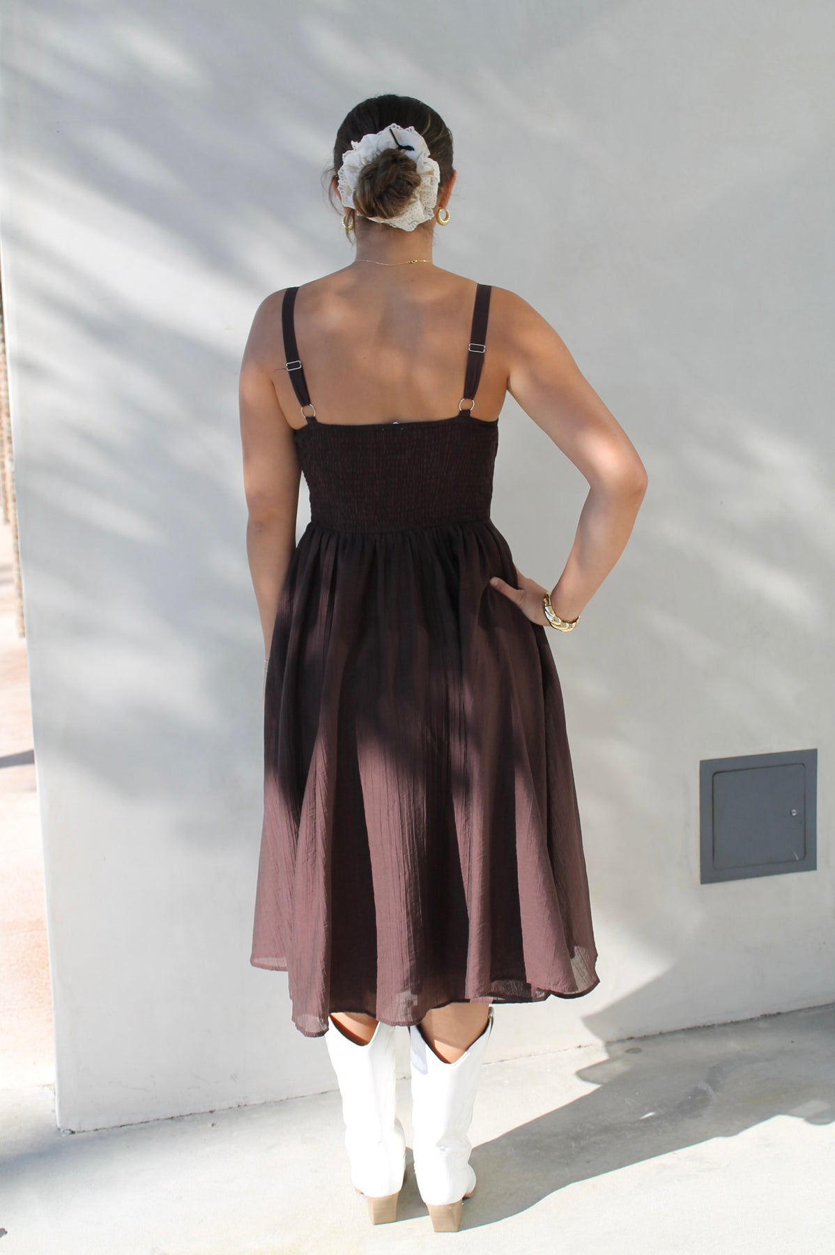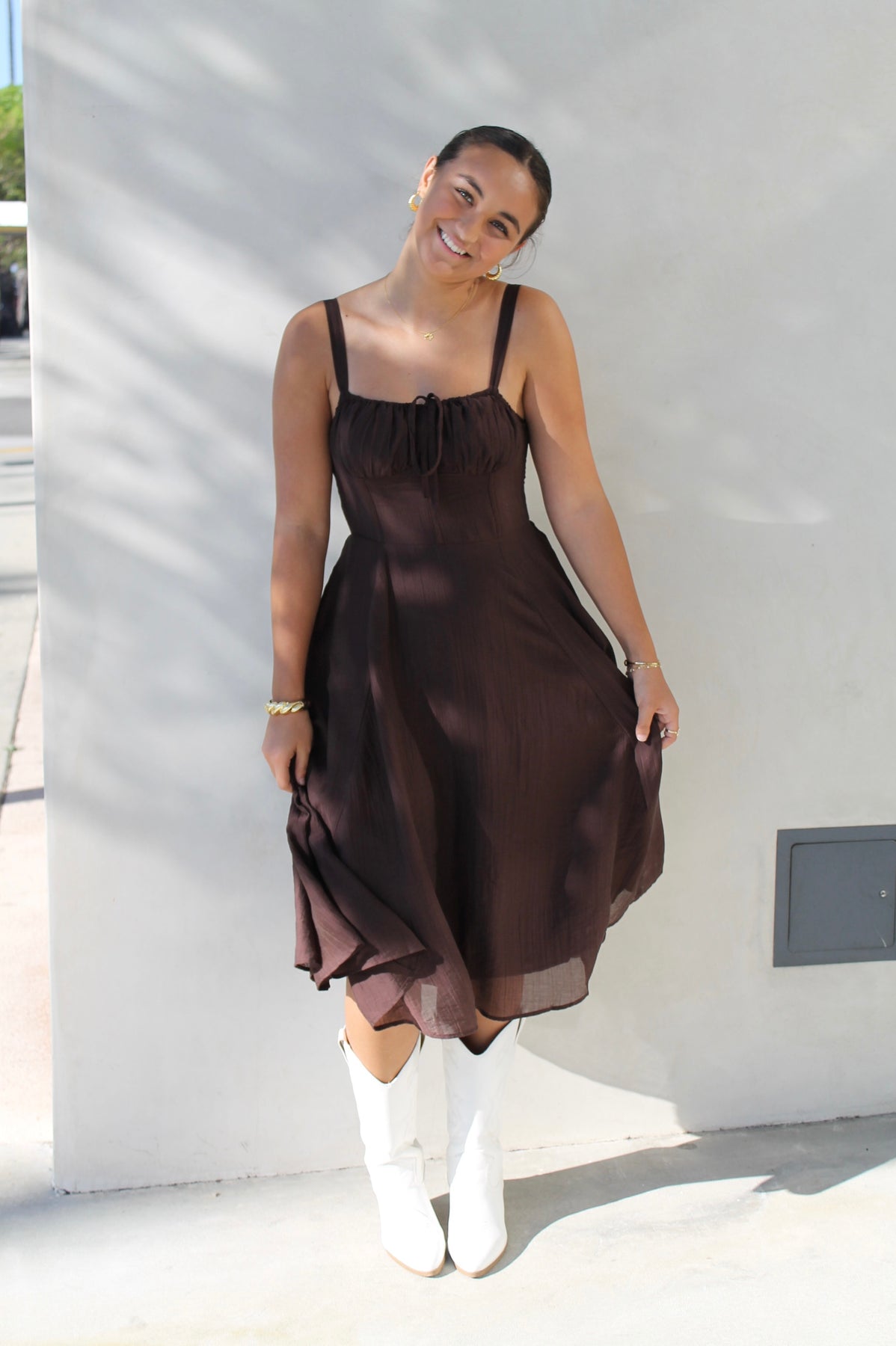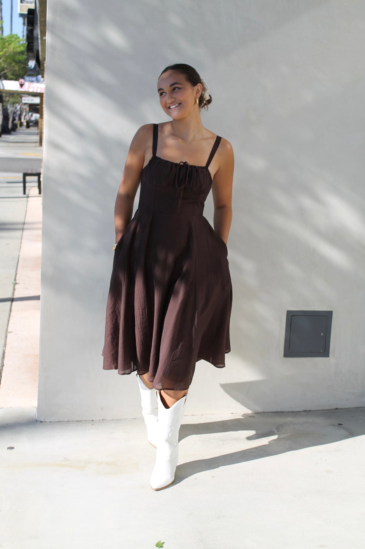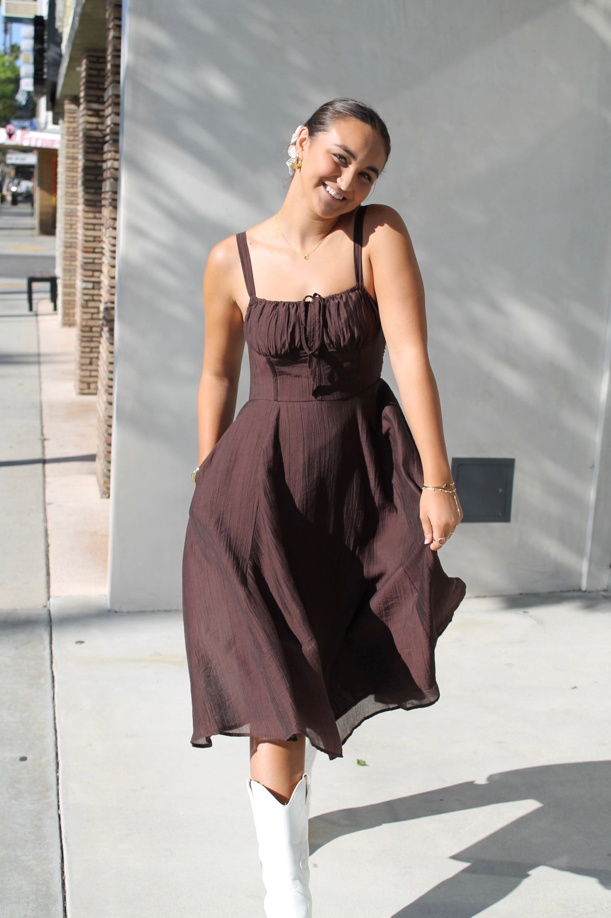 Effortless and timeless, Clara’s Brown Midi is designed in a rich chocolate hue with a flattering fitted bodice, adjustable straps, and a flowy A-line skirt. Hidden side pockets add a practical touch while keeping the look chic. Style it casually with sandals or elevate it with heels — this versatile midi is made for every occasion.