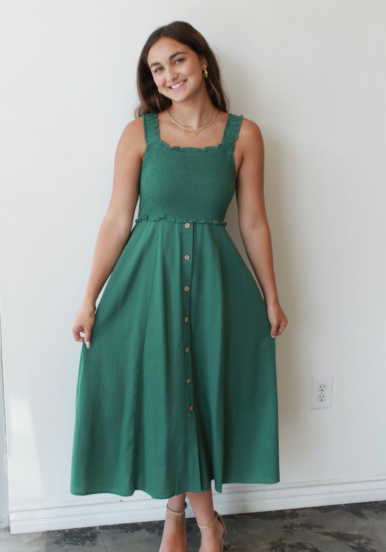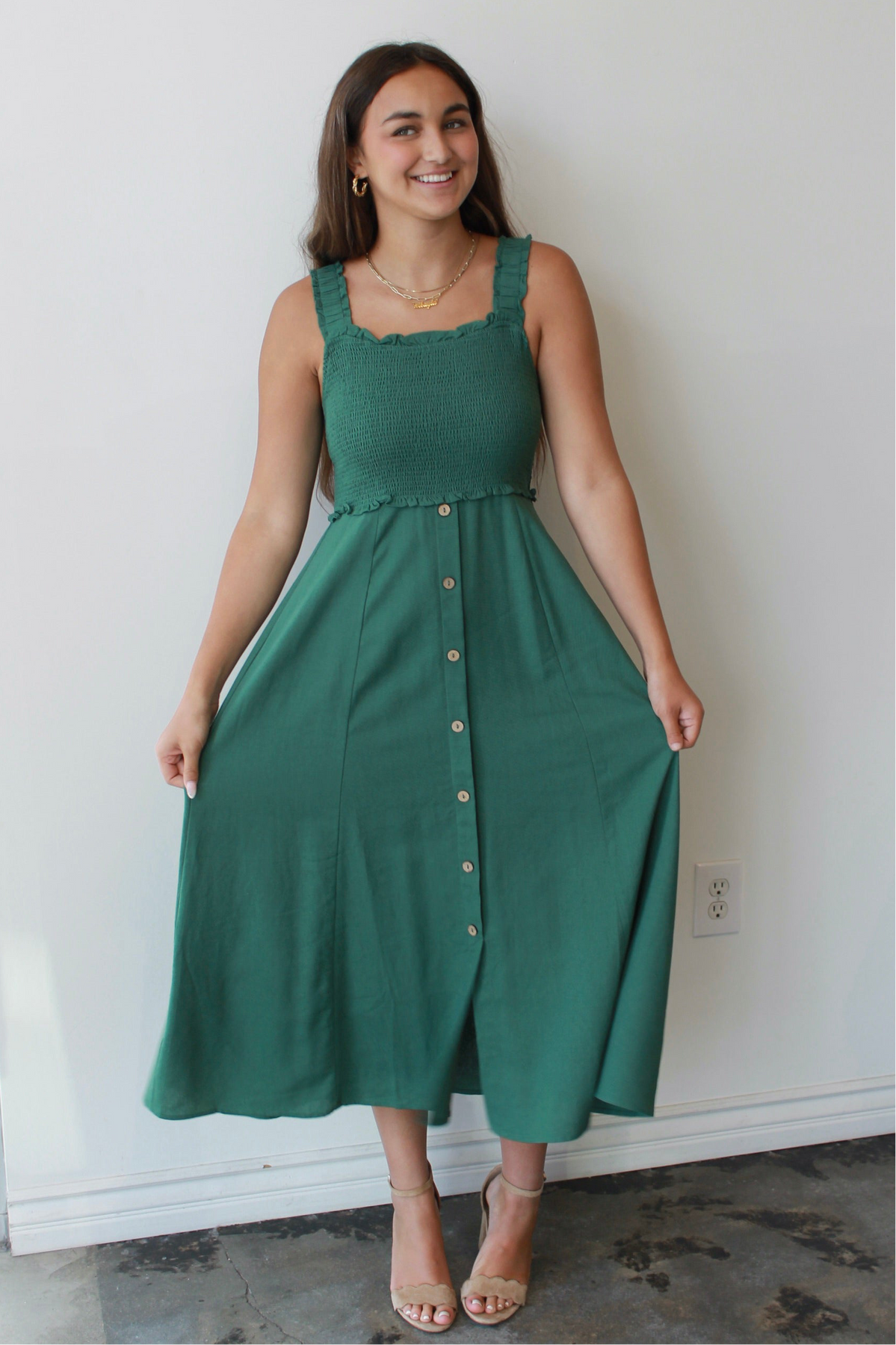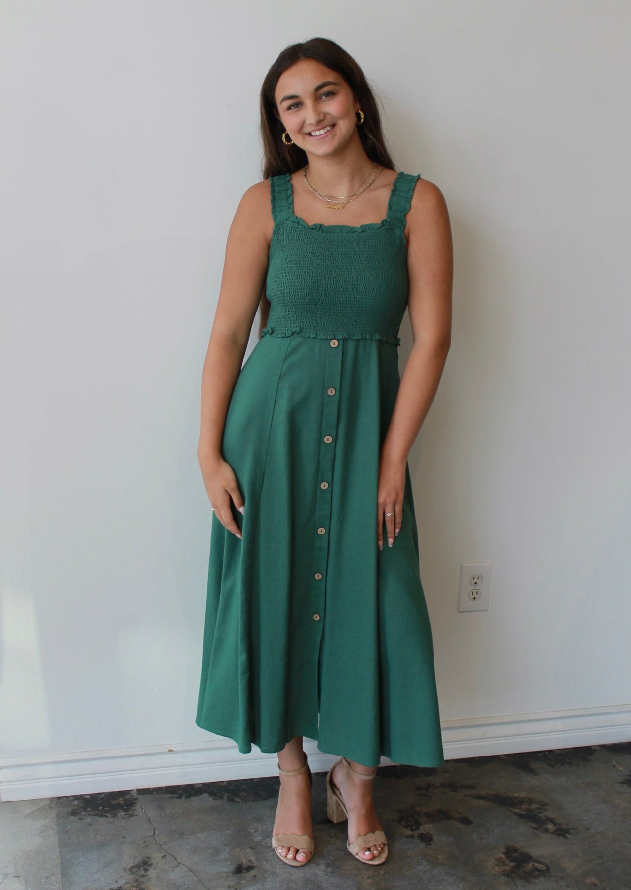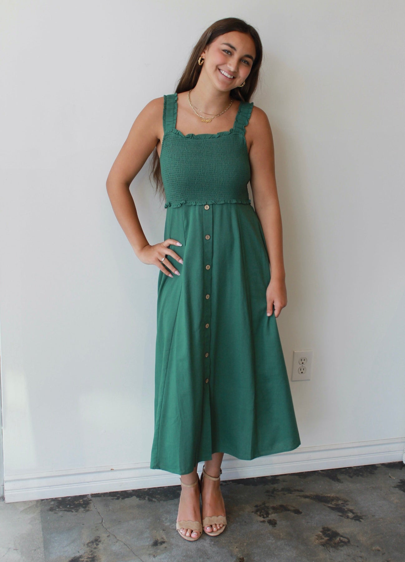 The Evergreen Smocked Midi is your new go-to for easy elegance and everyday charm. Featuring a textured smocked bodice with ruffled trim and wide straps for all-day comfort, this dress flatters in all the right places. The flowy midi-length skirt with a row of wooden-style buttons adds effortless movement and just the right amount of detail. Pair it with sandals for a daytime stroll or wedges for brunch with friends—this timeless green dress is as versatile as it is flattering.