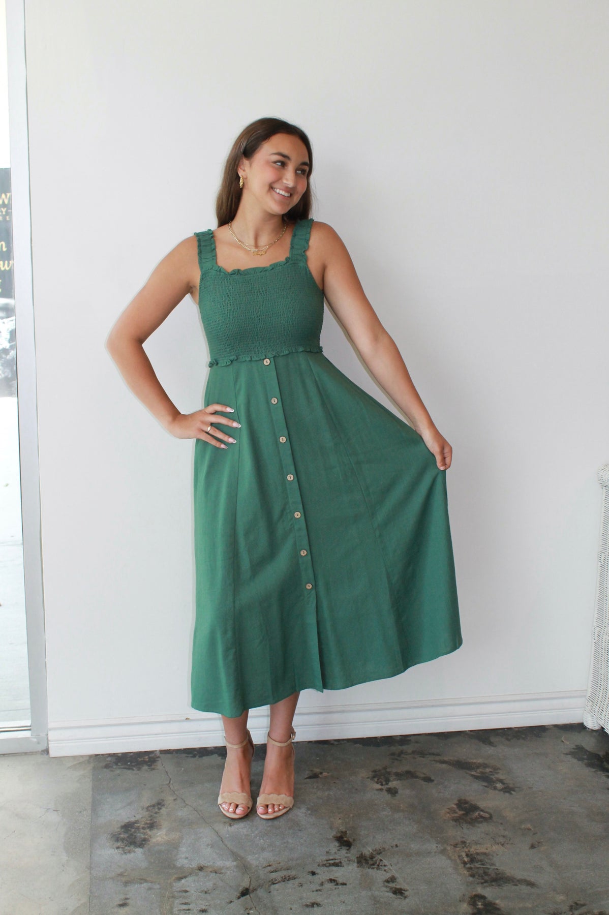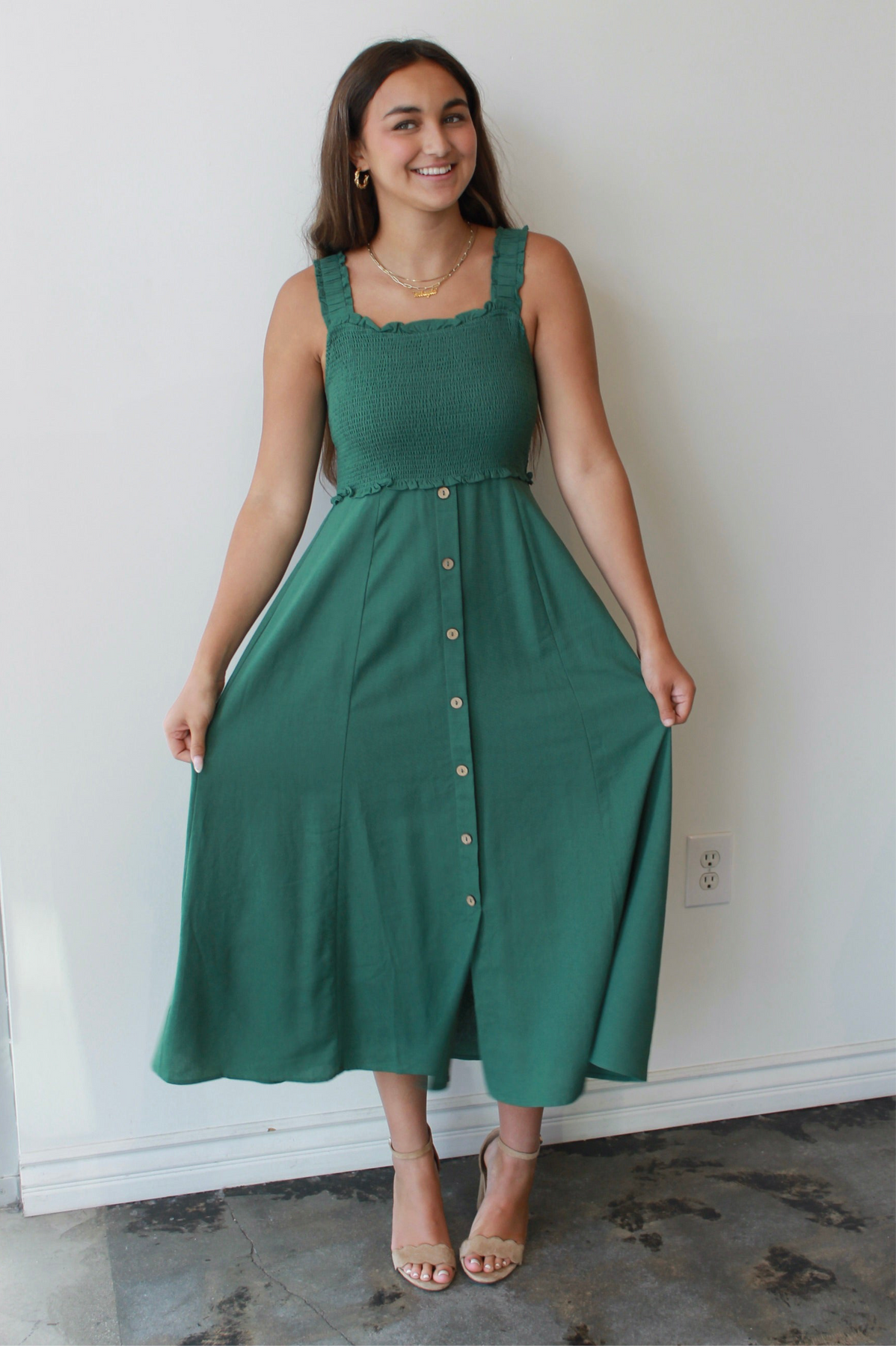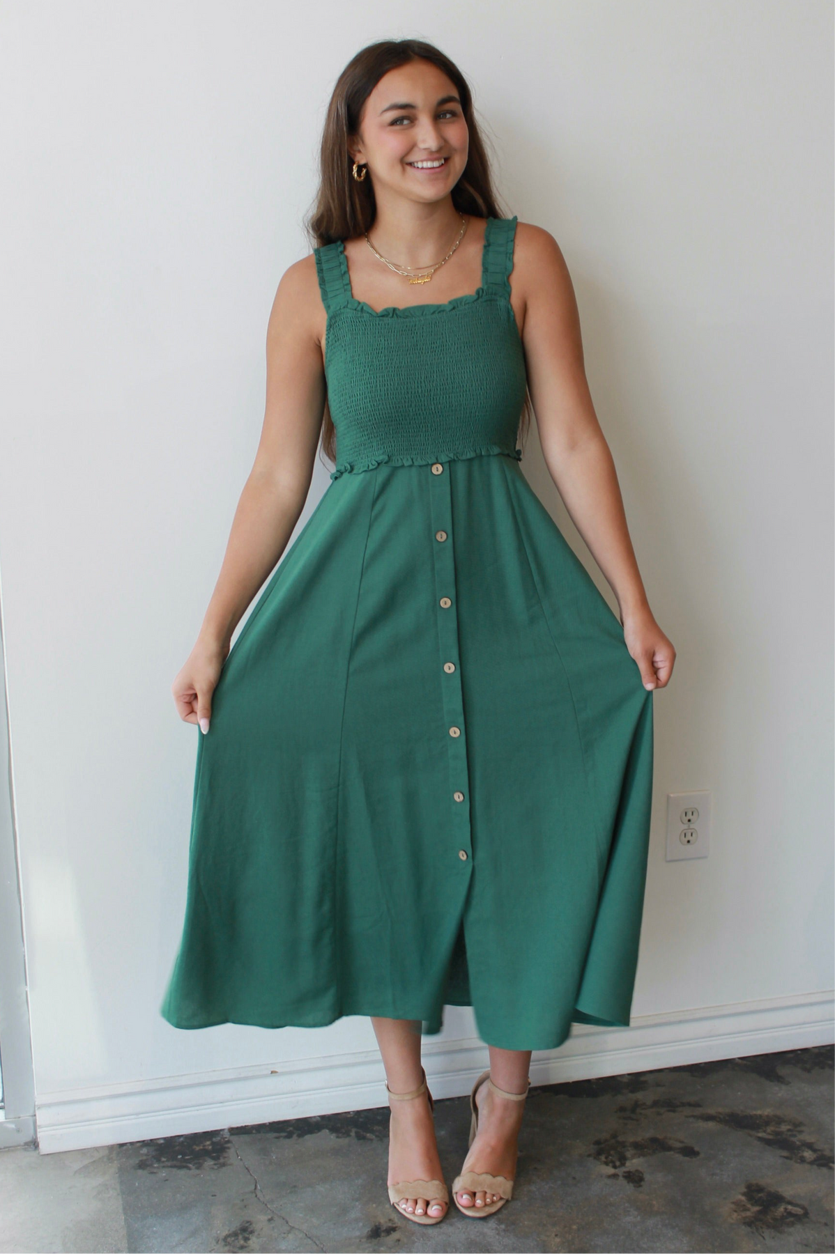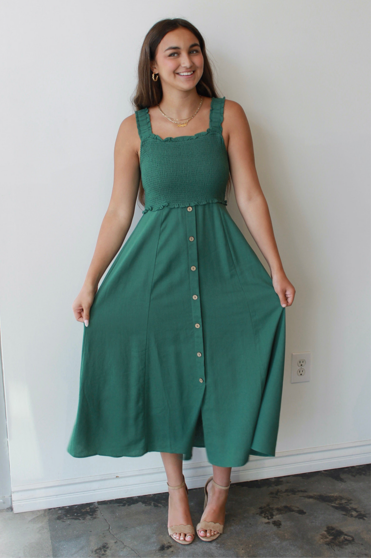 The Evergreen Smocked Midi is your new go-to for easy elegance and everyday charm. Featuring a textured smocked bodice with ruffled trim and wide straps for all-day comfort, this dress flatters in all the right places. The flowy midi-length skirt with a row of wooden-style buttons adds effortless movement and just the right amount of detail. Pair it with sandals for a daytime stroll or wedges for brunch with friends—this timeless green dress is as versatile as it is flattering.