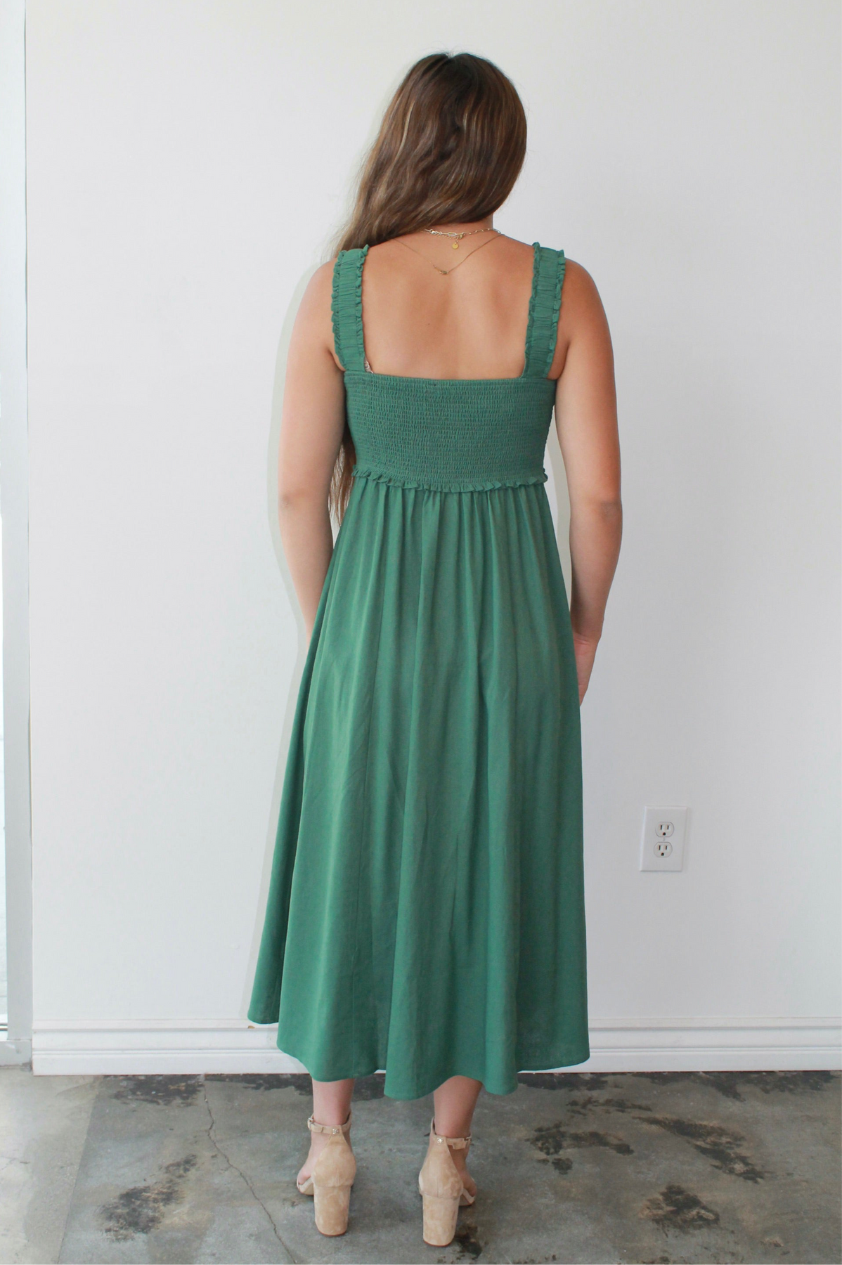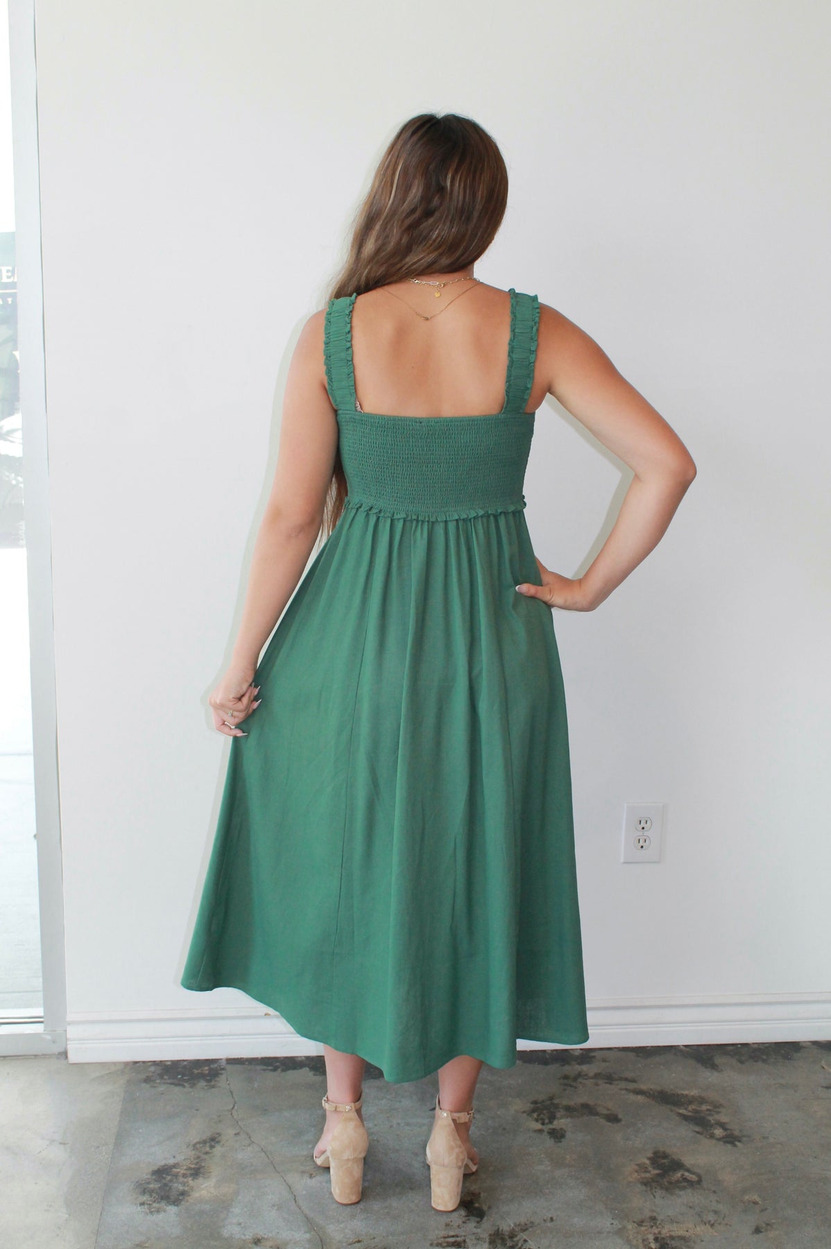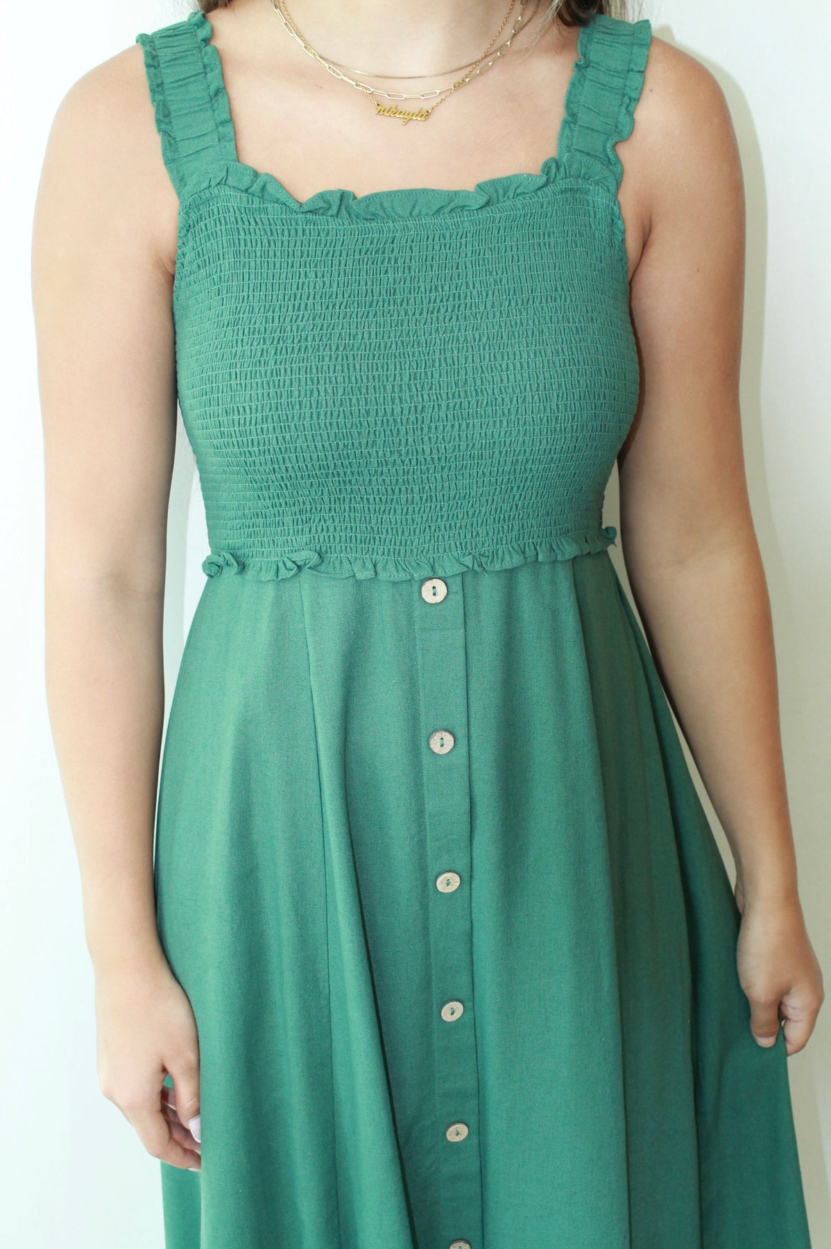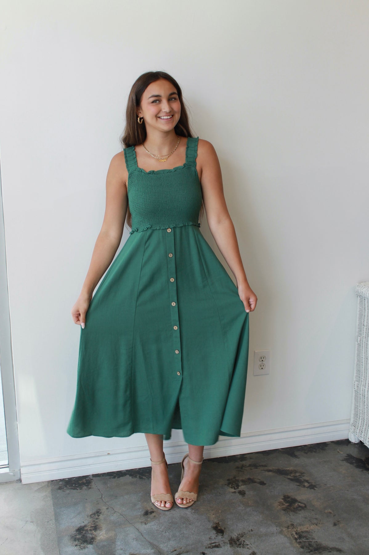 The Evergreen Smocked Midi is your new go-to for easy elegance and everyday charm. Featuring a textured smocked bodice with ruffled trim and wide straps for all-day comfort, this dress flatters in all the right places. The flowy midi-length skirt with a row of wooden-style buttons adds effortless movement and just the right amount of detail. Pair it with sandals for a daytime stroll or wedges for brunch with friends—this timeless green dress is as versatile as it is flattering.