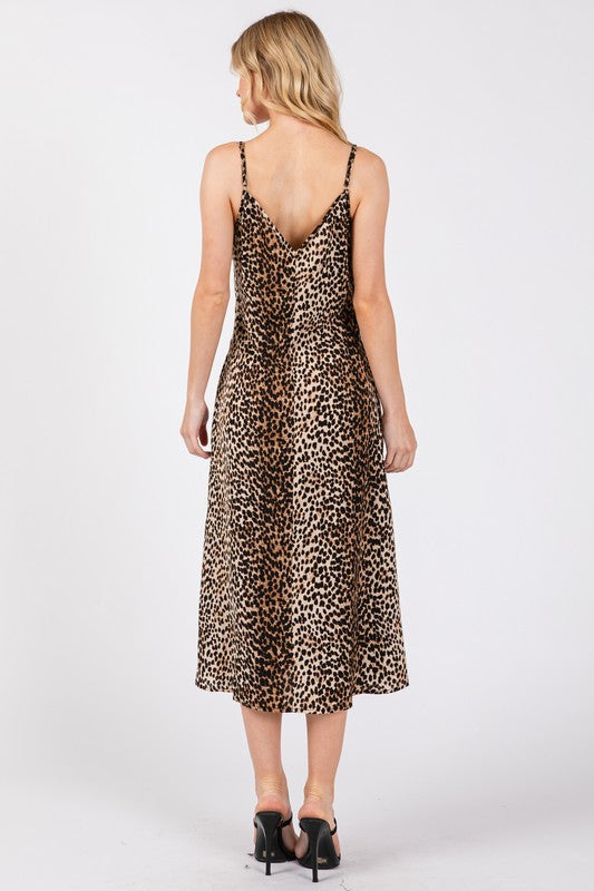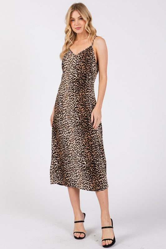 Unleash your wild side with this stunning leopard print midi dress, designed to bring effortless elegance and a touch of bold flair to your wardrobe. Featuring a classic slip dress silhouette with thin adjustable straps and a flattering V-neckline, this dress transitions seamlessly from day to night.