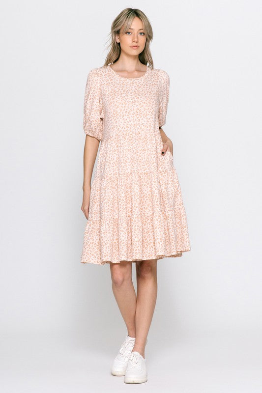 Super cute and comfy leopard printed dress. The tiered layers give this adorable knee length dress the perfect boho chic look. Pair with a cute wide brim hat for a casual on-the-go day that goes from work to play seamlessly.