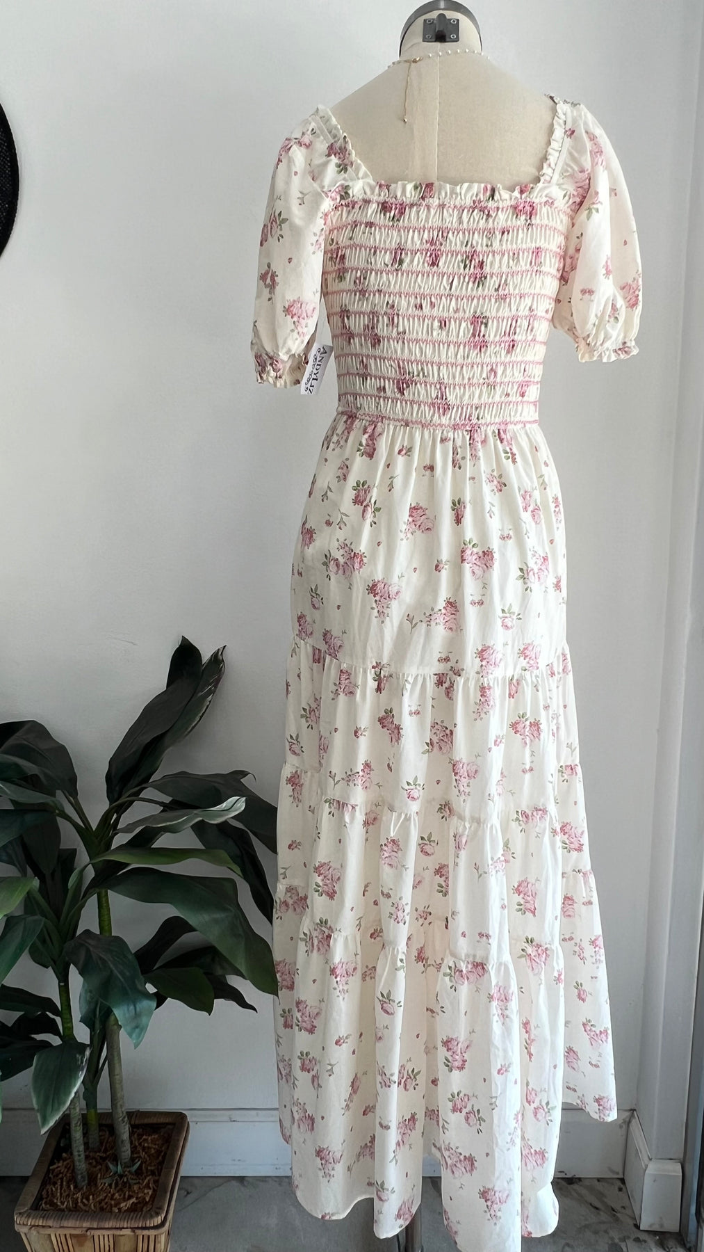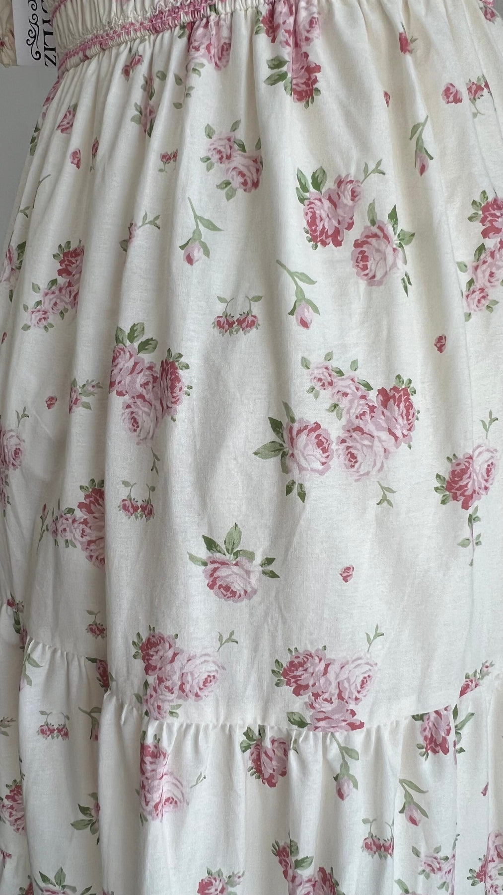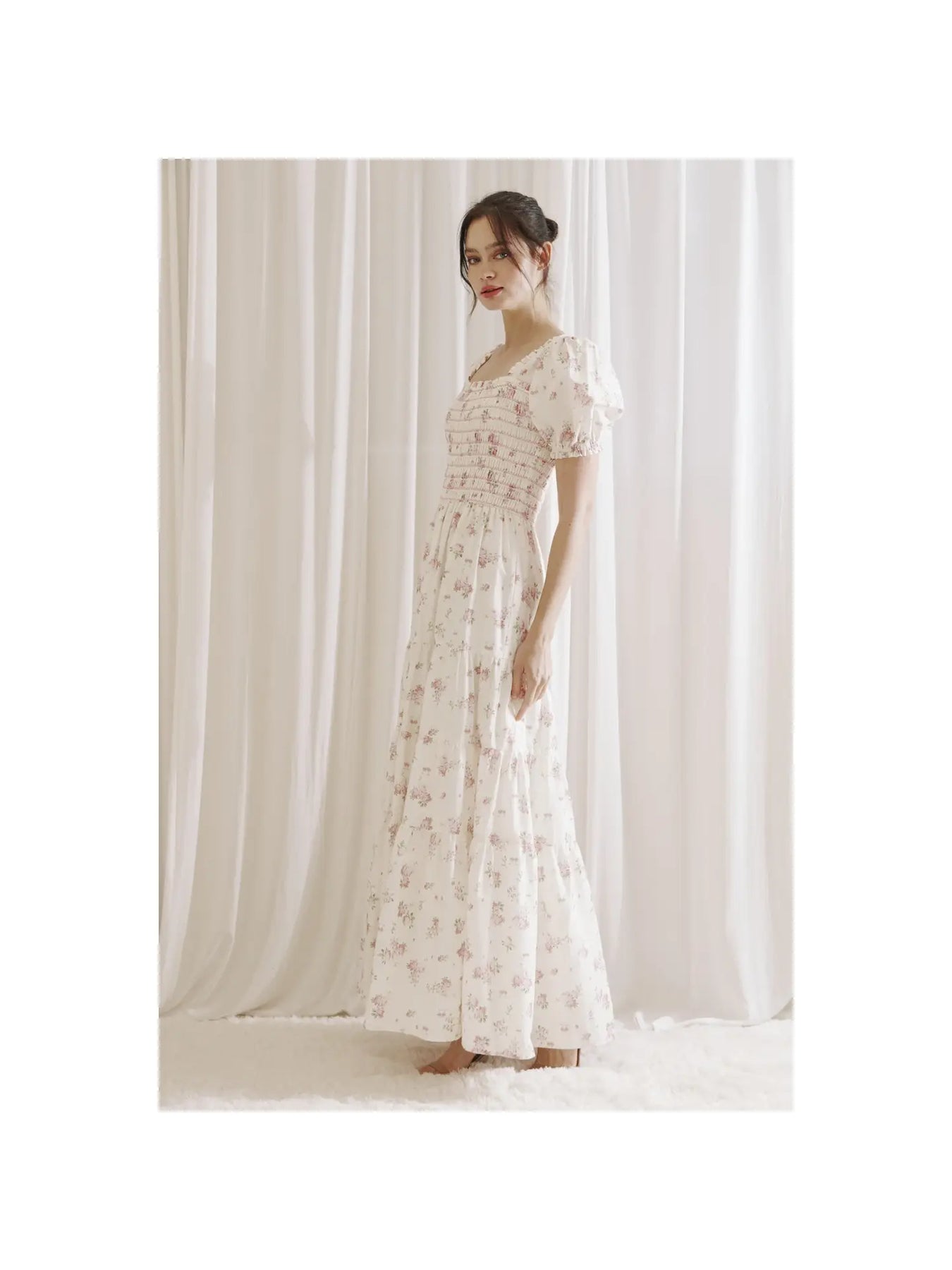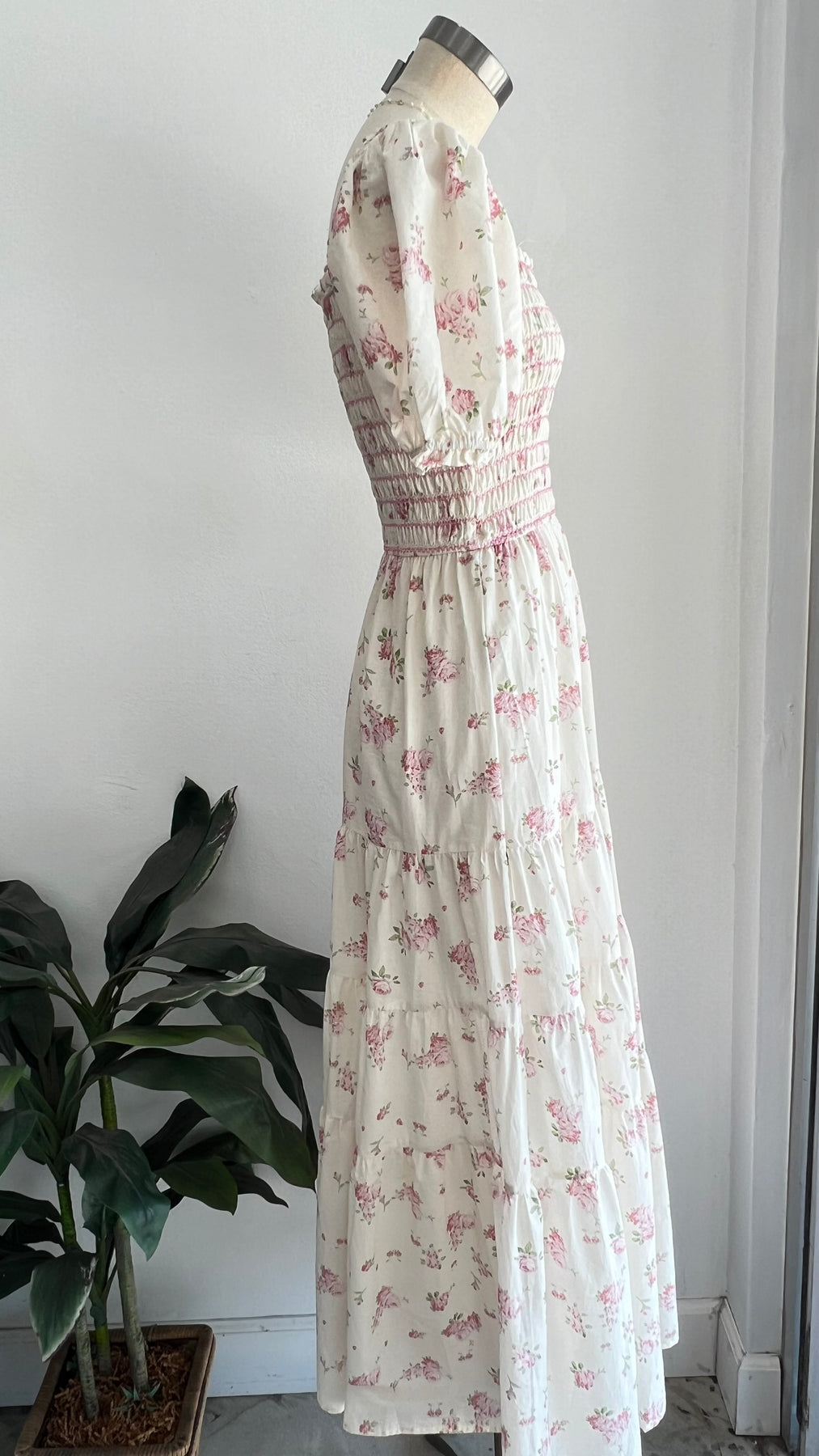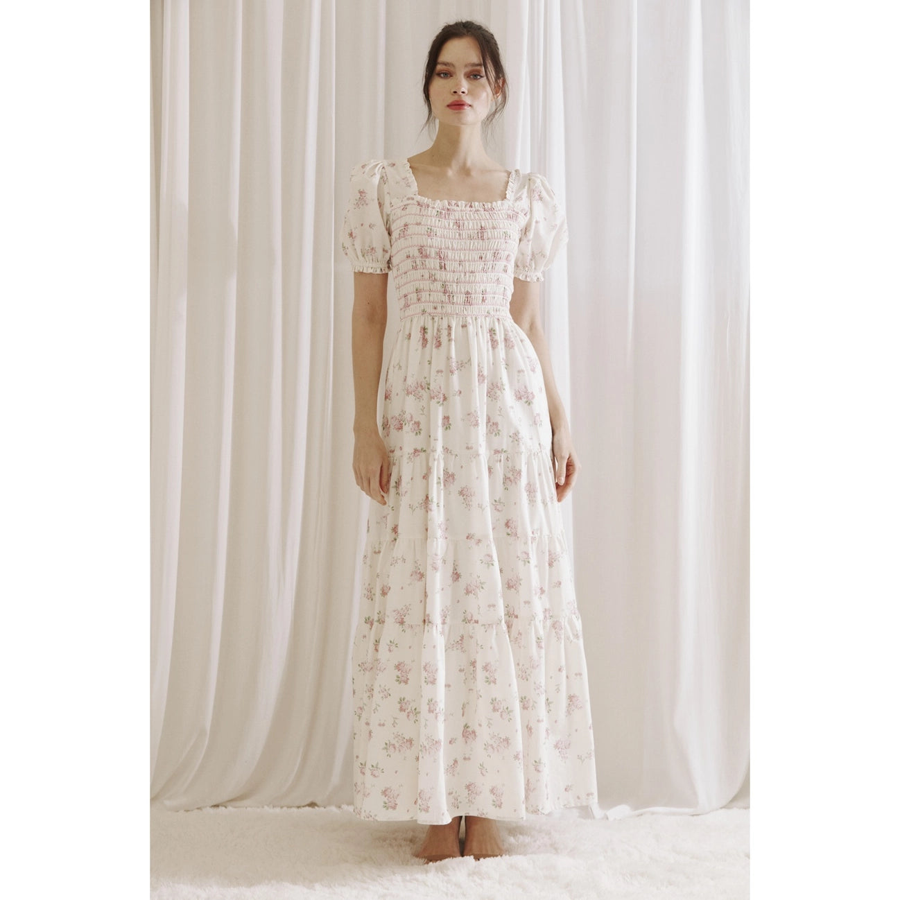 Elegant and romantic maxi dress featuring a stretchy smocked top, short sleeves, and a stunning floral print.