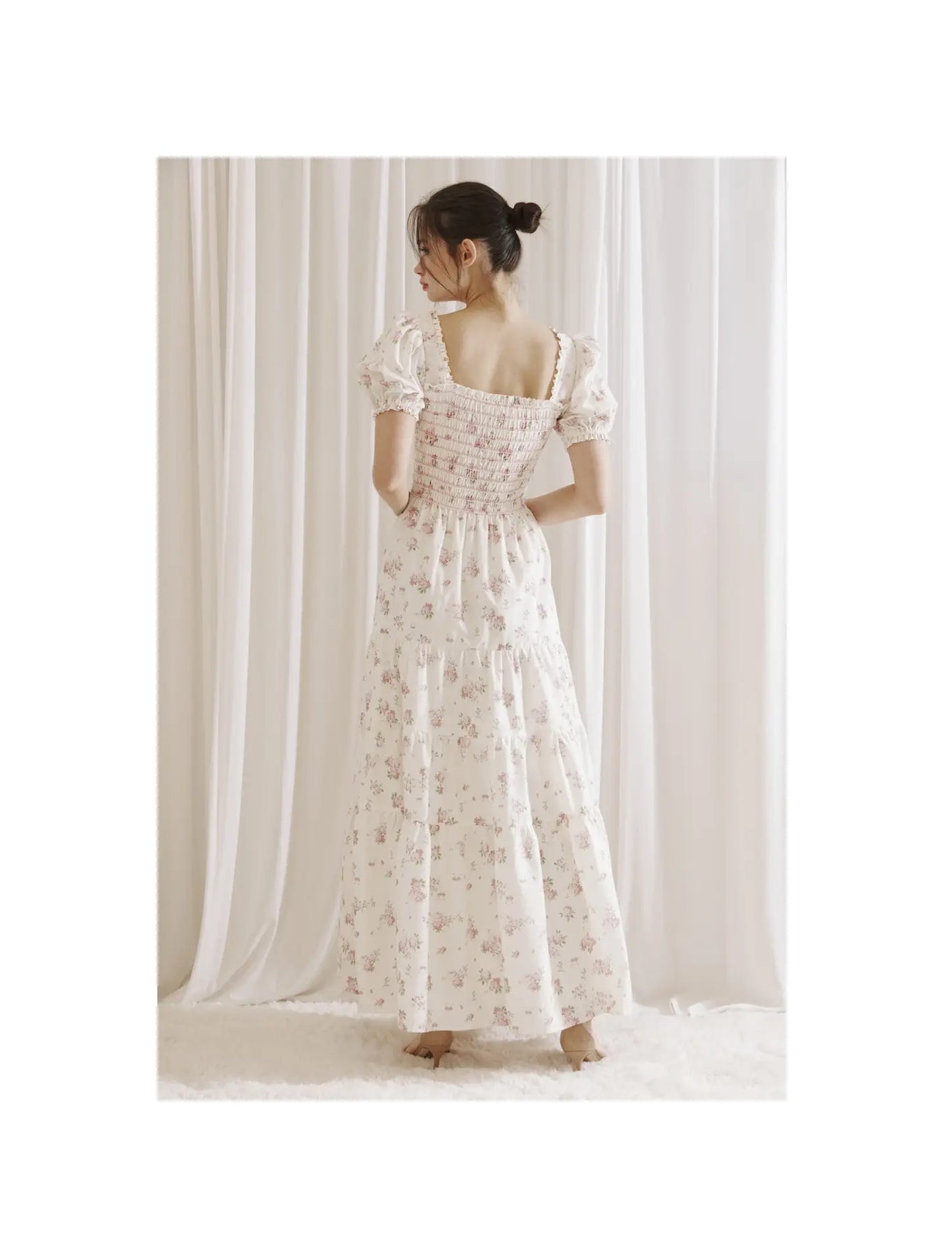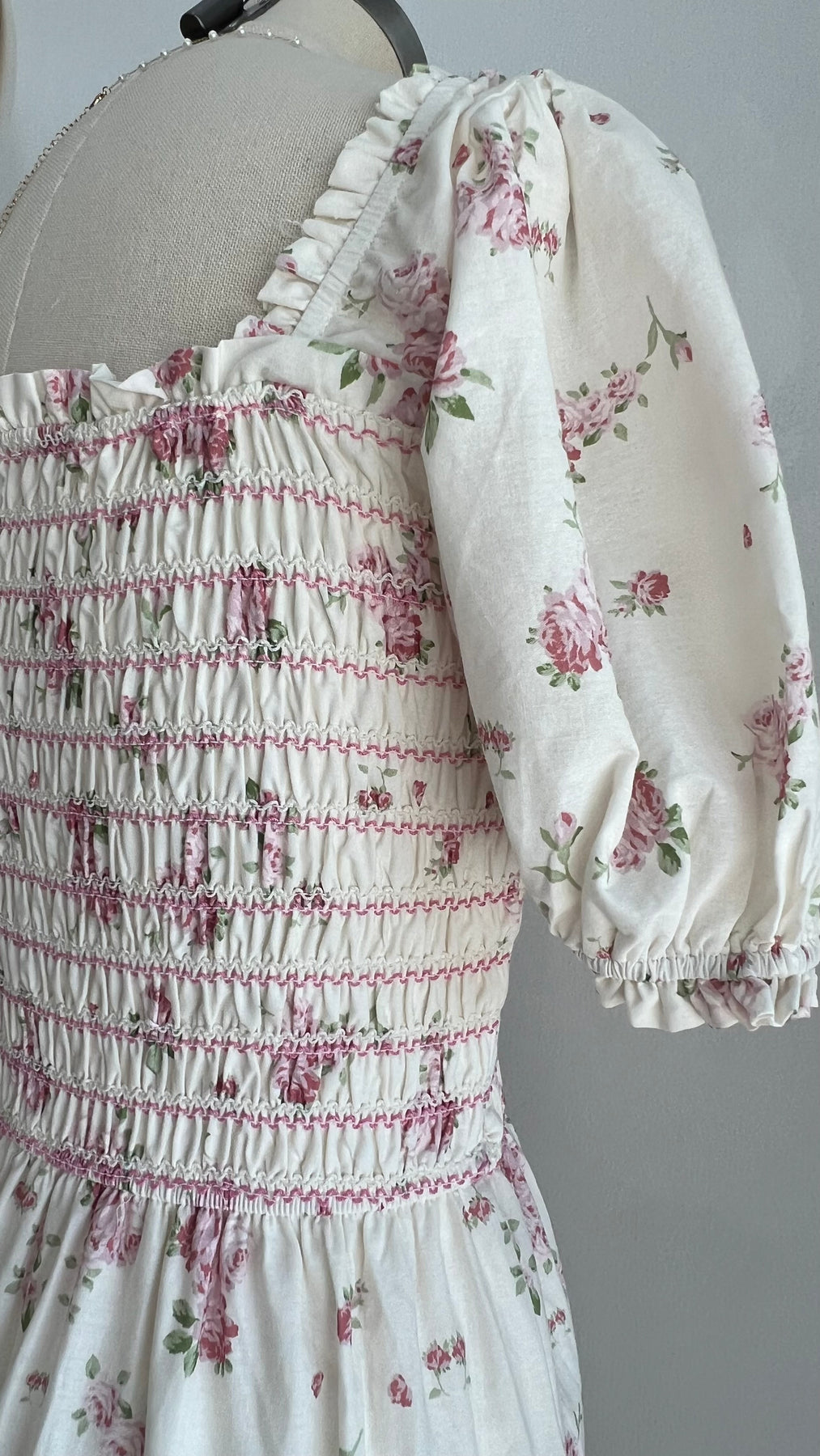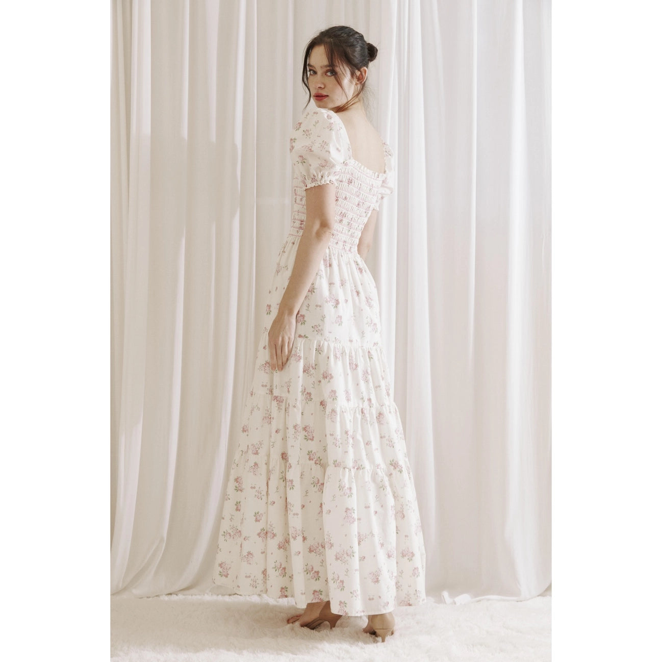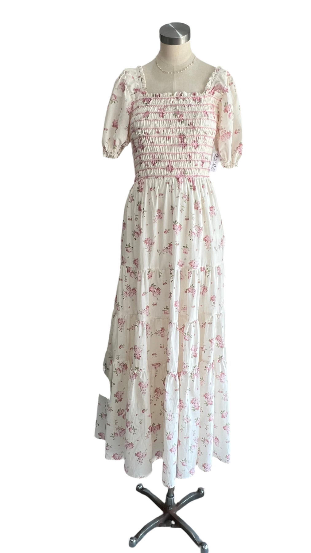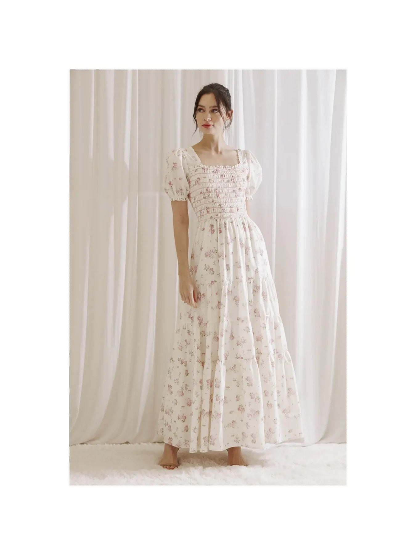 Elegant and romantic maxi dress featuring a stretchy smocked top, short sleeves, and a stunning floral print.