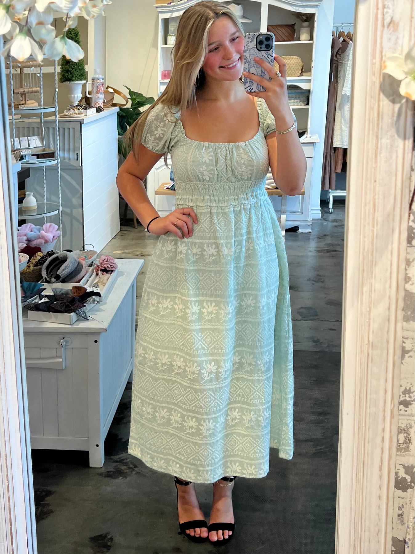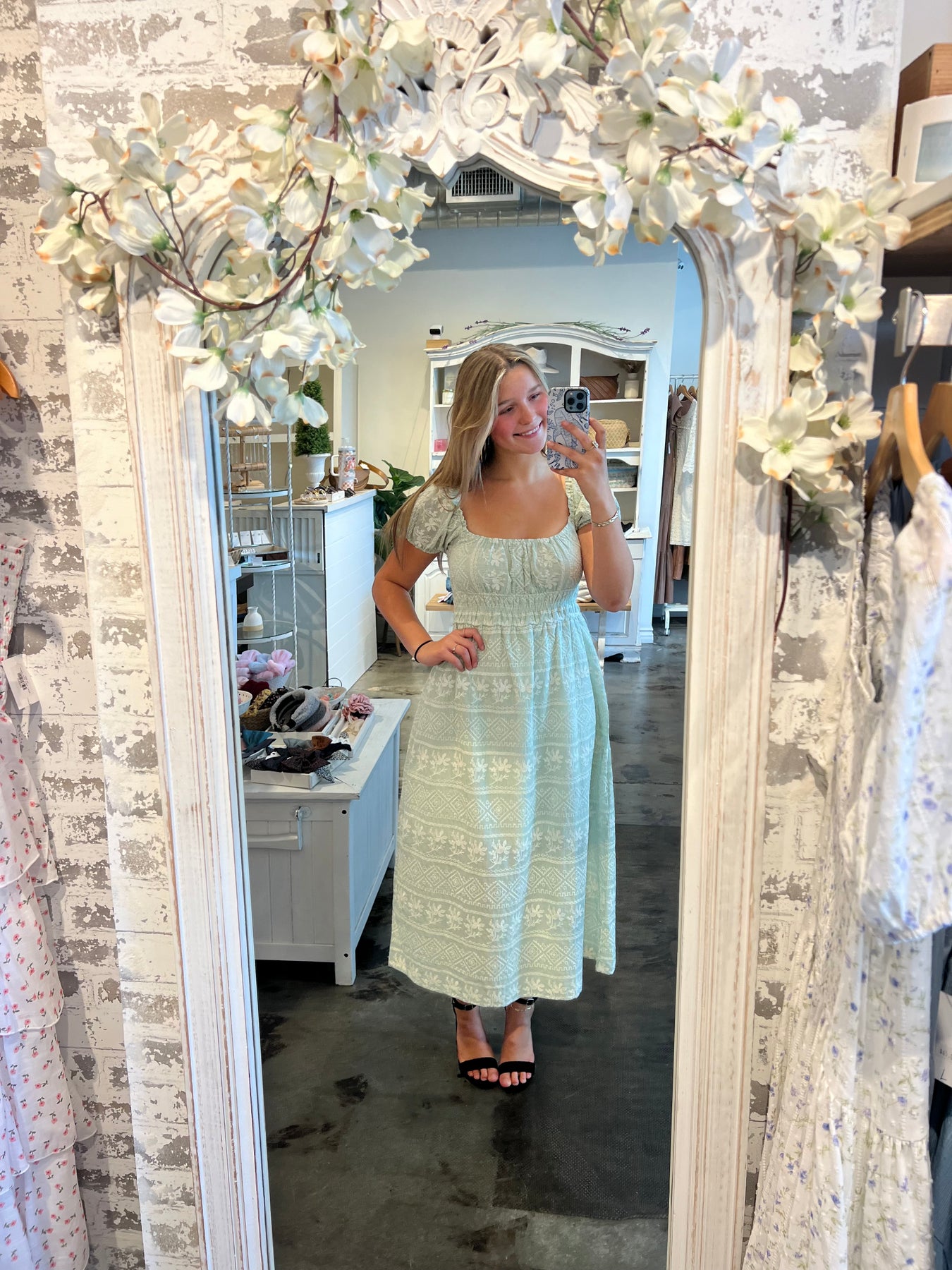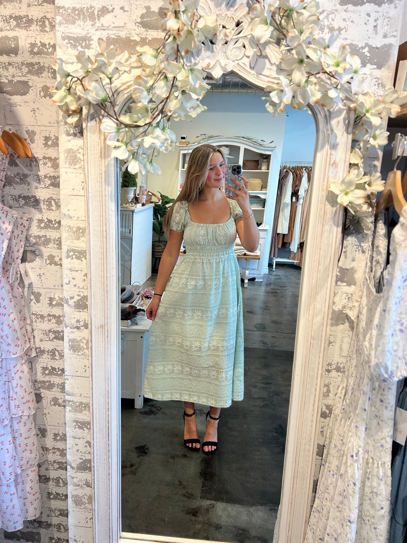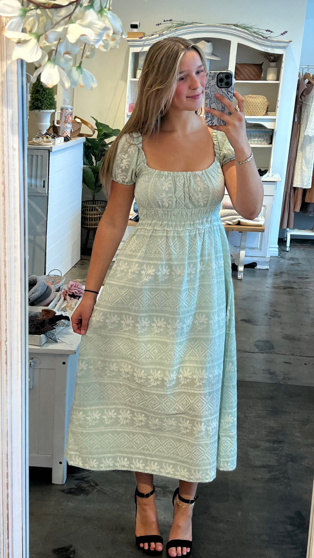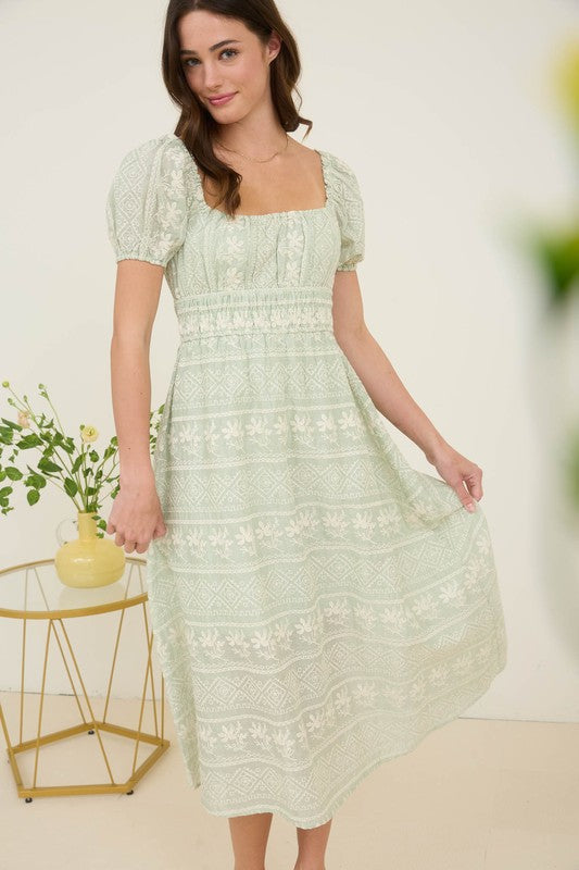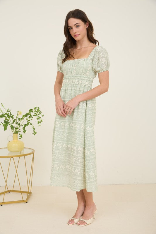 Soft, feminine, and effortlessly graceful — the Sage Meadow Embroidered Midi Dress captures the charm of a spring day in full bloom. This romantic midi features a square neckline, puff sleeves, and intricate ivory embroidery woven into a sage green fabric. With a smocked waist for a flattering fit and a flowing A-line skirt, it’s the perfect dress for garden parties, bridal showers, or sunlit strolls.