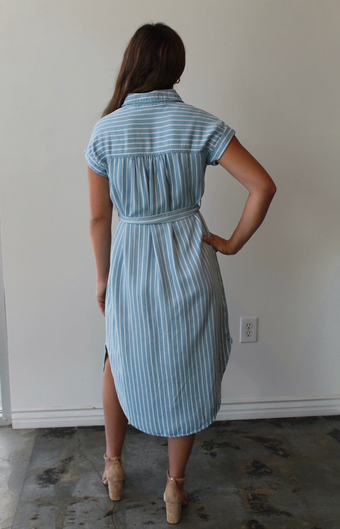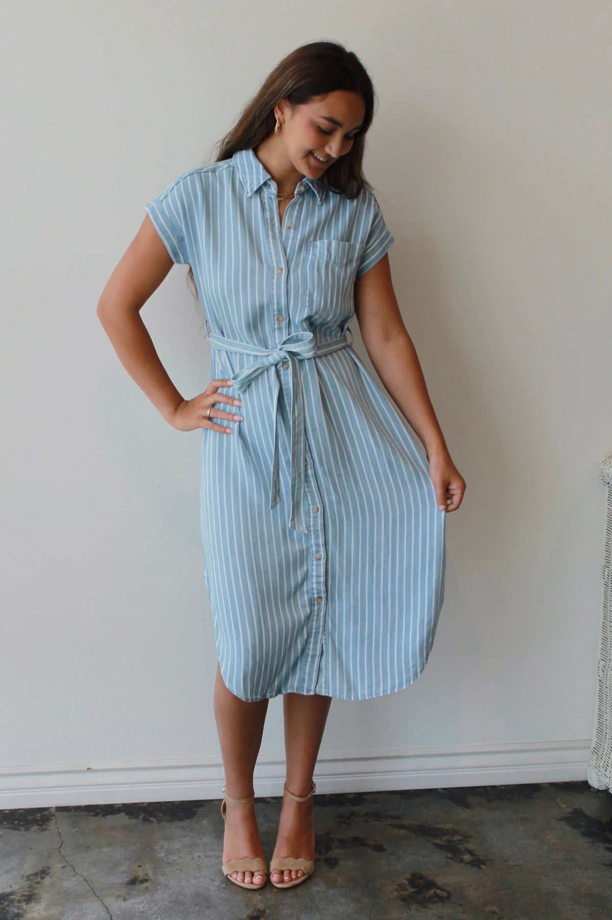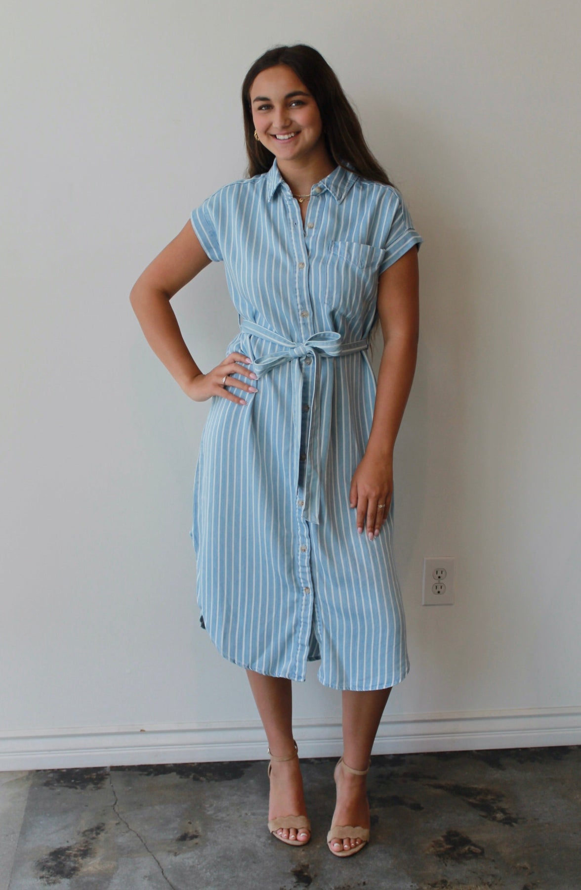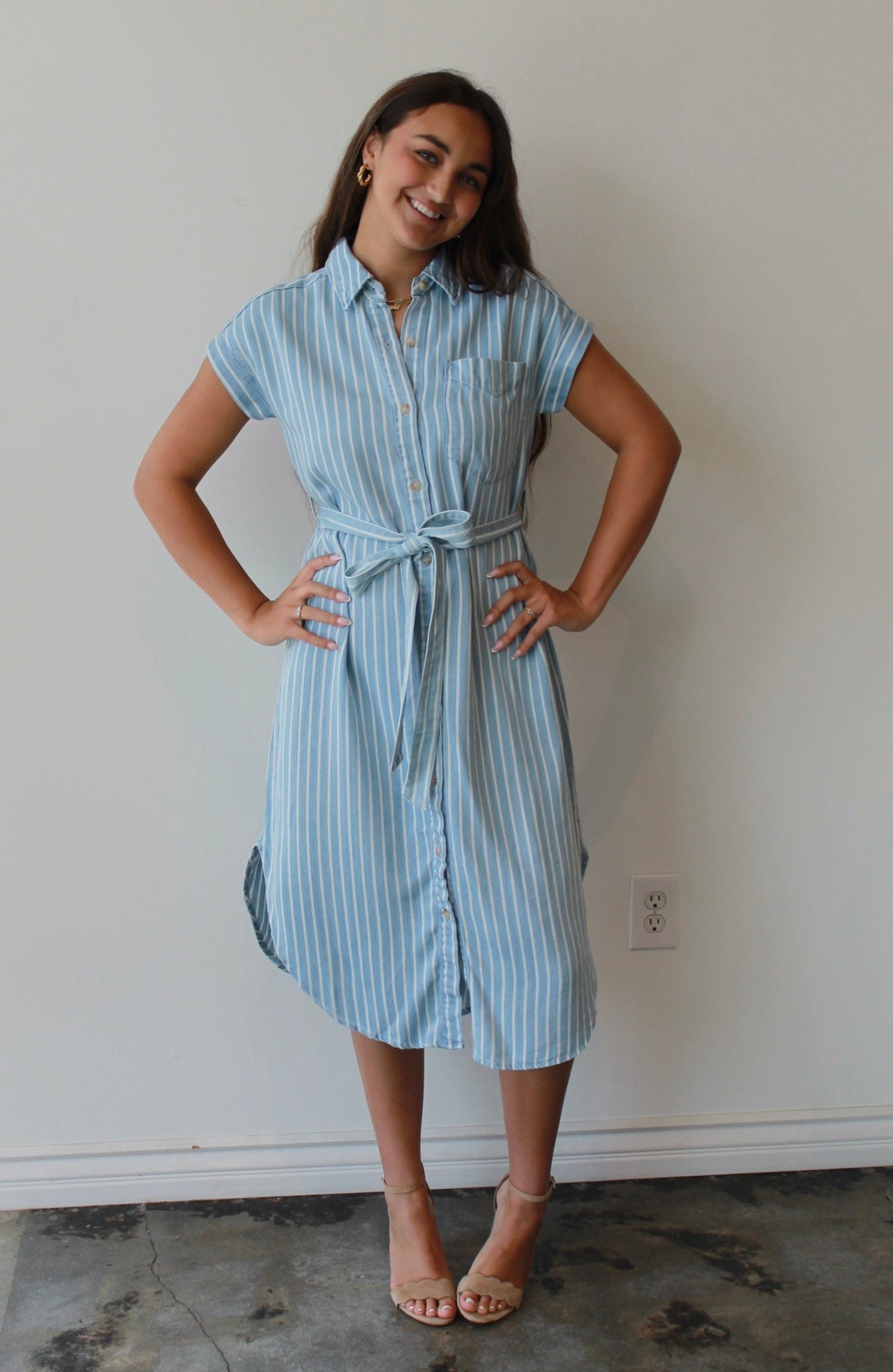 Timeless, tailored, and effortlessly breezy—Saylor’s Striped Shirt Dress is a warm-weather essential. Designed with classic blue-and-white vertical stripes, this midi dress features a button-down front, cuffed short sleeves, and a removable waist tie for customizable styling. The shirttail hem adds a relaxed finish, making it easy to dress up with wedges or keep it casual with sandals.