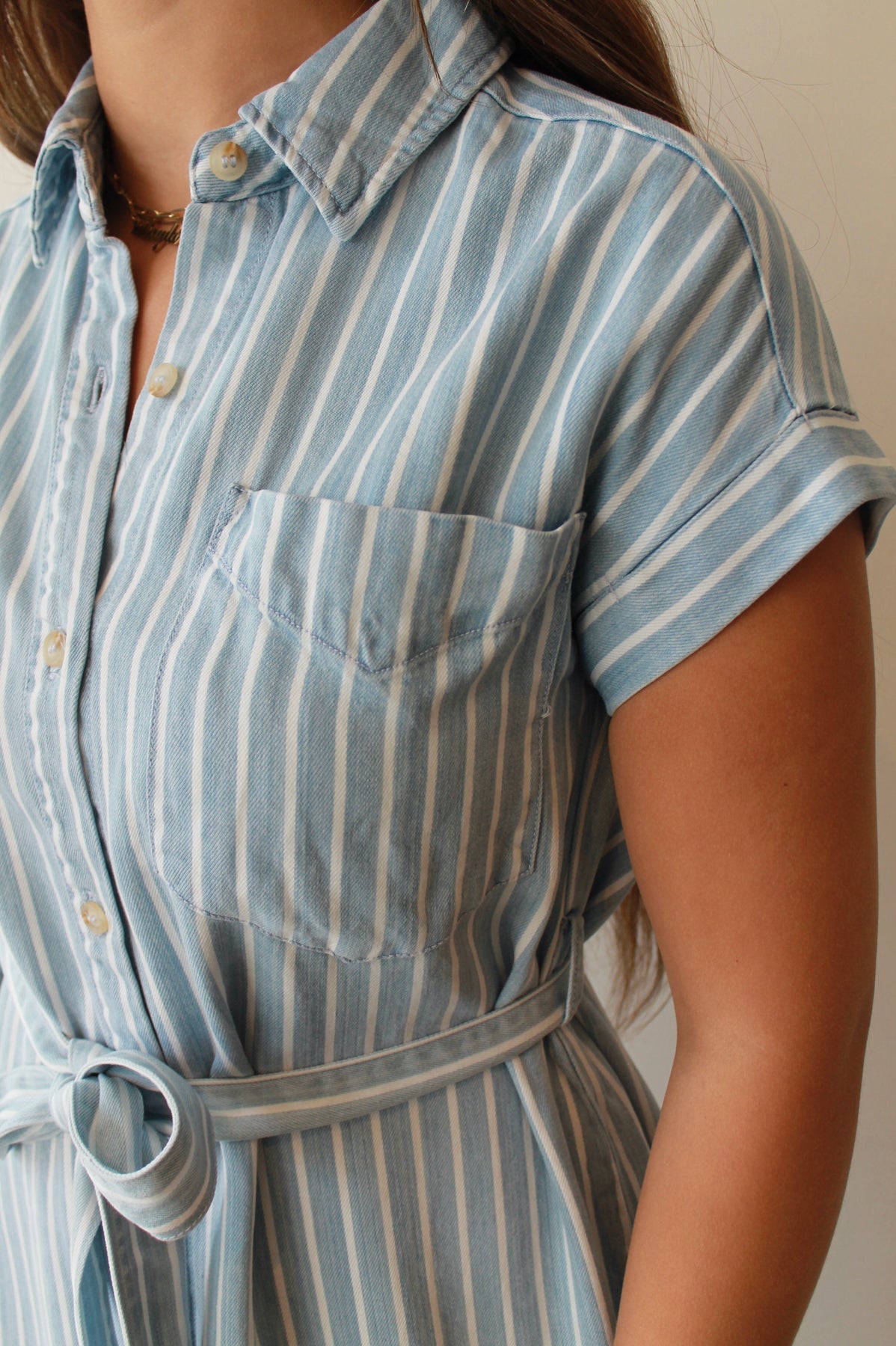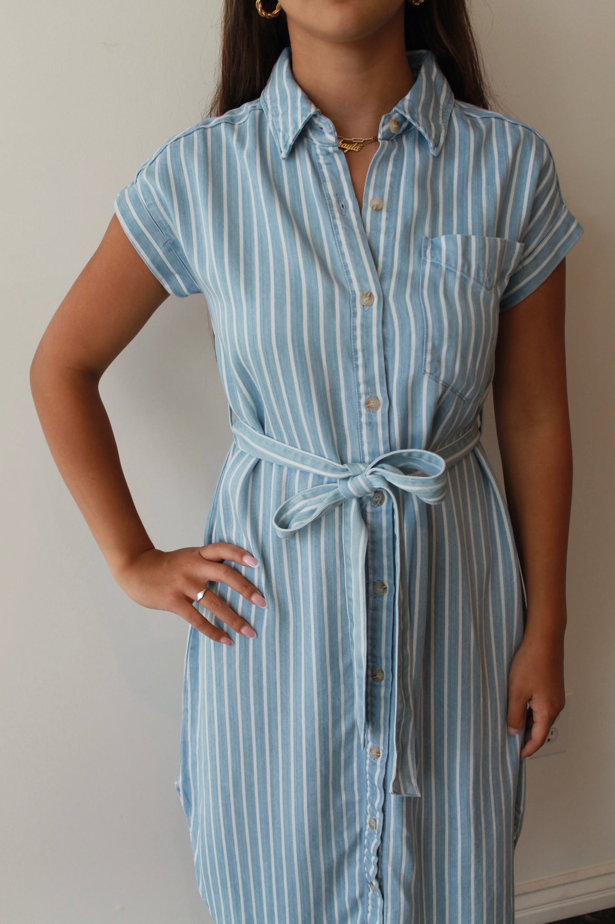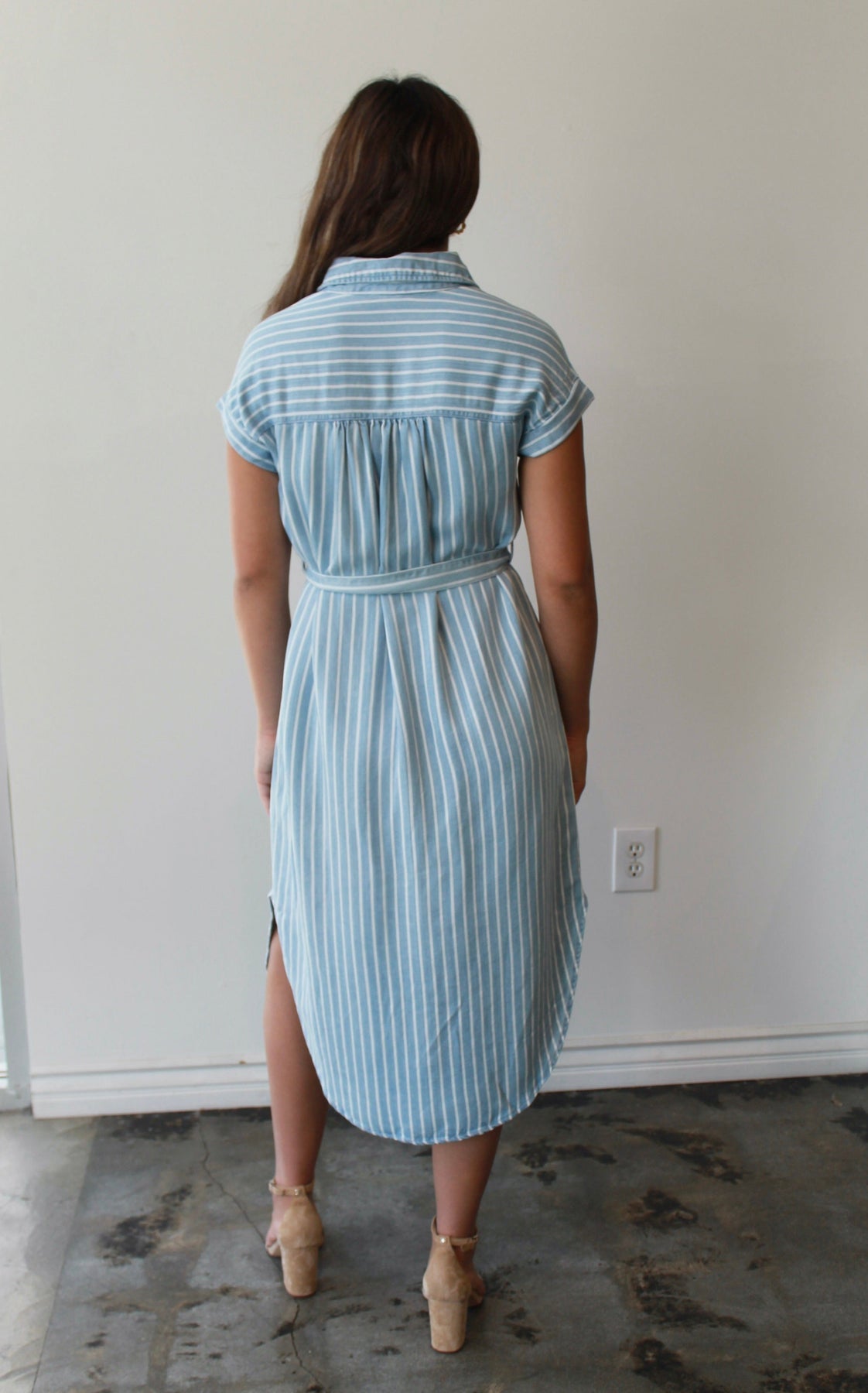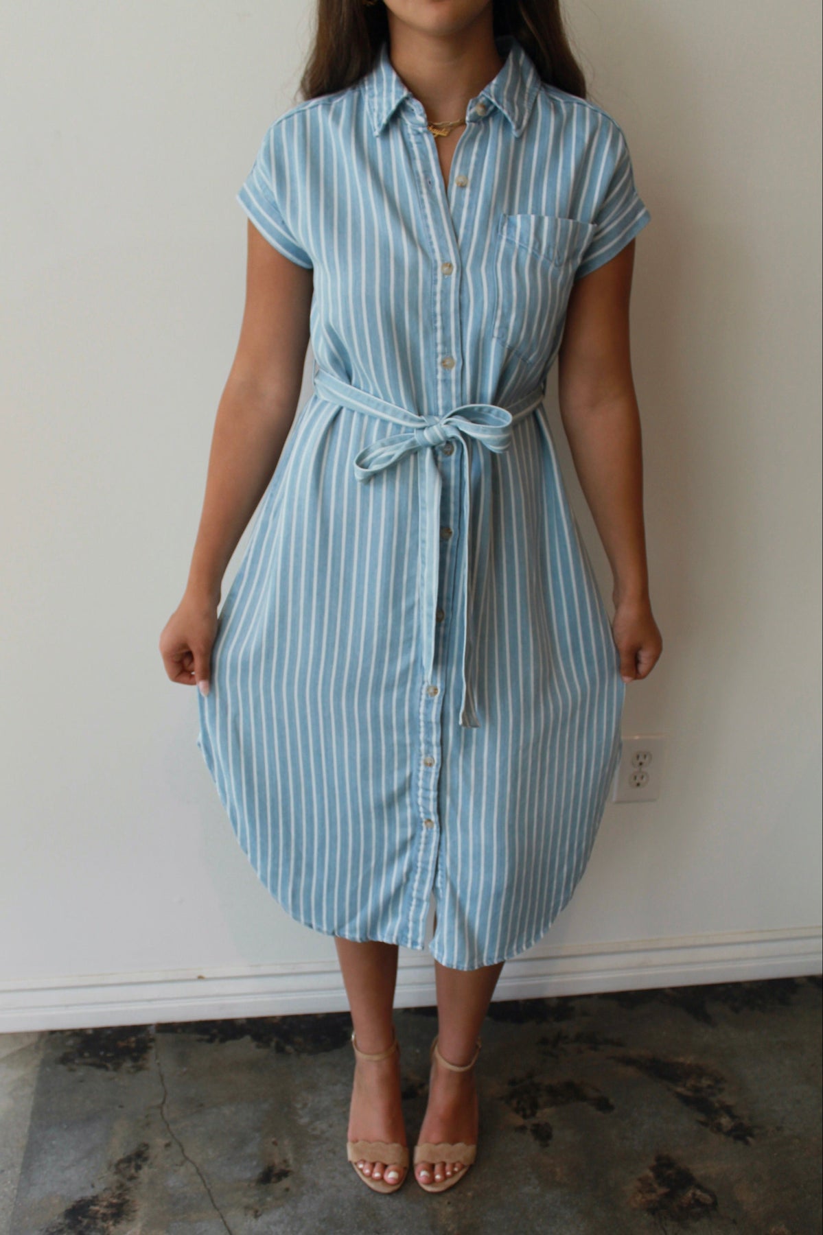Timeless, tailored, and effortlessly breezy—Saylor’s Striped Shirt Dress is a warm-weather essential. Designed with classic blue-and-white vertical stripes, this midi dress features a button-down front, cuffed short sleeves, and a removable waist tie for customizable styling. The shirttail hem adds a relaxed finish, making it easy to dress up with wedges or keep it casual with sandals.