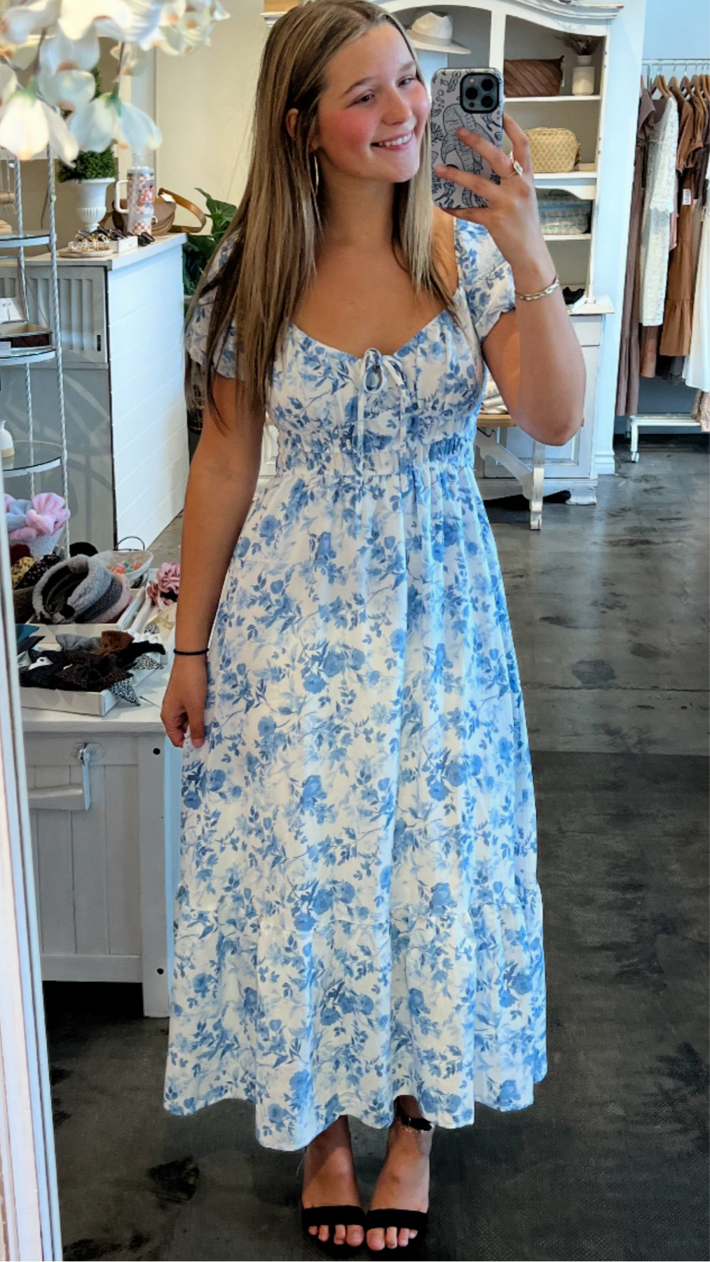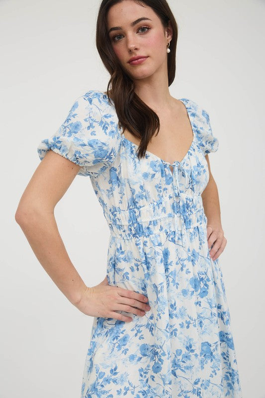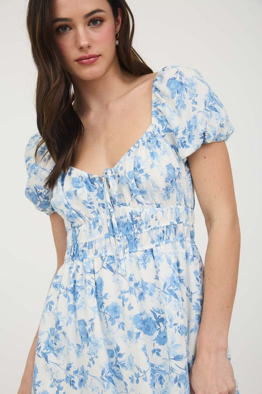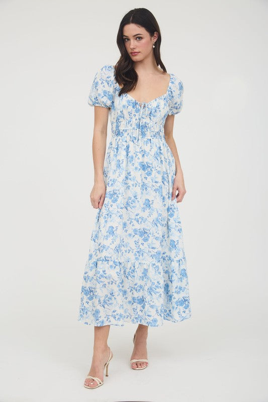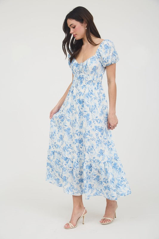 Soft and romantic, the Sky Petals Smocked Maxi Dress brings timeless charm to your wardrobe. This puff sleeve maxi dress features a light blue floral print on an ivory background, complete with a smocked bodice and dainty drawstring neckline. The tiered skirt adds flow and movement, making it perfect for bridal showers, garden parties, or afternoon strolls.