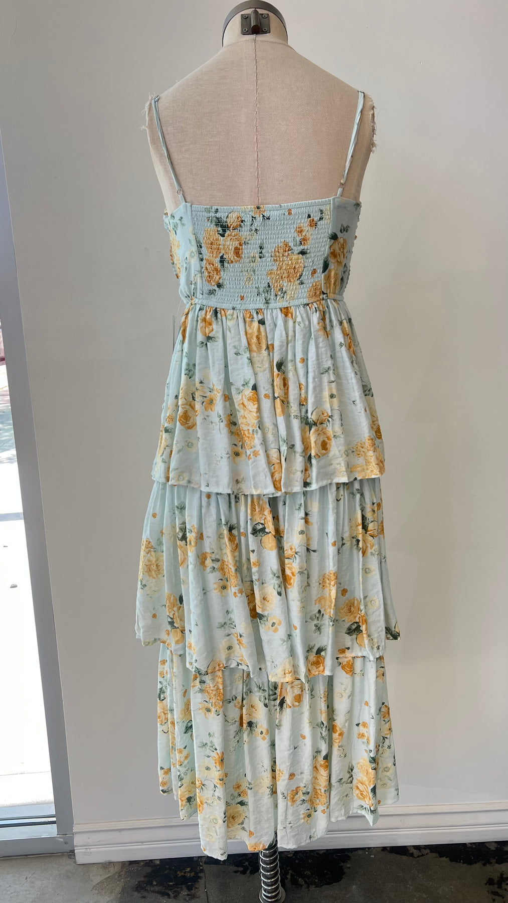 Turn heads in this dreamy floral maxi dress featuring soft yellow blooms on a pale blue backdrop. Designed with layered ruffle tiers and a standout pleated bow bodice, this dress combines elegance with playful charm. Adjustable spaghetti straps and a smocked back ensure a flattering, comfortable fit. Perfect for spring events, summer brunches, or garden parties.