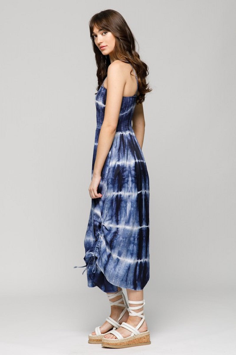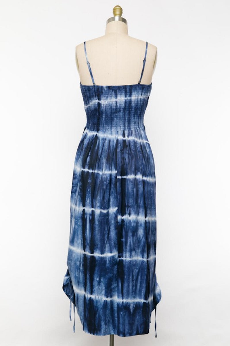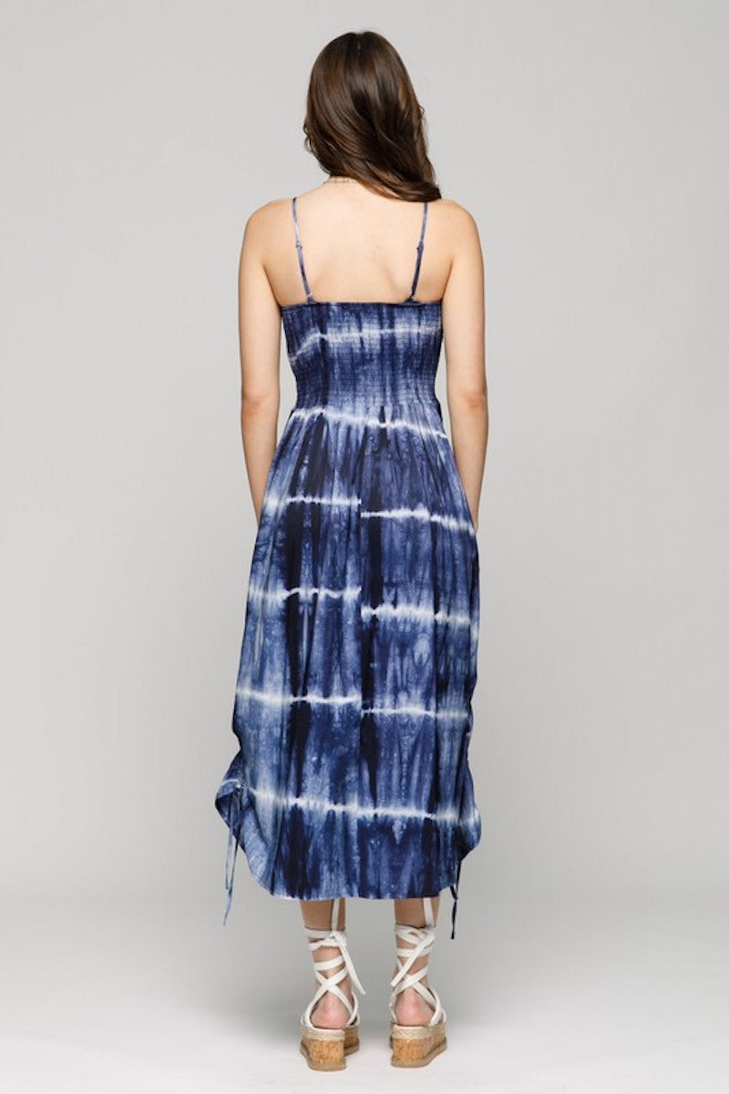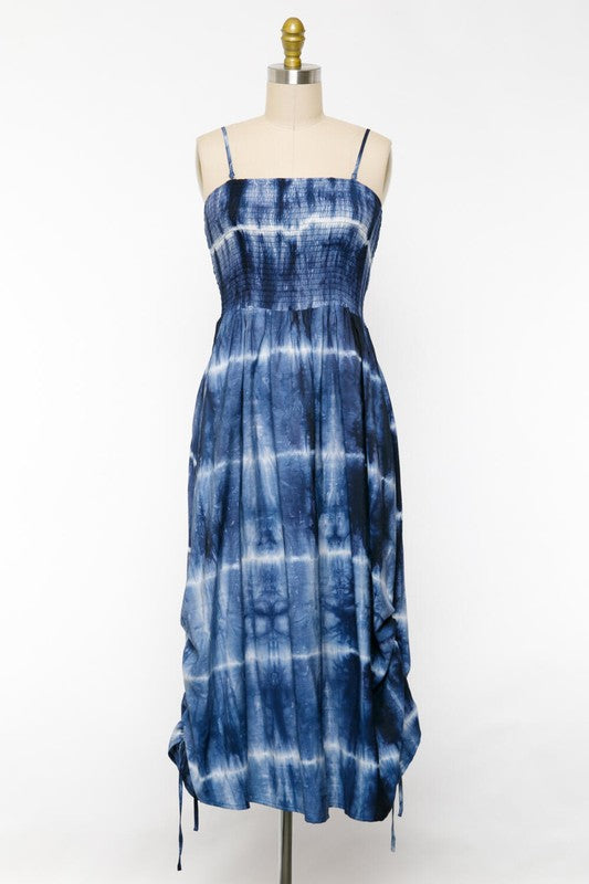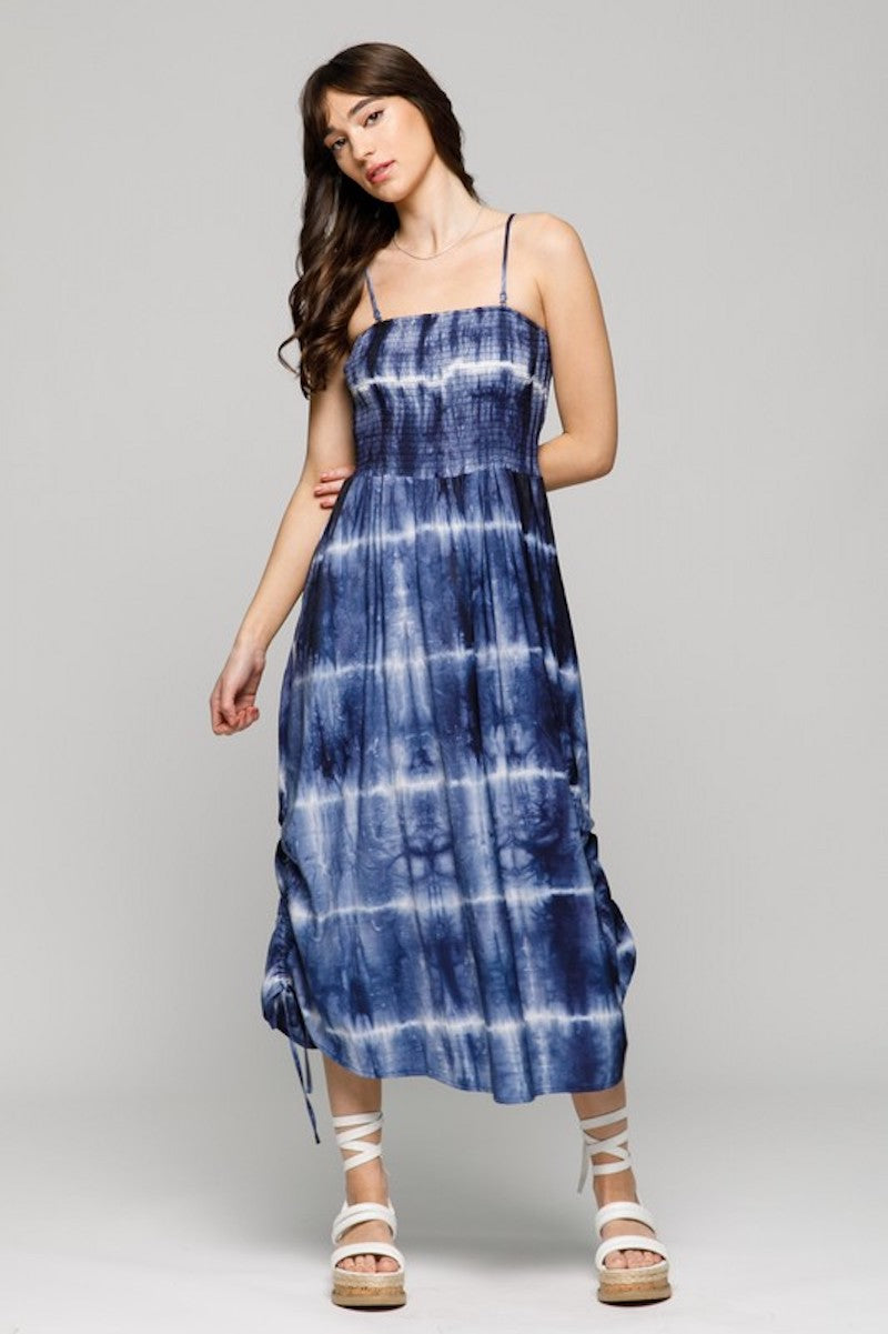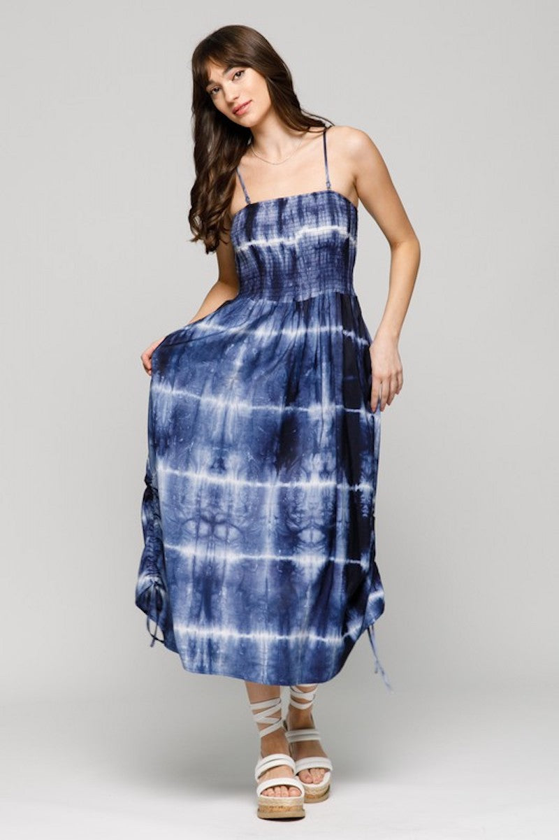Tina's Blue Tie dye Dress features a smocked stretchy top and straps to ensure a perfect fit. The bottom side shirring and scrunch tie detail provide a custom fit that will flatter all body types. Create a perfect length for you with this versatile dress.
