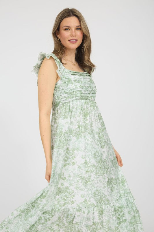 Breeze into spring with the Willow Green Floral Maxi Dress — a dreamy piece that effortlessly blends comfort and romance. Featuring a soft green floral toile print on a crisp white background, this dress is designed with delicate ruffle straps, a ruched bodice for a flattering fit, and a flowy, tiered silhouette that moves gracefully with you. Perfect for brunch dates, garden parties, or weekend getaways, this dress will have you feeling fresh and feminine all season long.