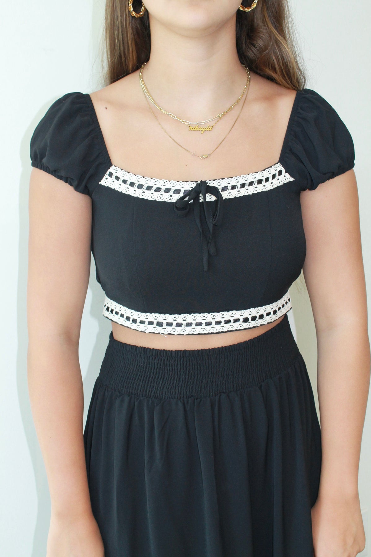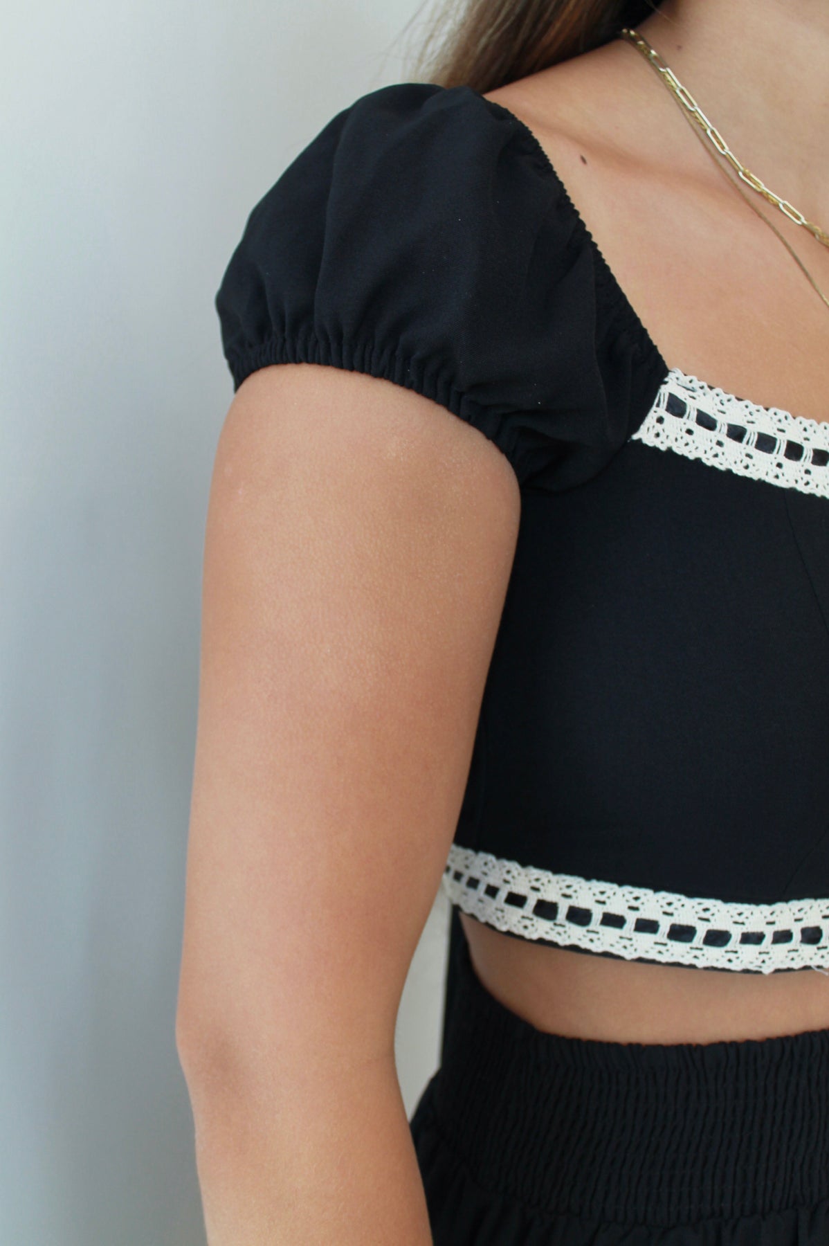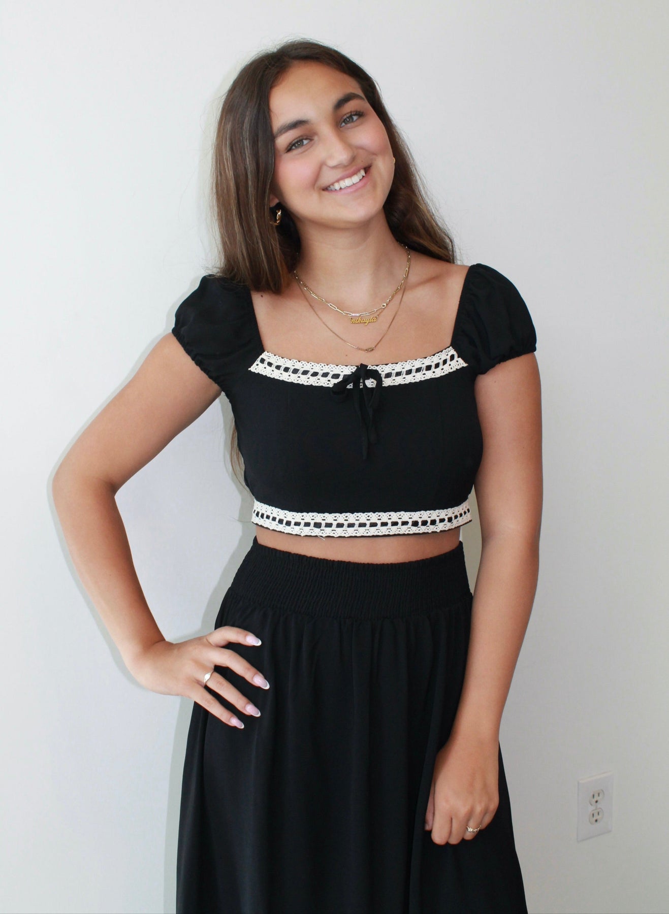 The Juliet's Detail Black Top is a romantic take on a classic cropped silhouette. Featuring soft puff sleeves, a flattering square neckline, and delicate ivory lace trim, this feminine top is perfect for everything from date nights to market strolls. The dainty bow front adds a sweet vintage charm, while the stretch-back design ensures a comfy, flattering fit. Pair it with our Juliet's Detail Black Skirt or high-rise jeans for a timeless look with a modern twist.