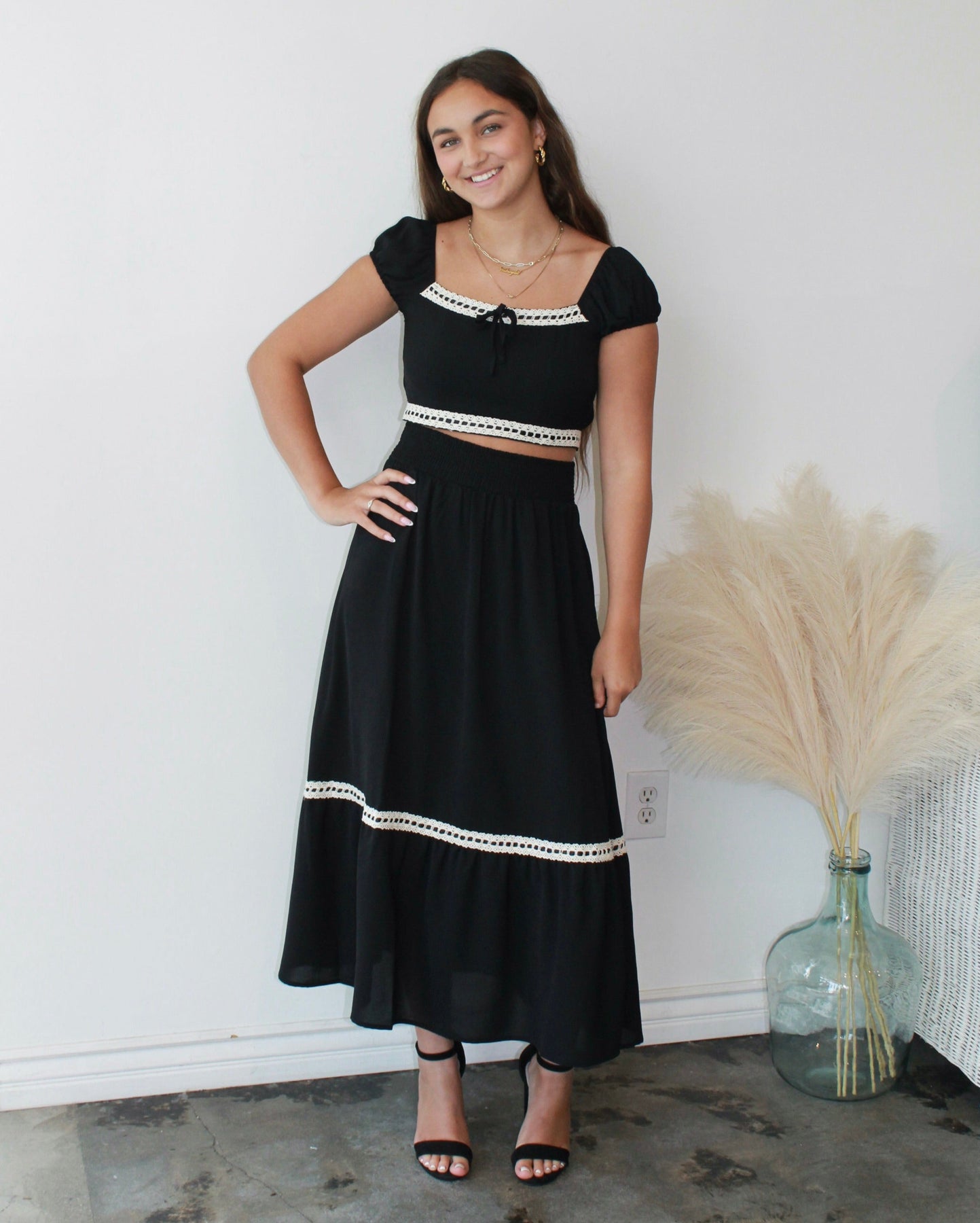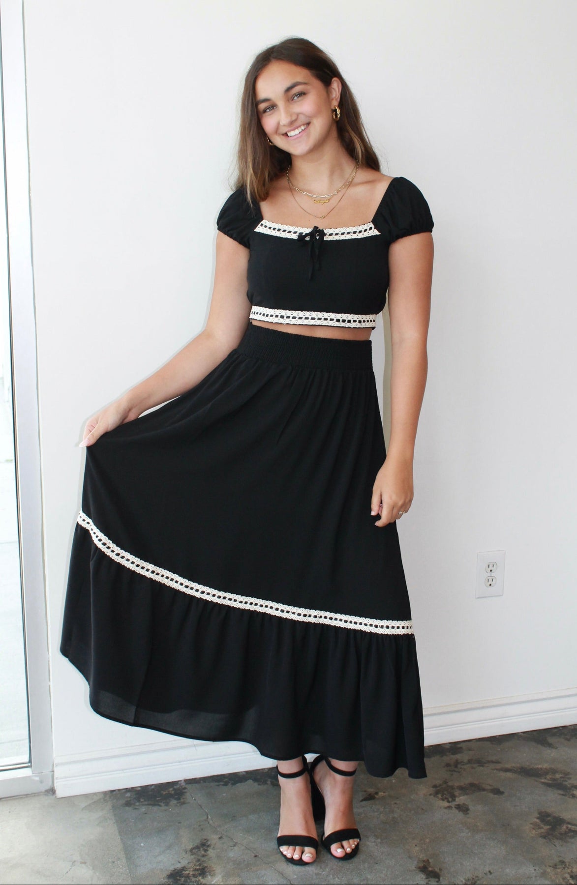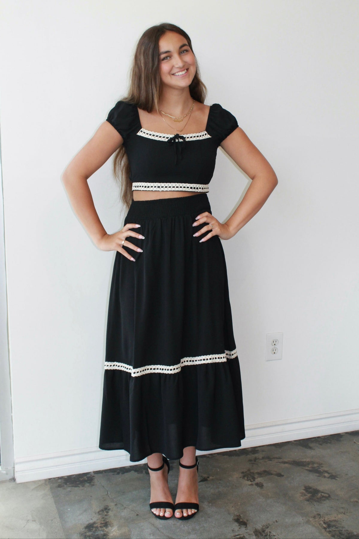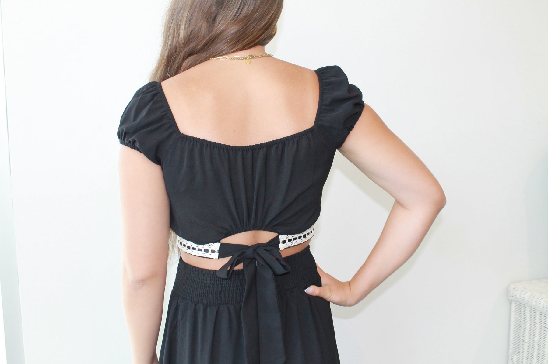 The Juliet's Detail Black Top is a romantic take on a classic cropped silhouette. Featuring soft puff sleeves, a flattering square neckline, and delicate ivory lace trim, this feminine top is perfect for everything from date nights to market strolls. The dainty bow front adds a sweet vintage charm, while the stretch-back design ensures a comfy, flattering fit. Pair it with our Juliet's Detail Black Skirt or high-rise jeans for a timeless look with a modern twist.