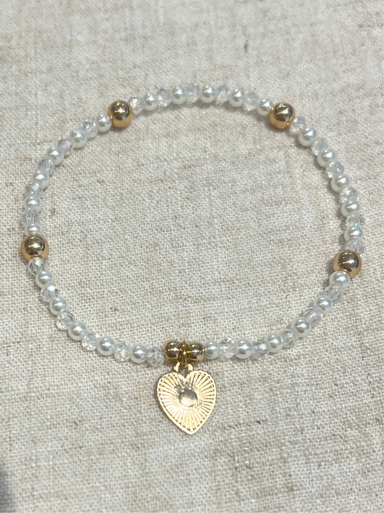 Elevate your everyday style with this delicate pearl bead bracelet accented by gleaming gold details and a dainty heart charm. Perfect for layering or wearing solo, this stretch bracelet adds a touch of elegance to any outfit. A timeless accessory for gifting or keeping.