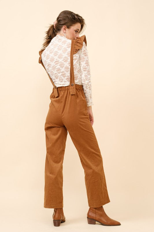 Step into effortless charm with our Autumn Ruffle Corduroy Overalls, the perfect blend of playful and chic. Crafted in a warm cinnamon-brown corduroy, these overalls feature statement ruffle straps, a flattering square neckline, and a relaxed straight-leg fit. The adjustable back straps and elastic waistband ensure all-day comfort, while side pockets add a practical touch. Pair it with a lace blouse or a simple tee to transition seamlessly from cozy afternoons to casual outings.