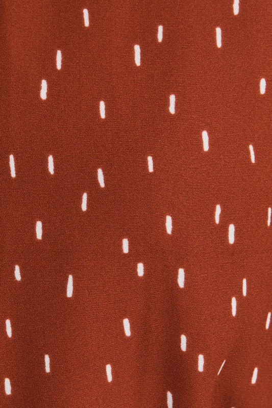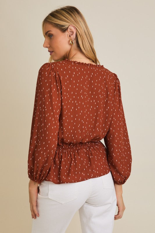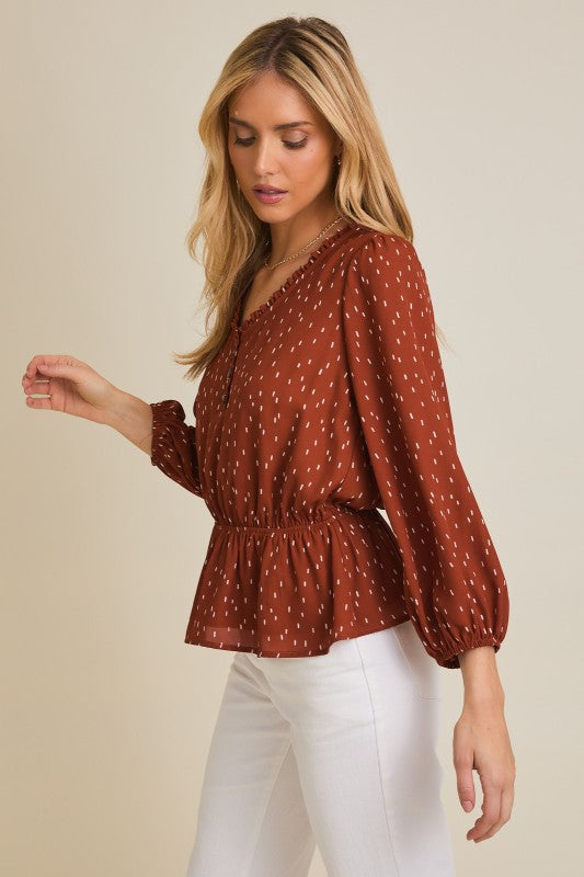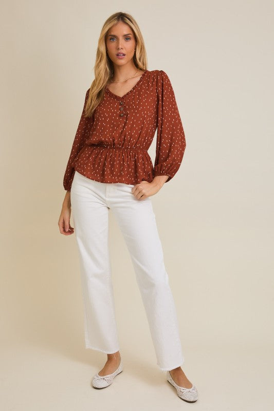 Add effortless charm to your wardrobe with our Auburn Dotted Peplum Blouse. Featuring a warm rust hue with subtle dotted print, a flattering elastic waist, and button-front detail, this feminine top pairs beautifully with denim or trousers for both casual days and dressier outings. Perfect for fall layering and year-round wear, it’s a versatile must-have for your boutique collection.