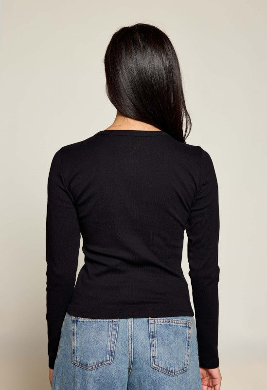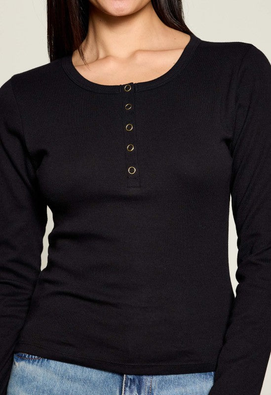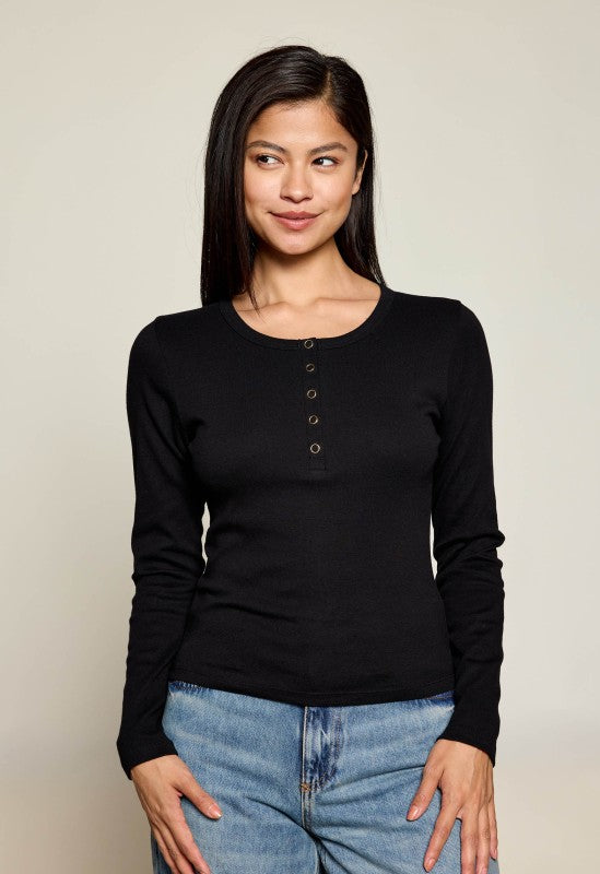 A timeless essential for every wardrobe, Hannah’s Black Long sleeve Top is designed with a flattering slim fit, round neckline, and button-front detail. Effortlessly versatile, it’s perfect for layering under jackets or pairing with denim and skirts for a classic, casual-chic look.