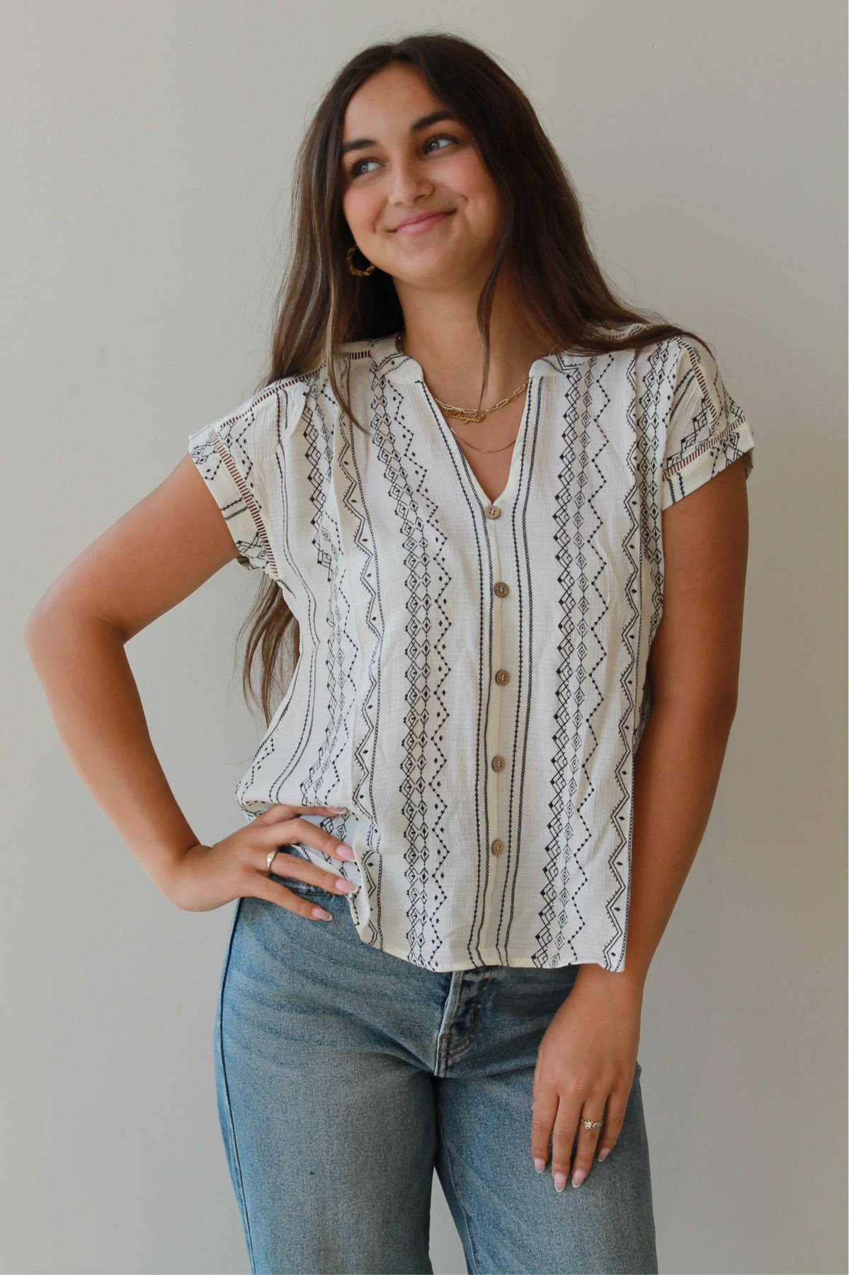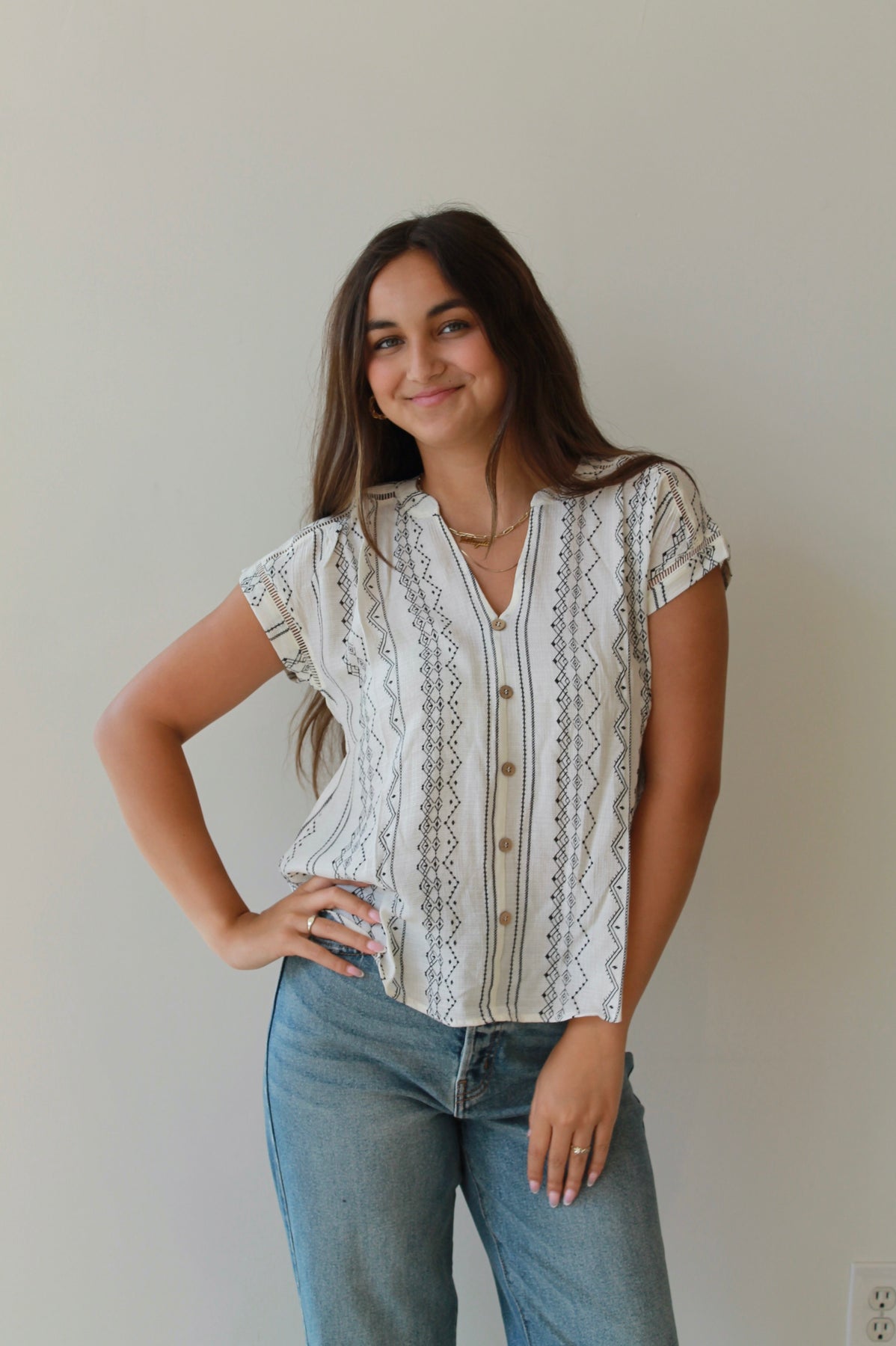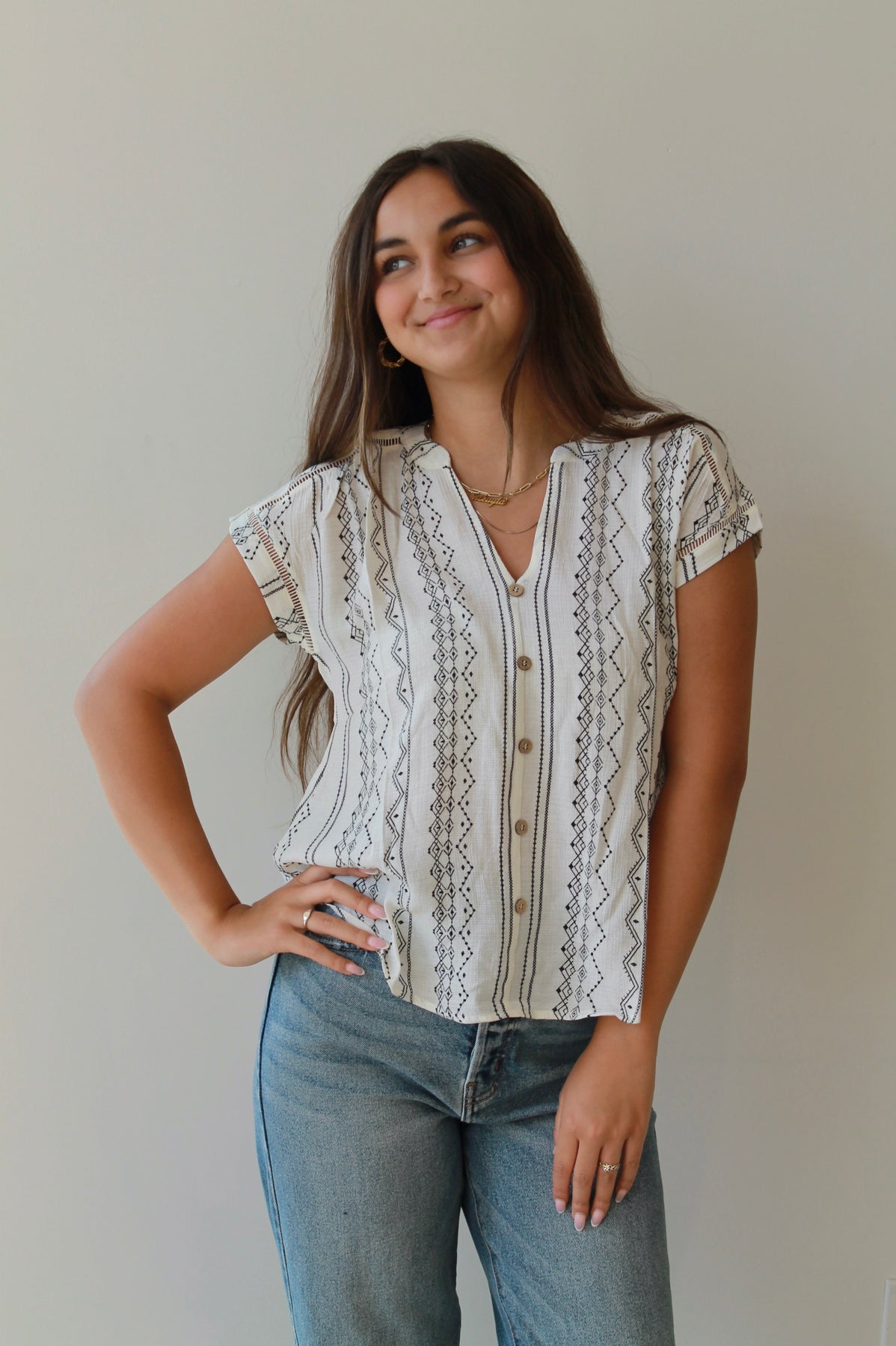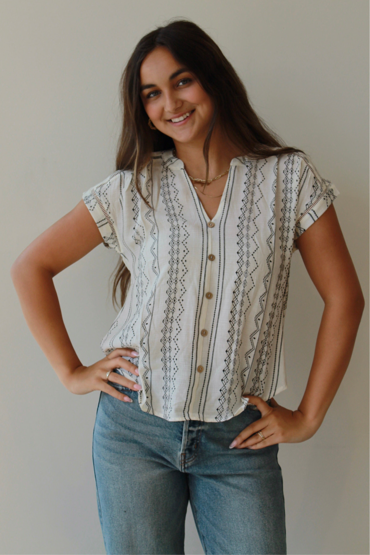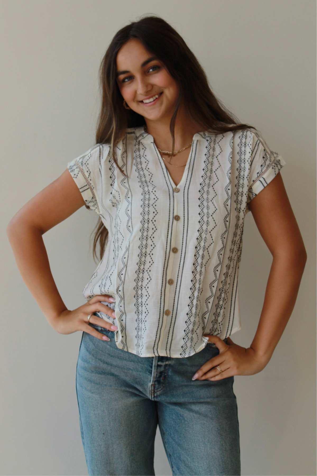 Elevate your everyday look with the Savannah Stitch Button-Down Top – a lightweight, breezy blouse featuring a timeless black geometric stripe design on soft ivory fabric. With its relaxed fit, cuffed short sleeves, and flattering V-neckline, this piece effortlessly combines comfort and casual elegance. The wooden-style buttons and subtle curved hem add a touch of boho charm, perfect for pairing with denim or linen shorts for a laid-back, polished outfit.