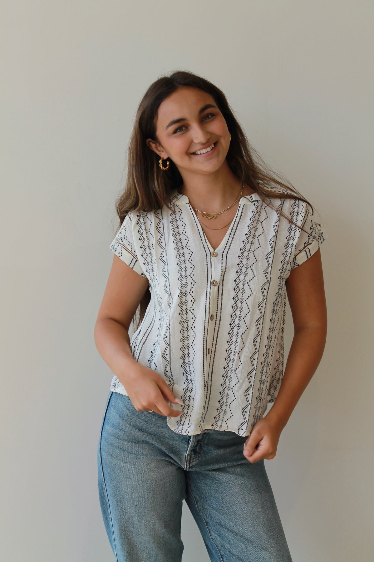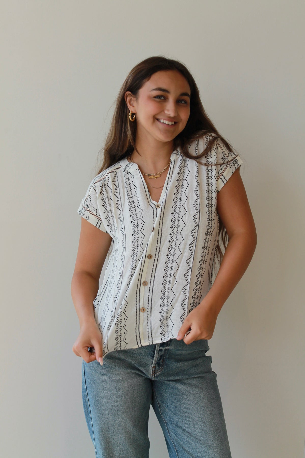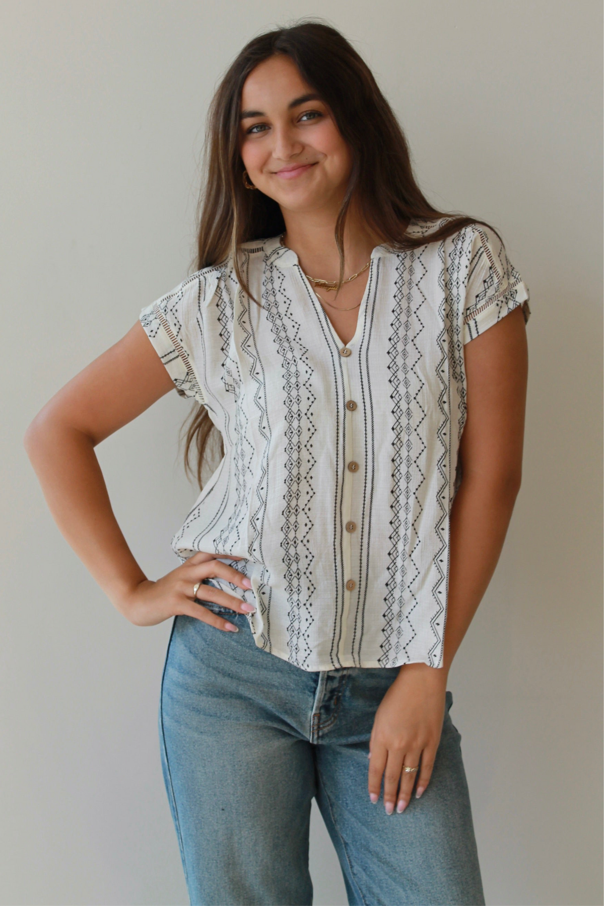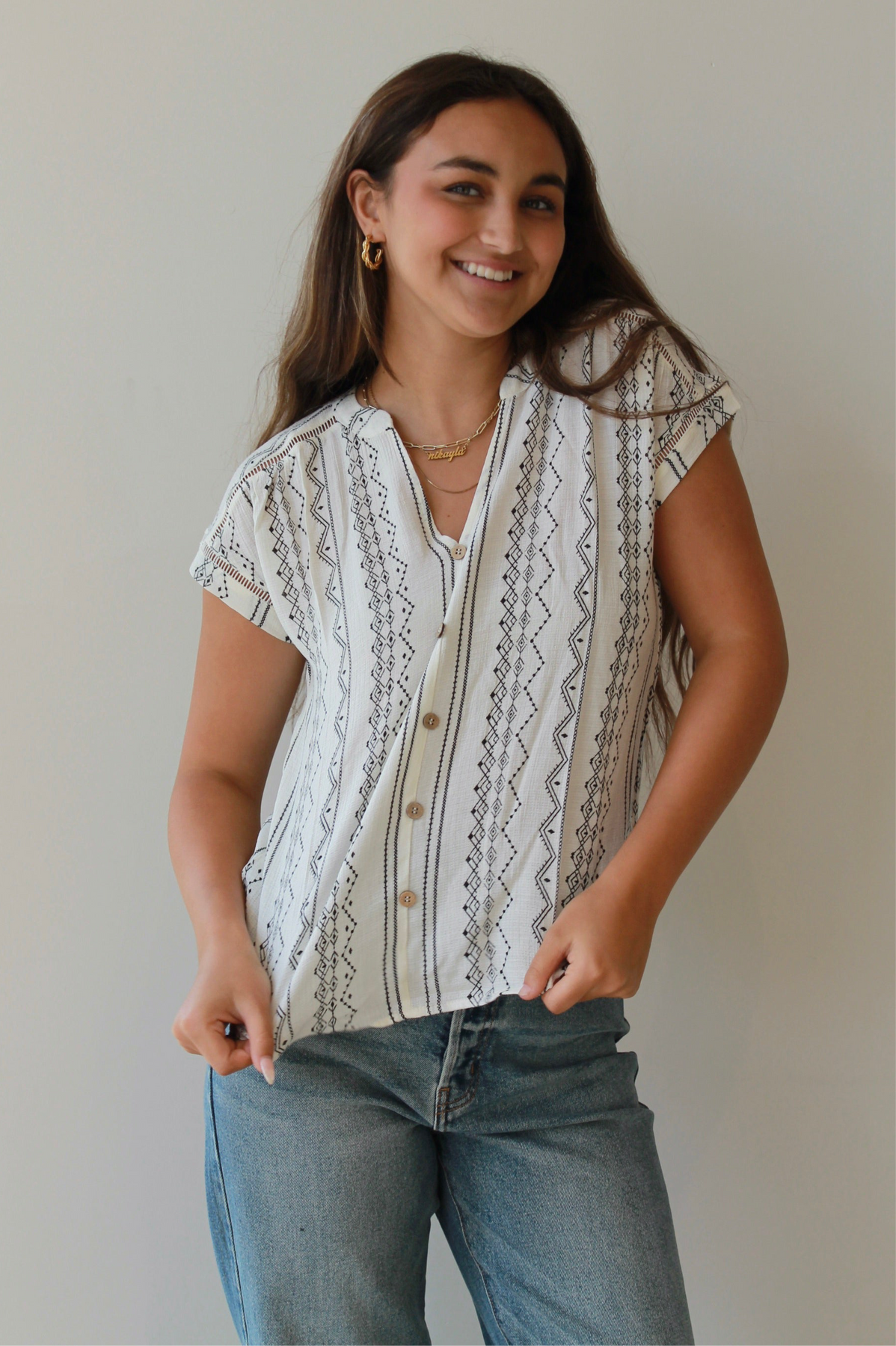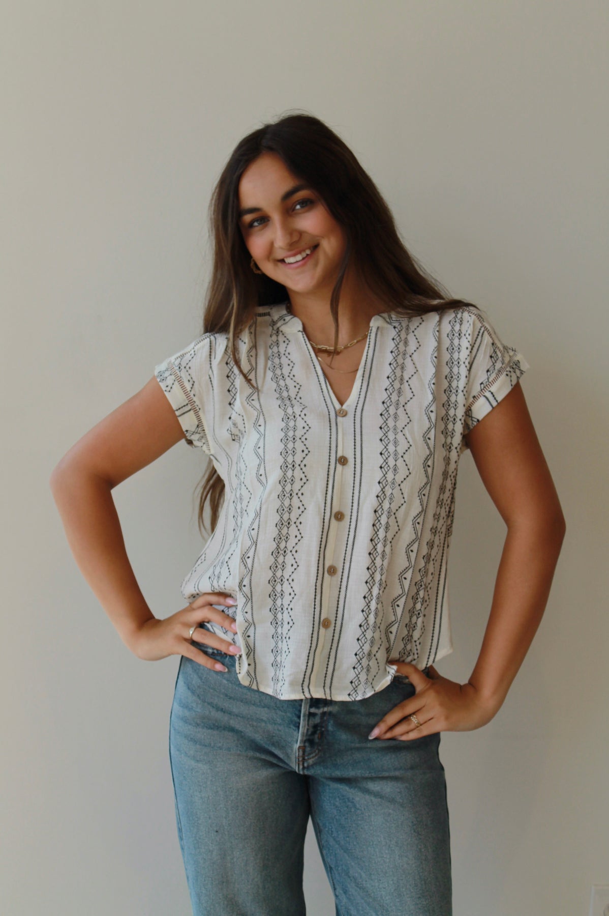 Elevate your everyday look with the Savannah Stitch Button-Down Top – a lightweight, breezy blouse featuring a timeless black geometric stripe design on soft ivory fabric. With its relaxed fit, cuffed short sleeves, and flattering V-neckline, this piece effortlessly combines comfort and casual elegance. The wooden-style buttons and subtle curved hem add a touch of boho charm, perfect for pairing with denim or linen shorts for a laid-back, polished outfit.
