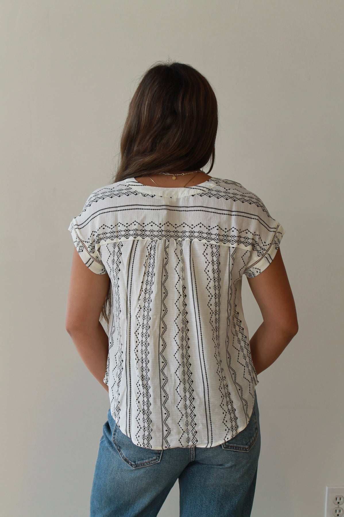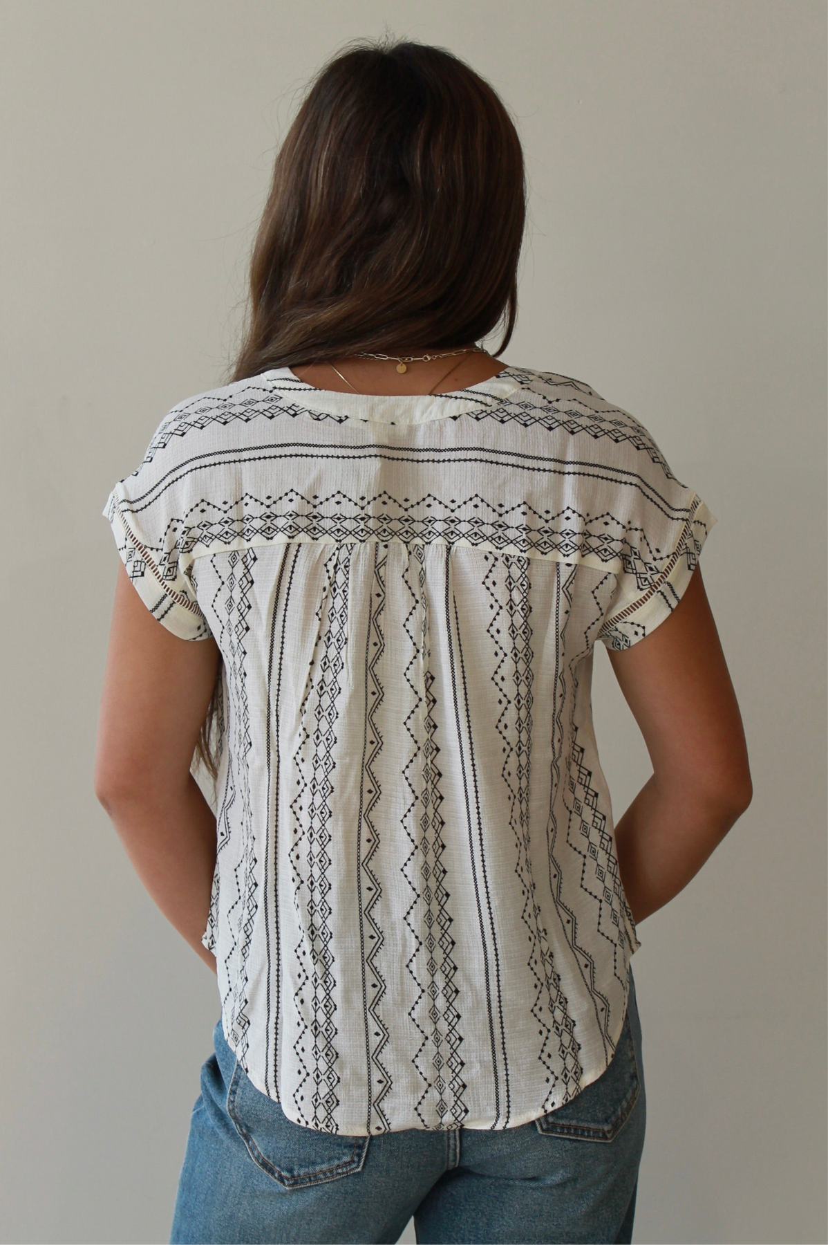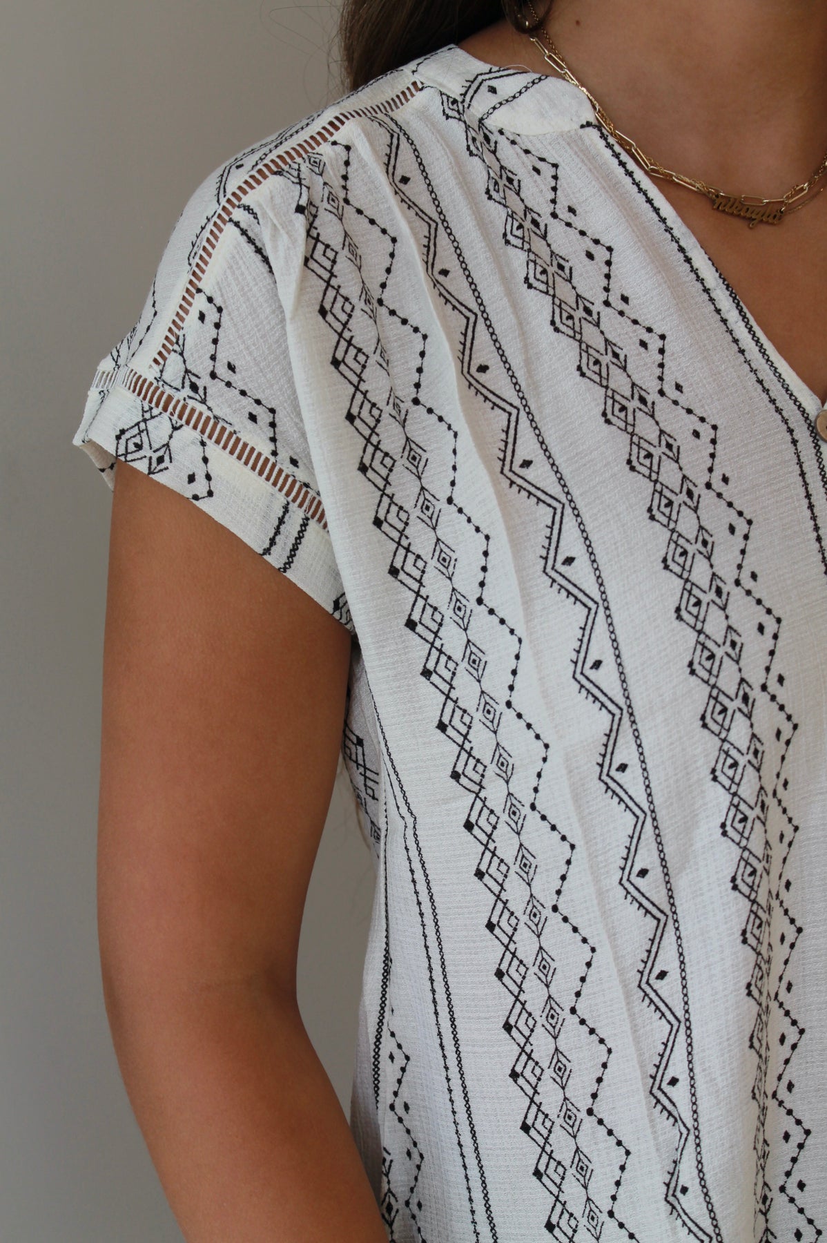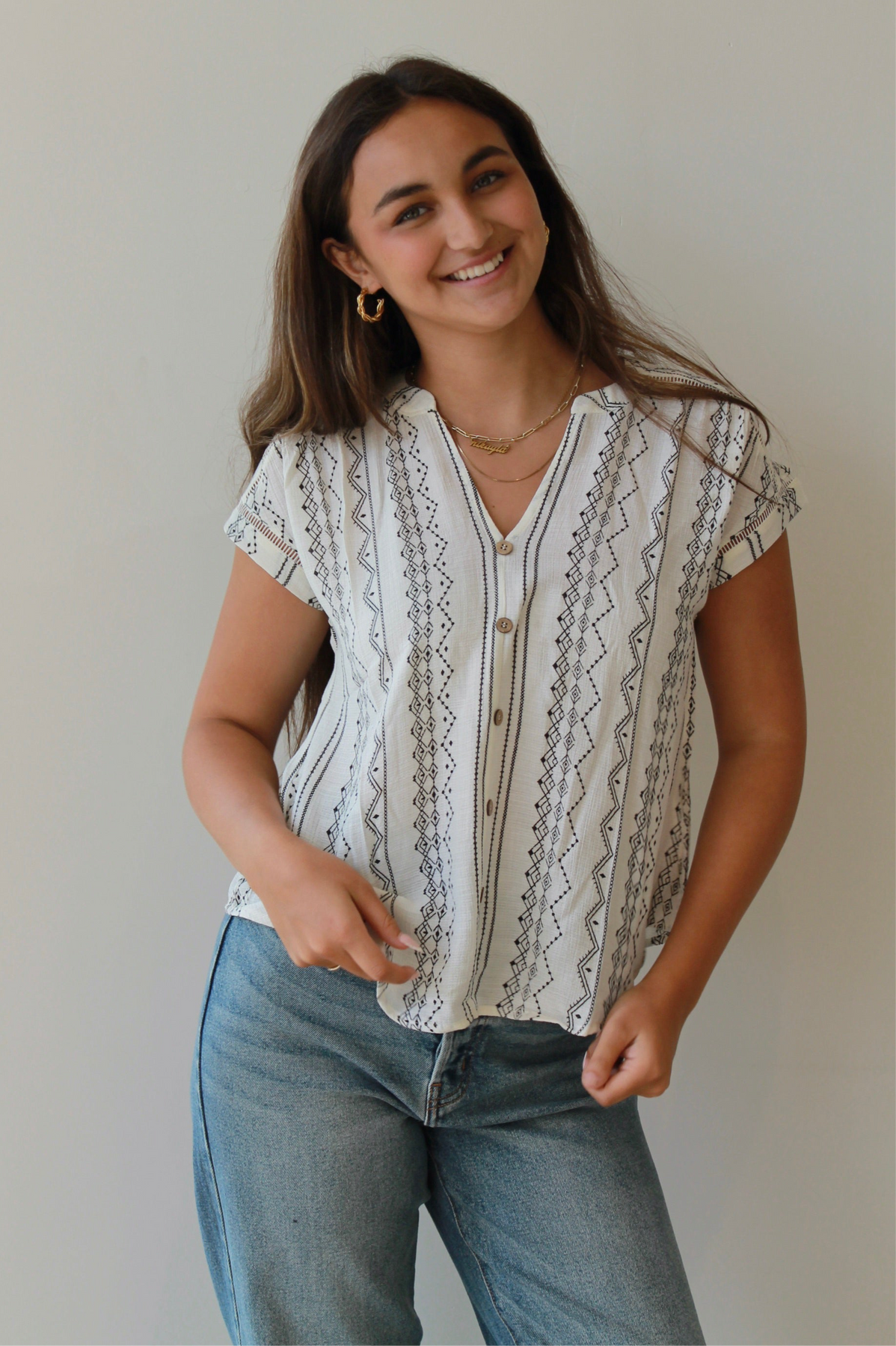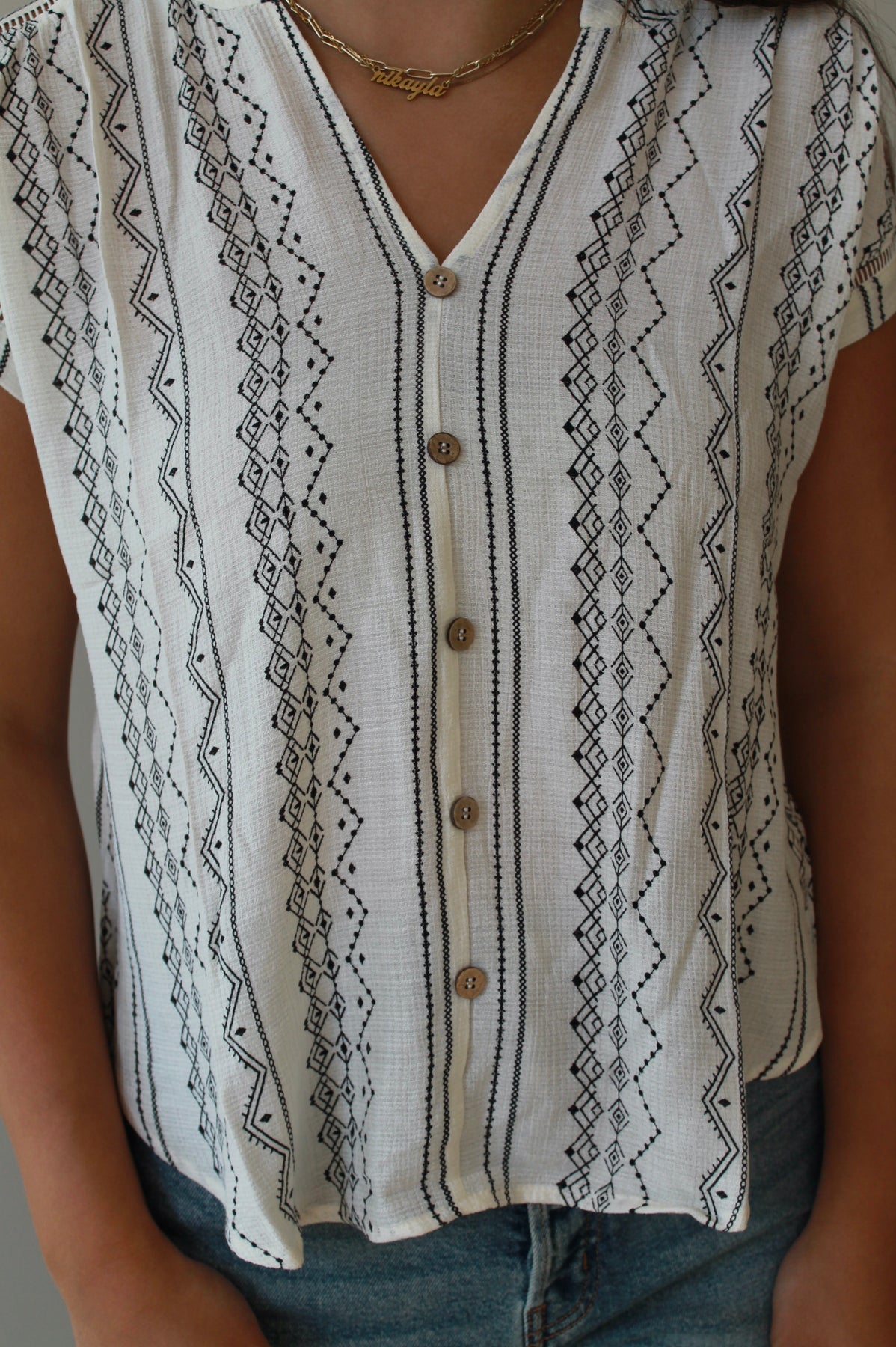 Elevate your everyday look with the Savannah Stitch Button-Down Top – a lightweight, breezy blouse featuring a timeless black geometric stripe design on soft ivory fabric. With its relaxed fit, cuffed short sleeves, and flattering V-neckline, this piece effortlessly combines comfort and casual elegance. The wooden-style buttons and subtle curved hem add a touch of boho charm, perfect for pairing with denim or linen shorts for a laid-back, polished outfit.