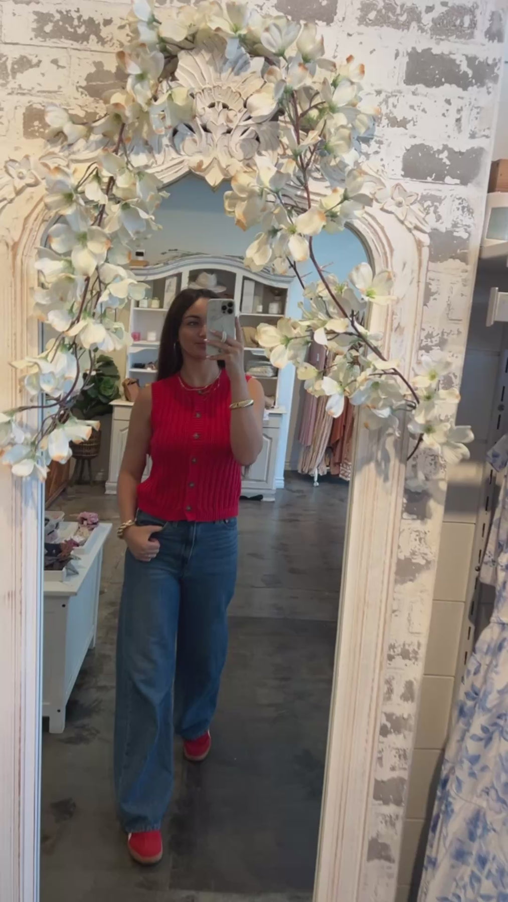 Add a vibrant pop to your wardrobe with our Cherry Red Button-Up Knit Tank. This bold, sleeveless knit top features an eye-catching cherry red hue with a breathable pointelle texture. Designed with ribbed edges and a full button-down front, it pairs effortlessly with your favorite denim for a cute and casual look. Whether worn on its own or layered under a blazer, this top brings charm and versatility to any outfit.