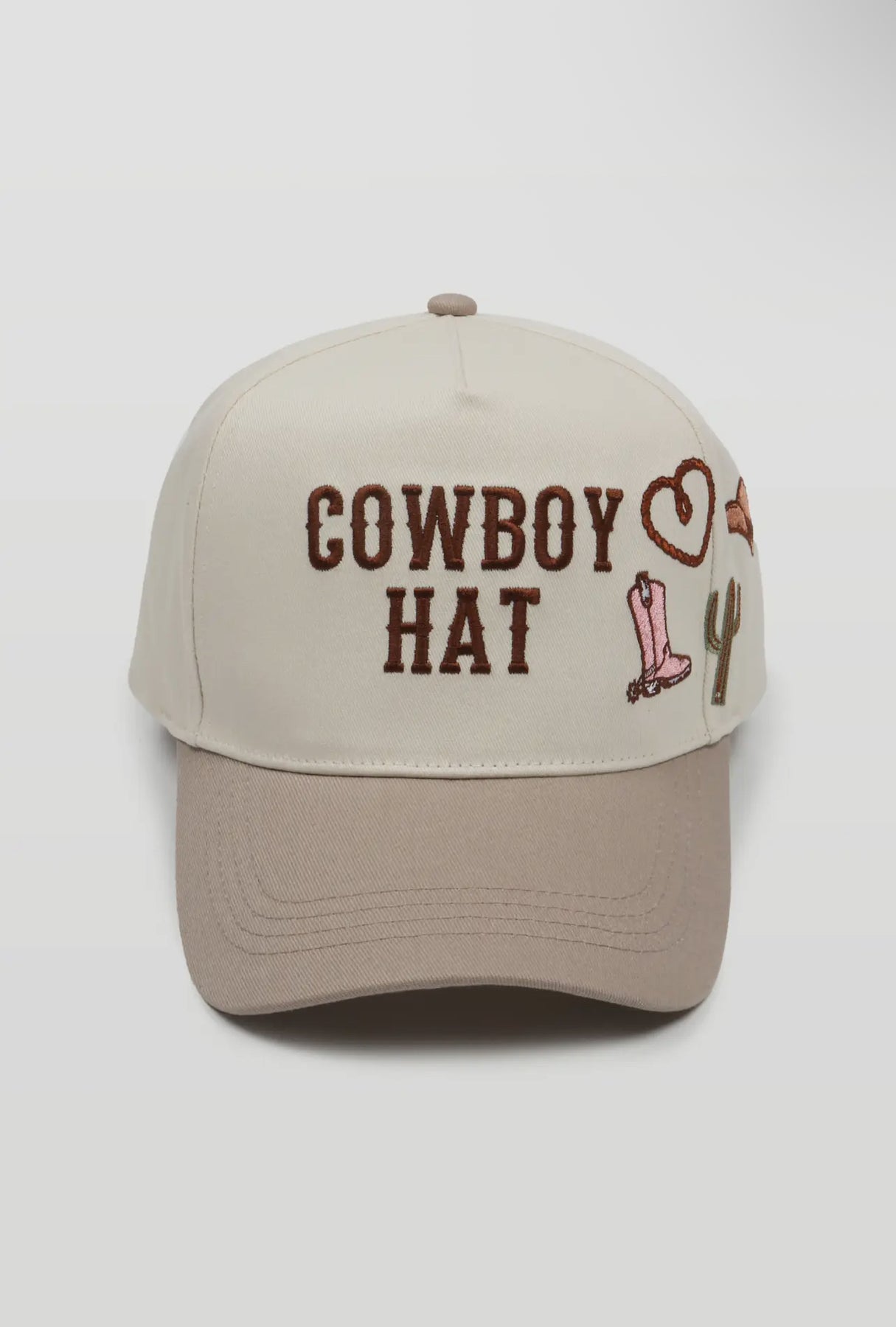 Add a playful western touch to your everyday look with the Cowboy Embroidered hat. Designed in a soft neutral tone, this cap features charming cowboy-inspired embroidery including boots, a cactus, and heart details for a fun, feminine vibe. The structured fit and adjustable back make it easy to wear all day—perfect for casual outfits, errands, or weekend adventures. Style it with denim, dresses, or your favorite cozy layers for effortless western flair.