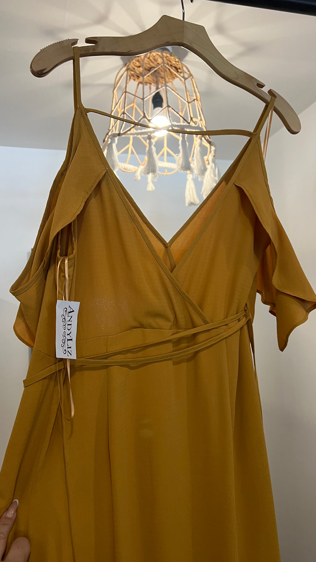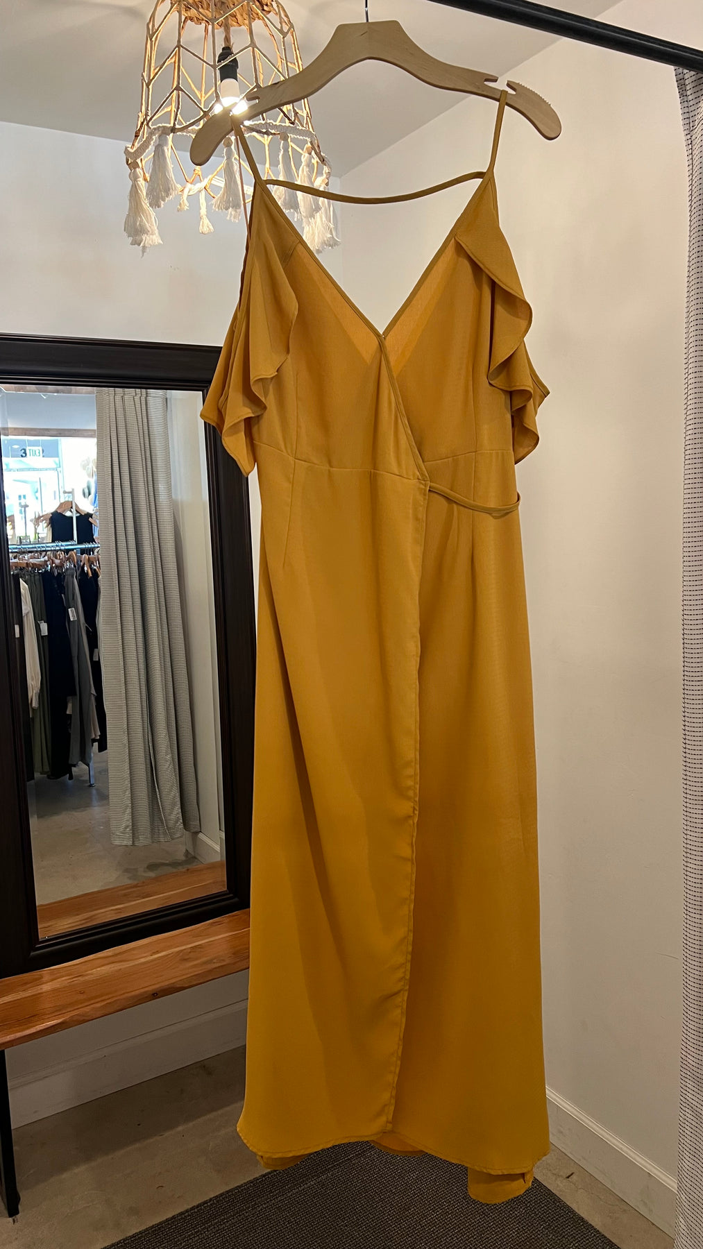 Solid mustard maxi with cold shoulder and wrap style tie.
